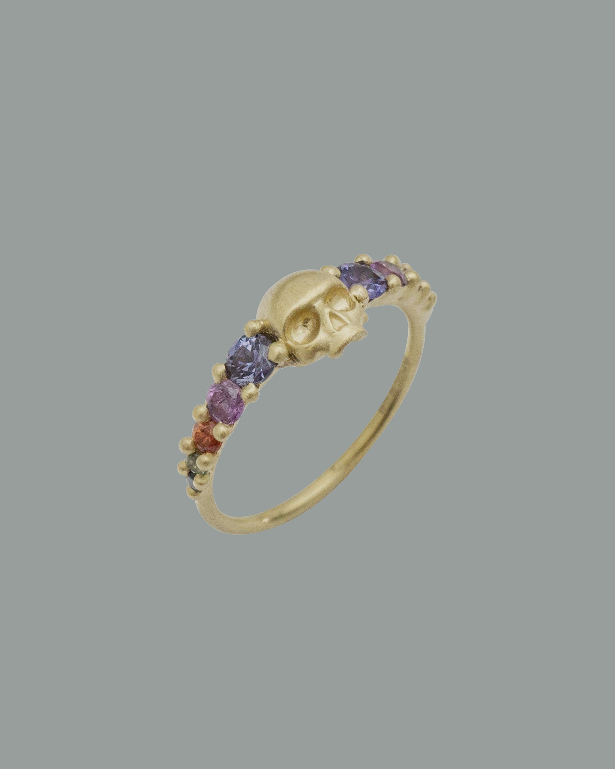 小さなスカルモチーフに、ブルーやピンク、グリーンなど多彩なサファイアをグラデーションであしらい、18Kリサイクルイエローゴールドのバンドに仕立てています。計算では生まれない偶然の美しさを引き出す独自の技法「Cast-not-Set (キャスト・ノット・セット)」によって一点一点表情が異なり、身につける人の個性や物語を映し出すリングです。