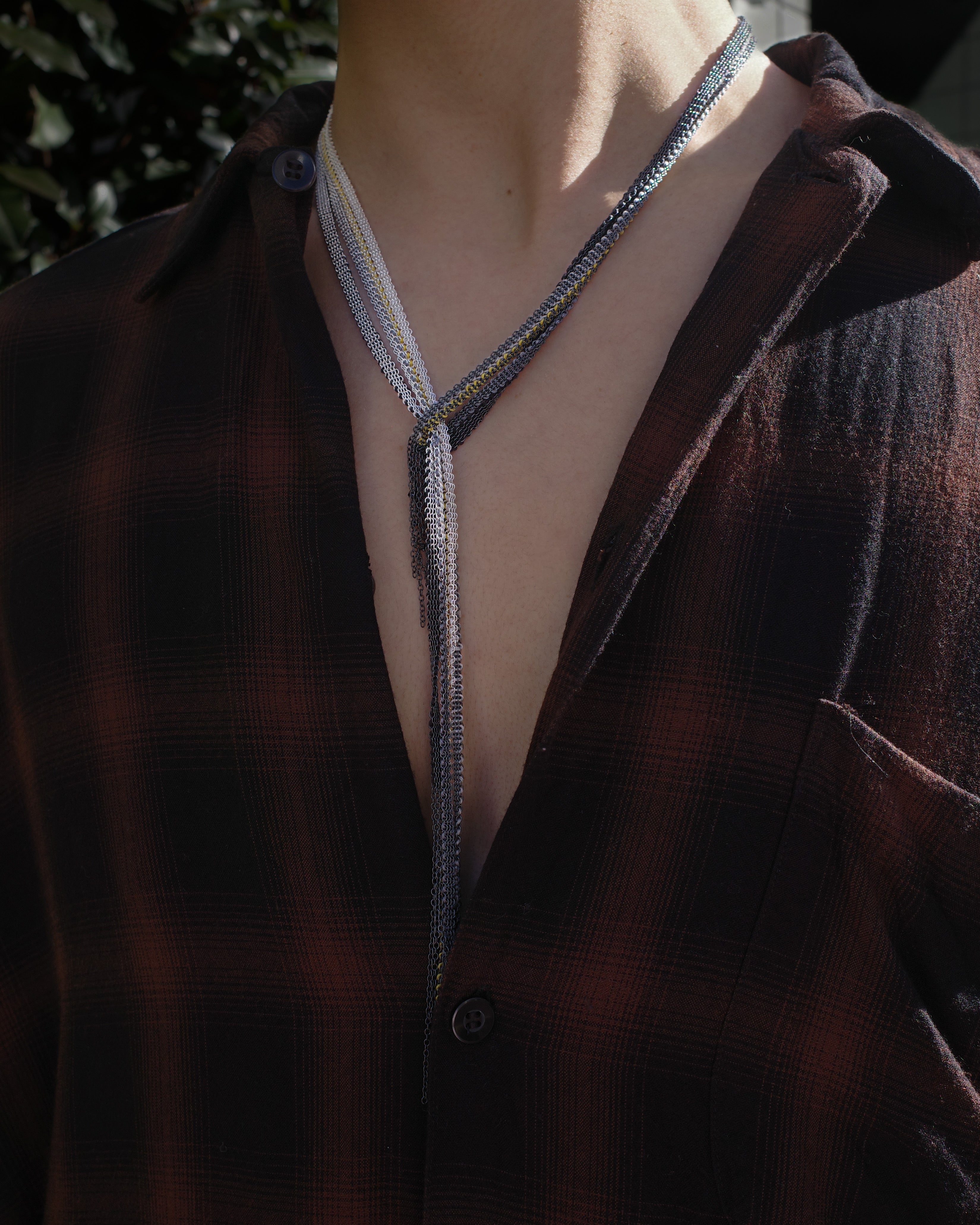 伝統的な手工芸の技法で丁寧に手織りされた帯状のネックレスは、幾重にも重なりながら軽やかな動きと立体感を生み出しています。ゴールドのラインが効いた、シルバーからブラックへと移ろうグラデーションが、首元に奥行きのある輝きを添えます。
