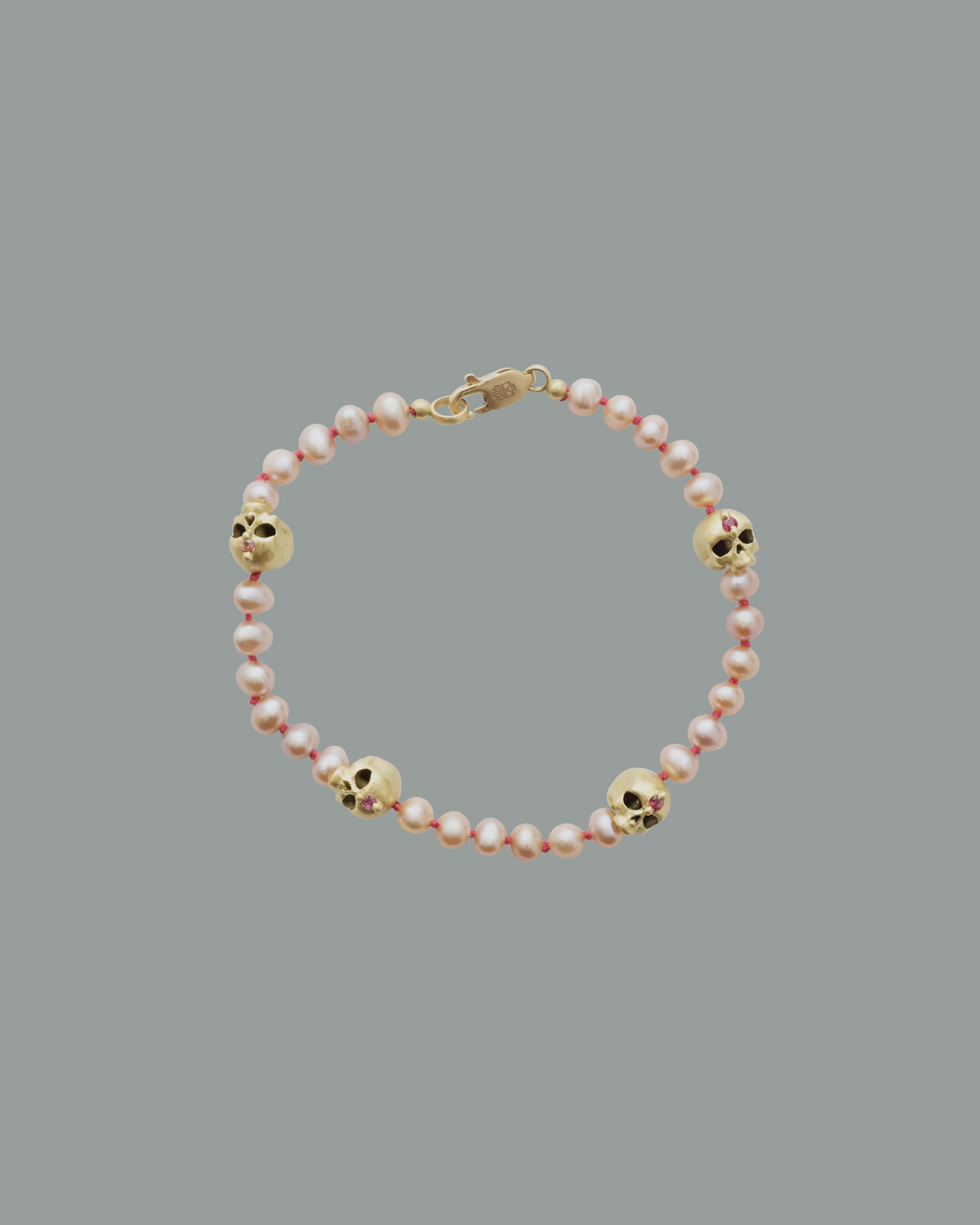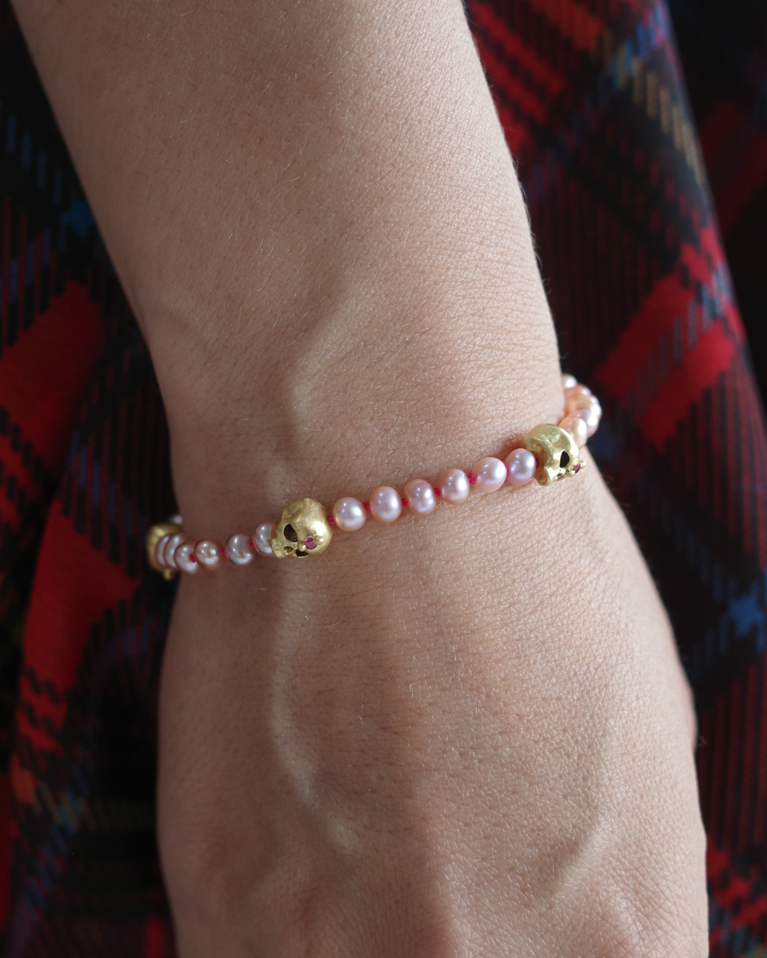 その遊び心と反骨精神を映し出した、彼女らしいデザインのブレスレットです。ピンクの糸に3.5mmのピンクシードパールを連ね、額に第三の目のようなピンクサファイアをあしらった18Kリサイクルゴールドのスカルモチーフを組み合わせました。
