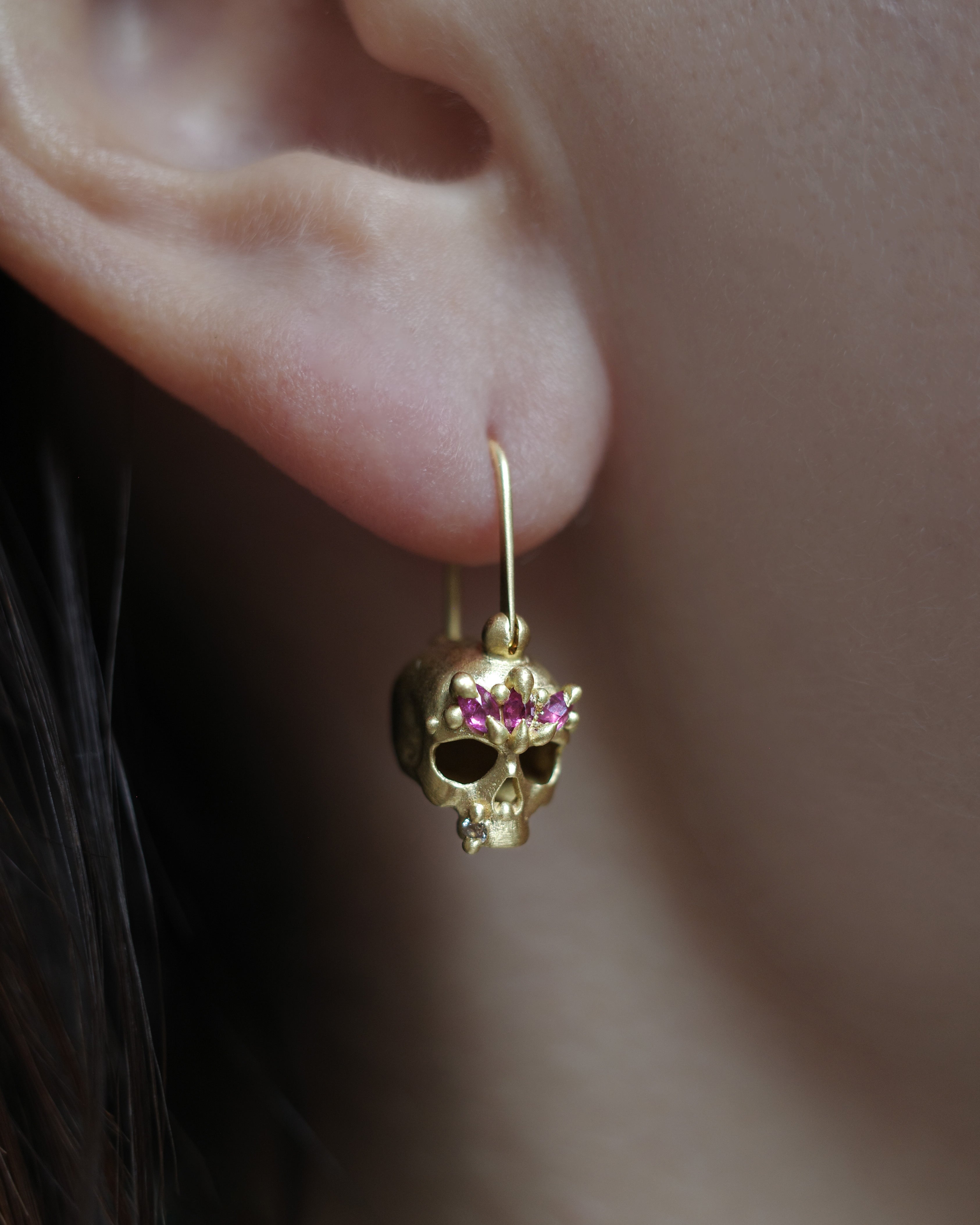 梅の花を思わせる彩のスカルモチーフを安全ピンの形に落とし込み、18Kリサイクルイエローゴールドにサファイアやホワイトダイヤモンドをあしらったピアスは、彼女の反骨精神と遊び心を体現しています。Cast-Not-Set(キャスト・ノット・セット)技法により一点一点異なる表情を持ち、耳元に神秘と祝祭的な輝きを添えます。