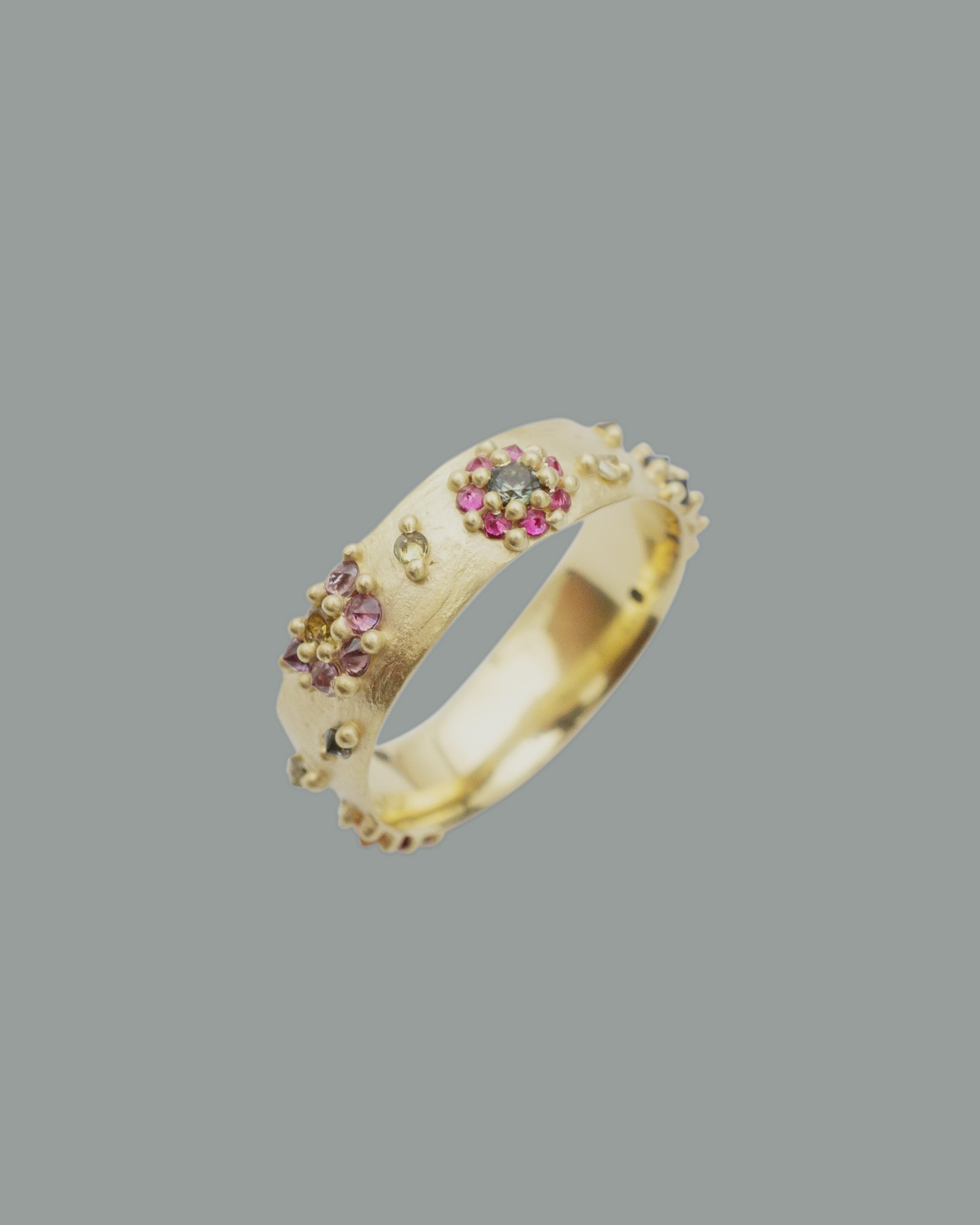 18Kリサイクルイエローゴールドのワイドバンドに、虹色のサファイアを「Cast-Not-Set(キャスト・ノット・セット)」技法で浮かぶ花のようにあしらった、幻想的なリングです。指先に穏やかなきらめきを添え、身につける人の個性と物語をそっと映し出す一本です。