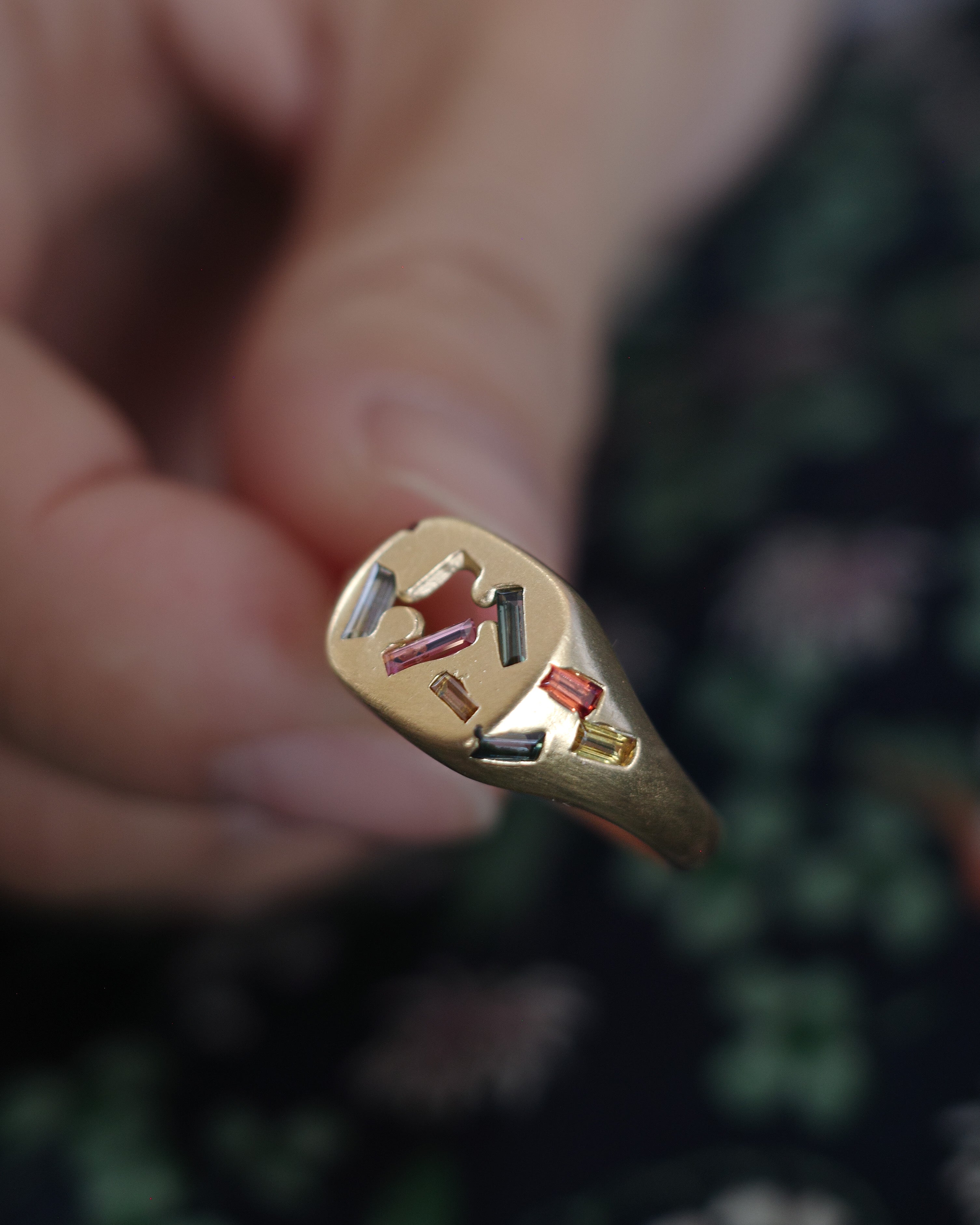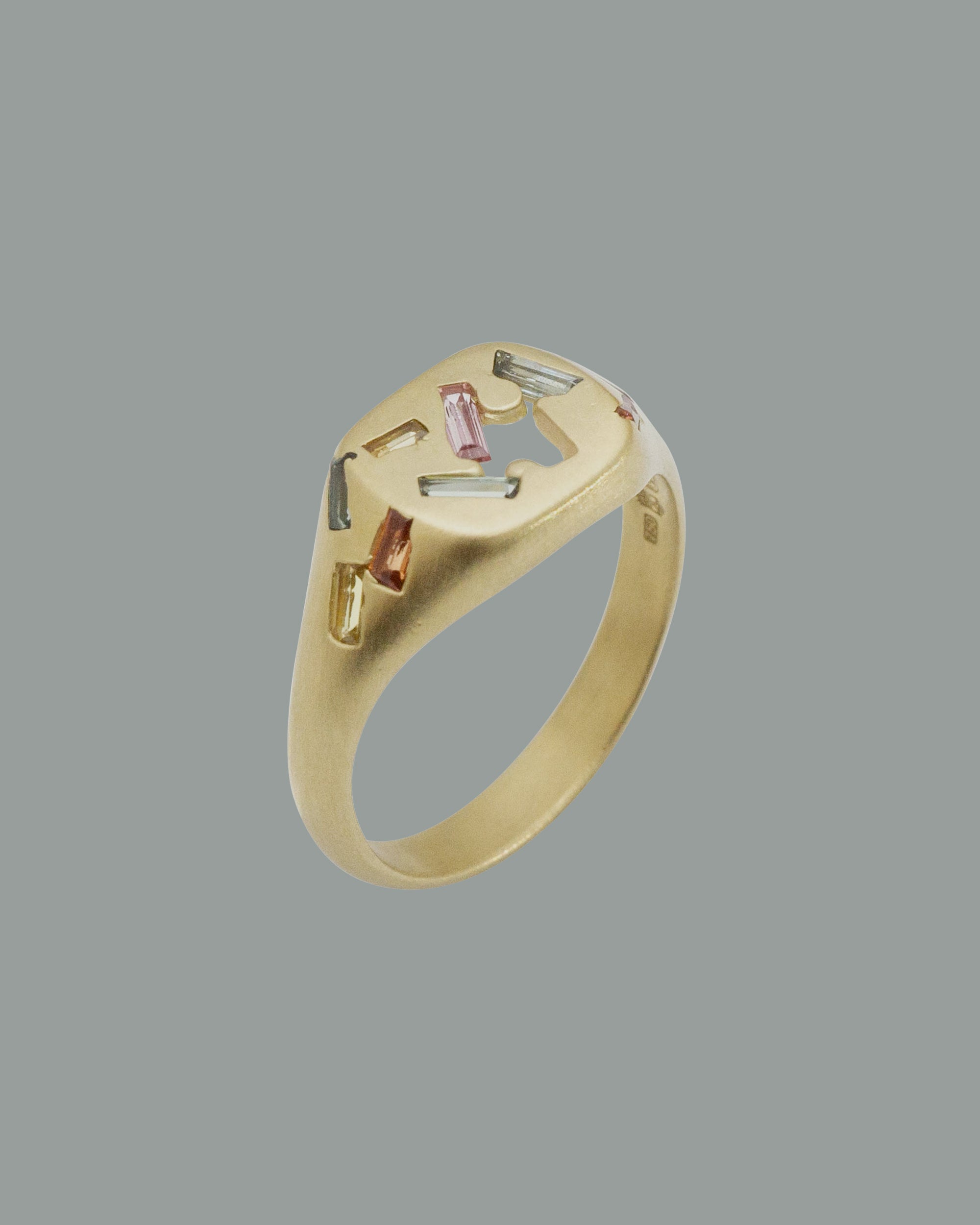 18Kリサイクルイエローゴールドのスクエア型シグネットに、レインボーカラーのバゲットサファイアを独自の「Cast-not-Set(キャスト・ノット・セット)」技法で直接鋳込み、石ごとに異なる見え方や表情を持たせています。
