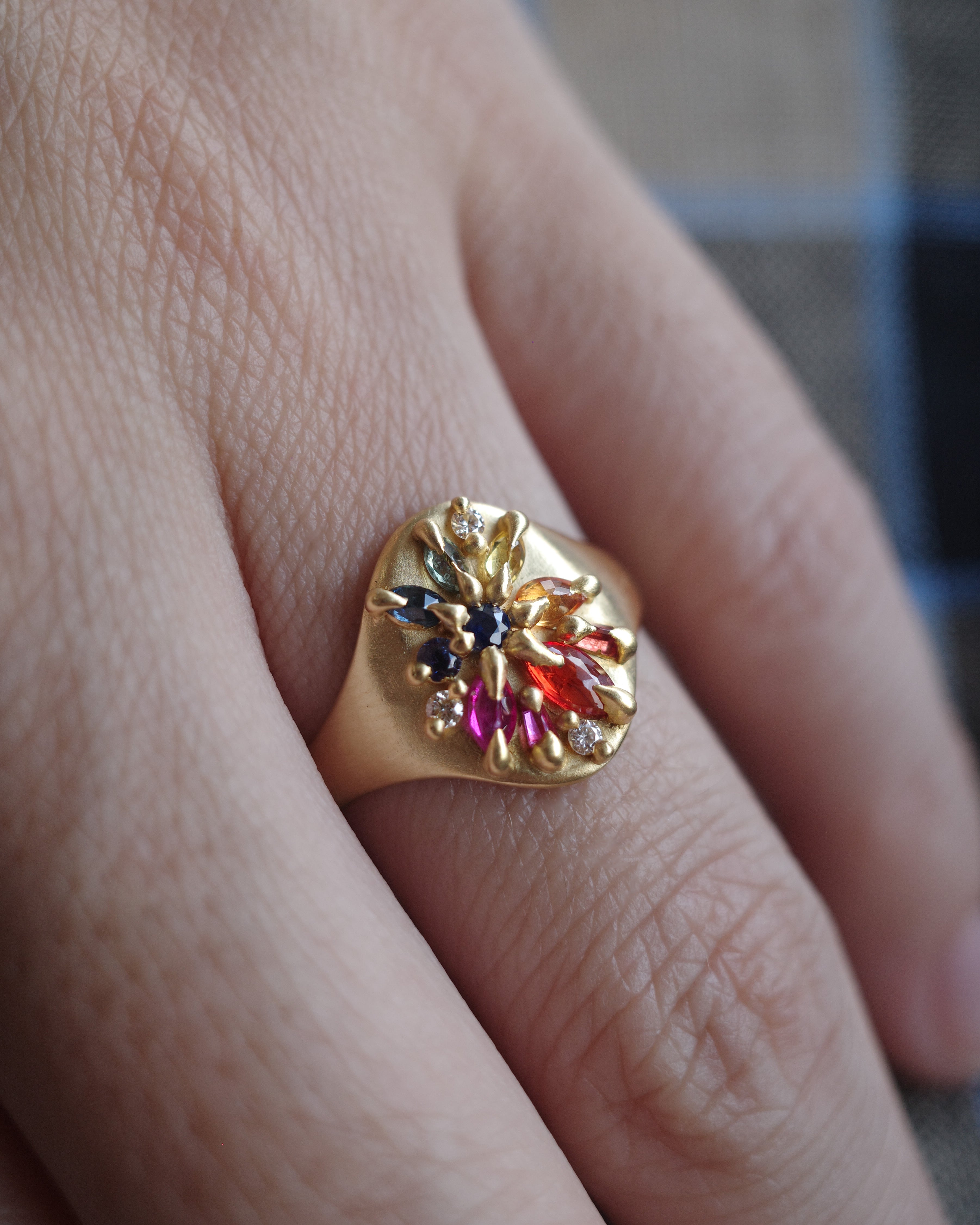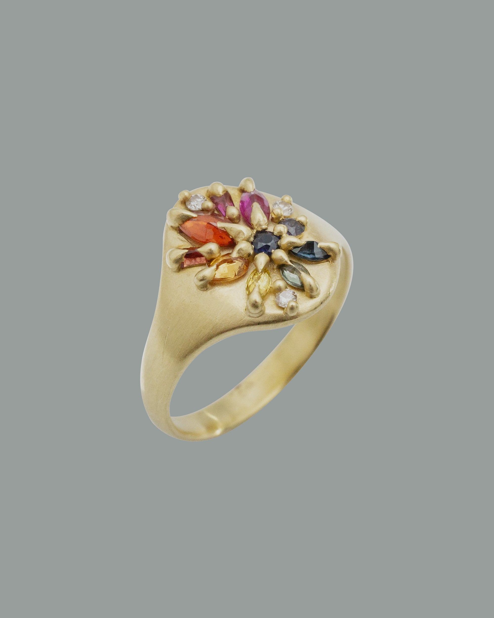 90年代イギリスのカウンターカルチャーから受けた影響を背景に、自由で祝祭的なポリー・ウェールズの美意識を凝縮したシグネットリング。