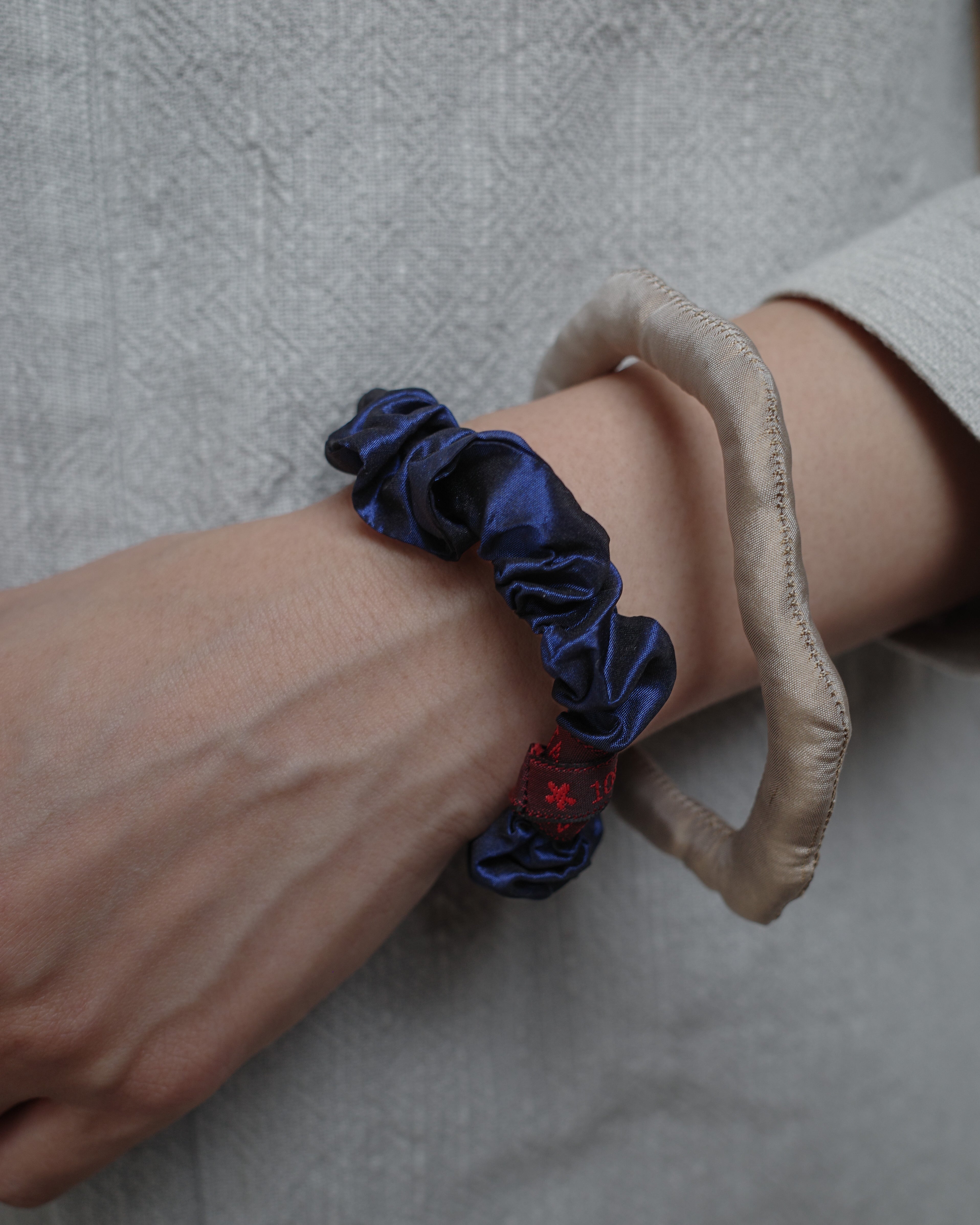 ファッションブランドならではの視点でデザインされたシルクのピースは、ブレスレットとしてもシュシュとしても使用できます。簡潔な構造の中に柔らかな膨らみと有機的なフォルムを備え、チャイナブルーの奥行きある色調が、霧の向こうに広がる空気のような静けさをまとい、装いに凛とした存在感を与えます。