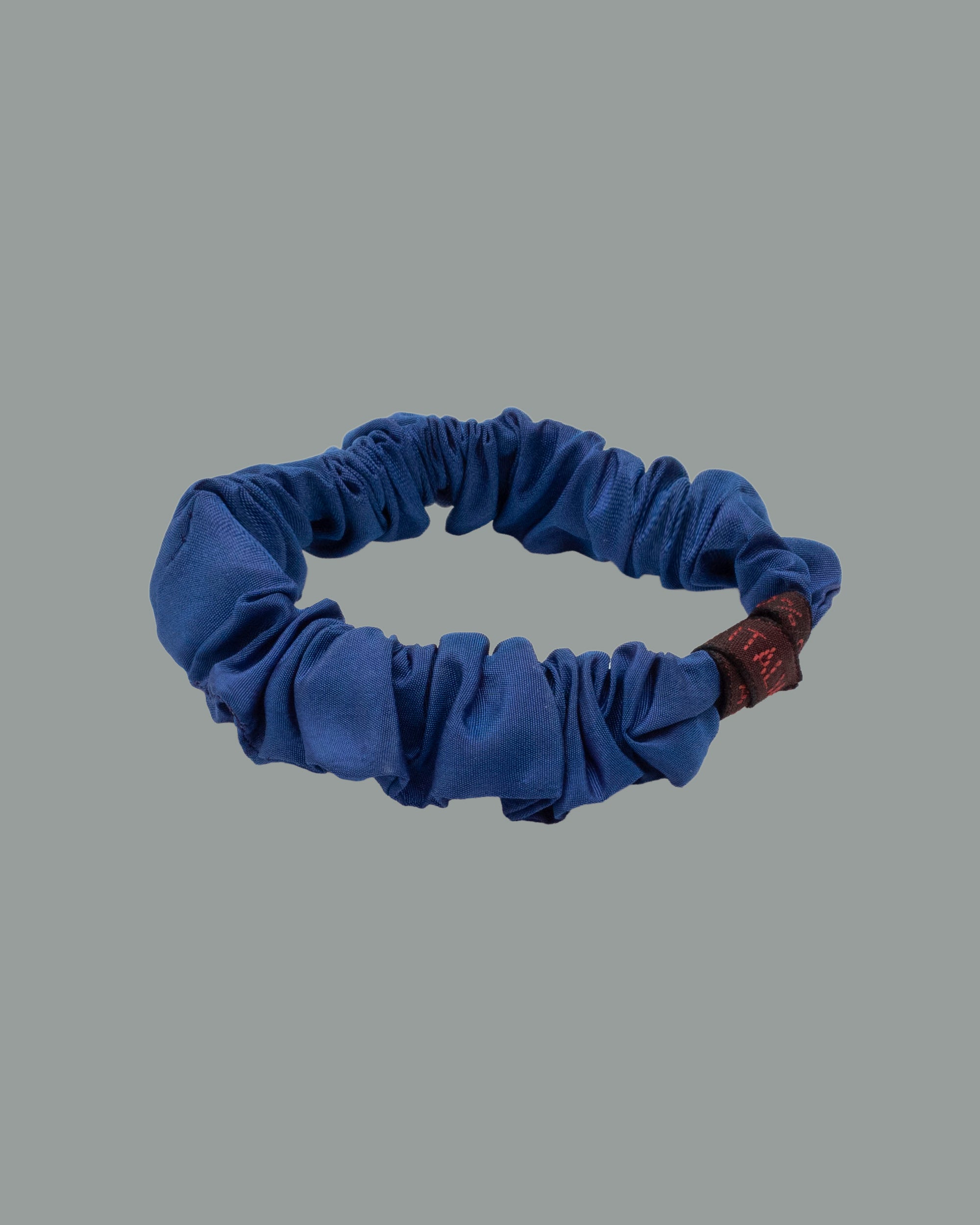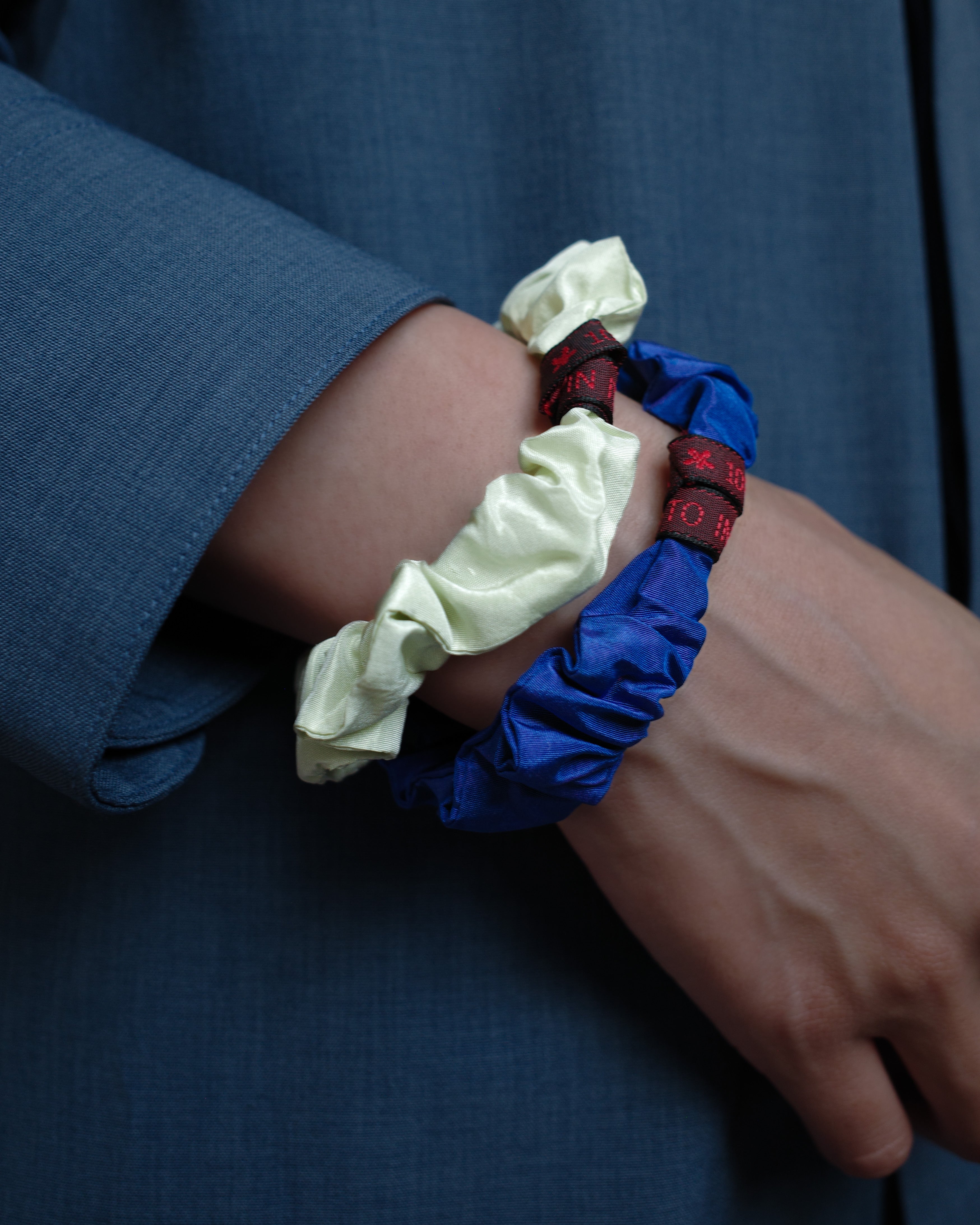 ファッションブランドならではの視点でデザインされたシルクのピースは、ブレスレットとしてもシュシュとしても使用できます。簡潔な構造の中に柔らかな膨らみと有機的なフォルムを備え、エレクトリックブルーの澄んだ発色が装いにシャープなアクセントを添えます。