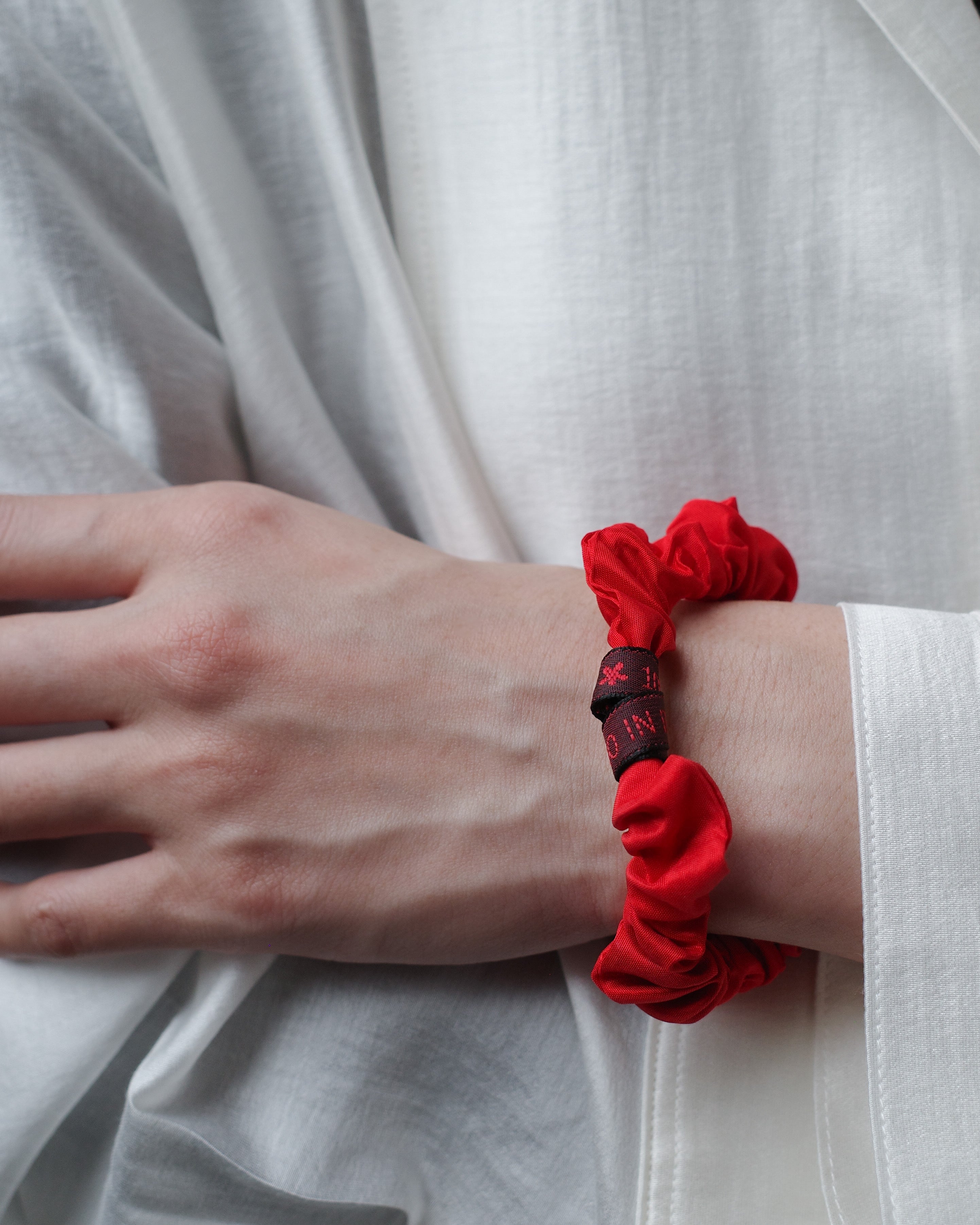 ファッションブランドならではの視点でデザインされたシルクのピースは、ブレスレットとしてもシュシュとしても使用できます。簡潔な構造の中に柔らかな膨らみと有機的なフォルムを備え、ファイヤードレッドの熱を含んだ色合いがあたためられた大地を思わせ、装いに力強い印象をもたらします。