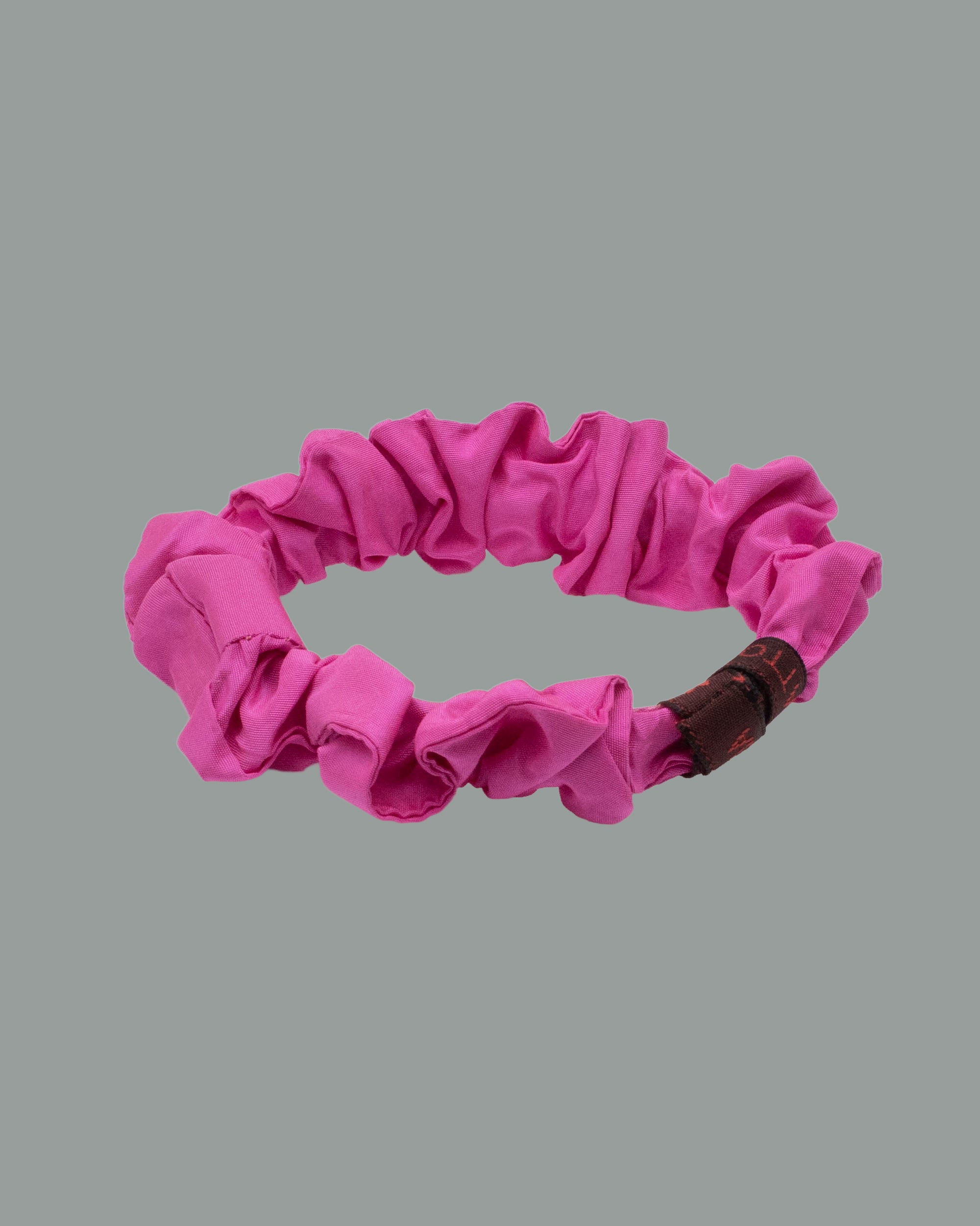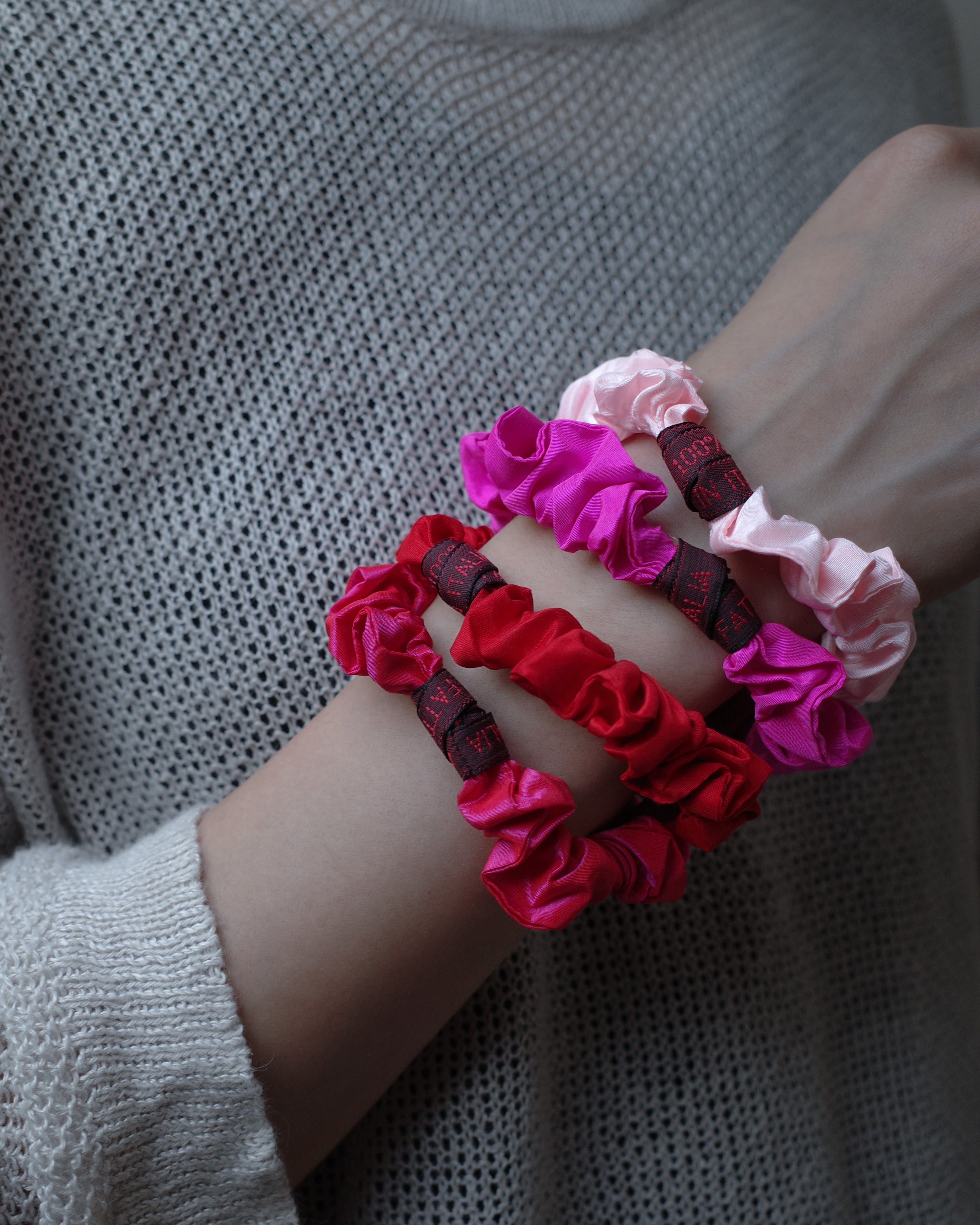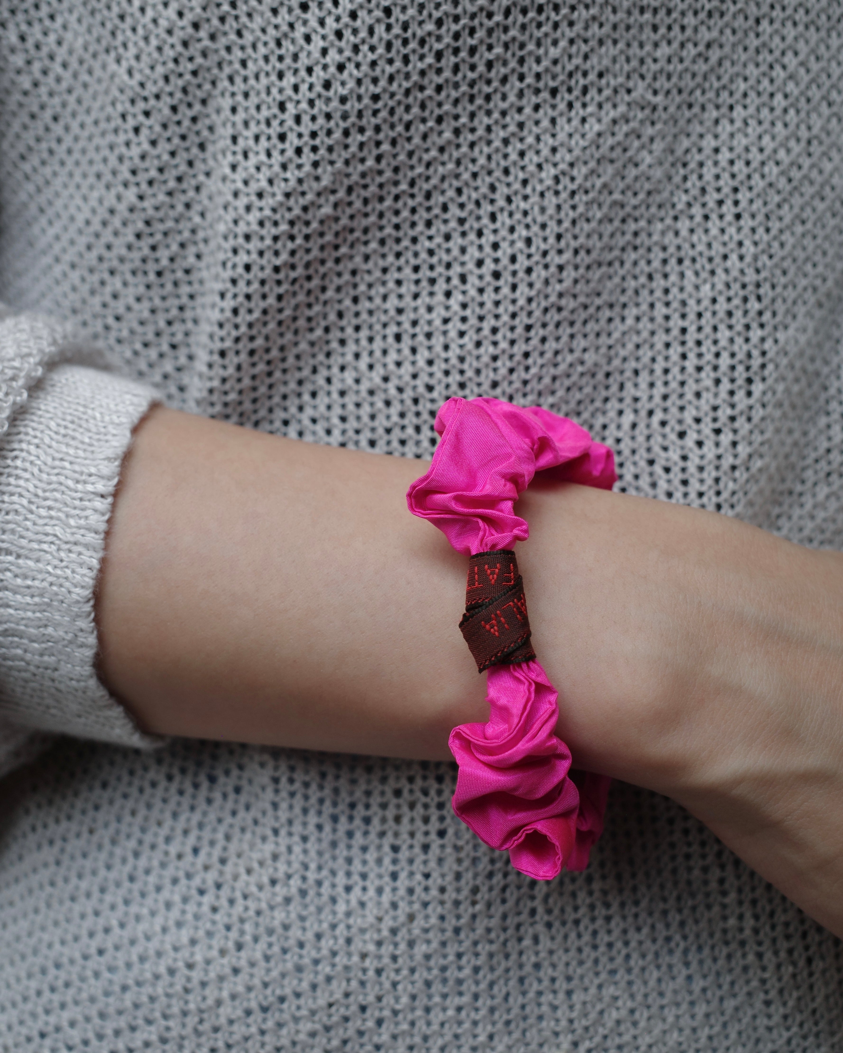 ファッションブランドならではの視点でデザインされたシルクのピースは、ブレスレットとしてもシュシュとしても使用できます。簡潔な構造の中に柔らかな膨らみと有機的なフォルムを備え、フクシアの鮮やかな色調が装いの中で印象的に際立ちます。