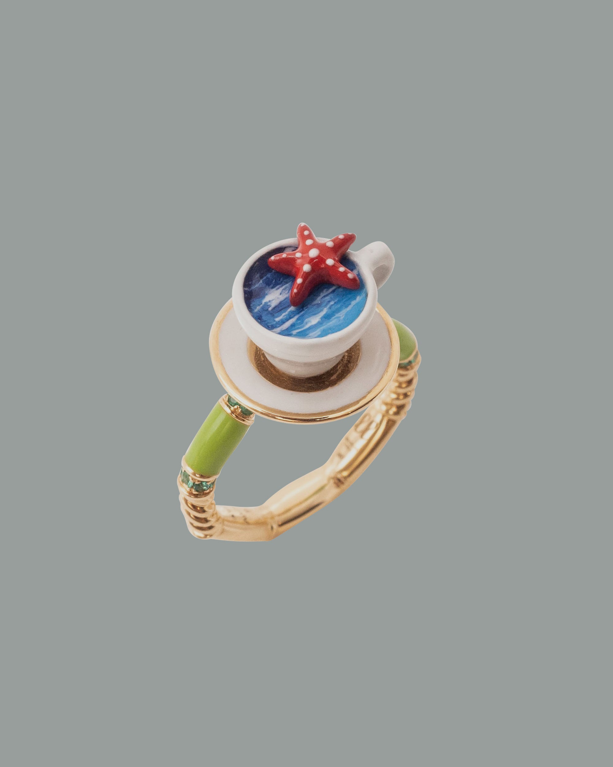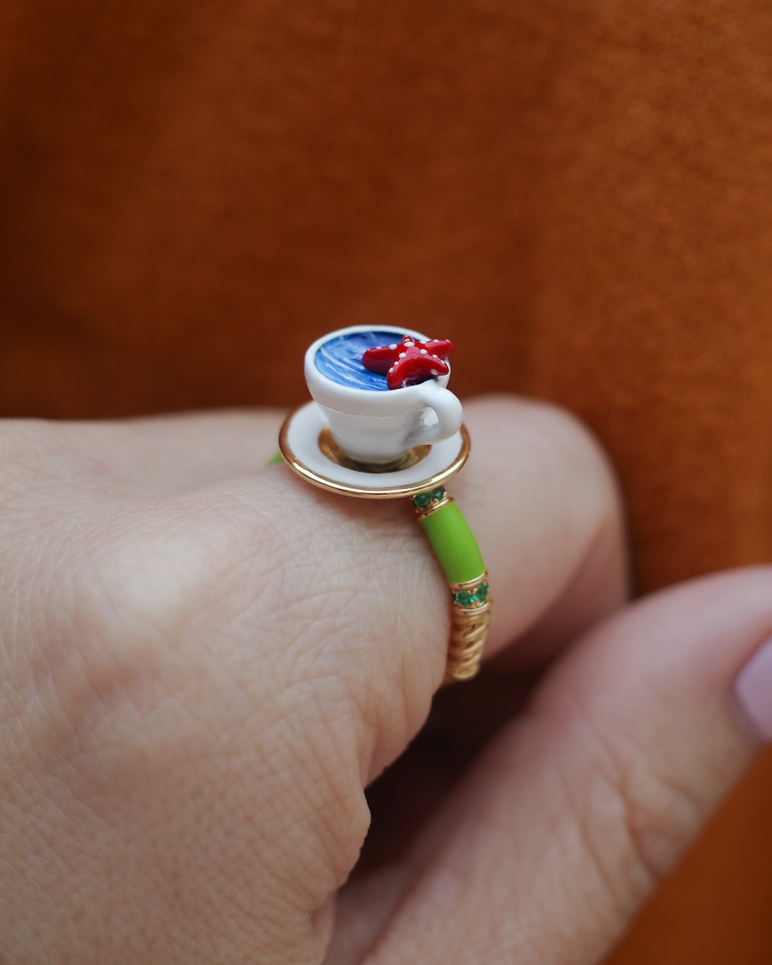小さなサボテンとコーヒーカップを運ぶクジラを描いた物語から生まれたアイコニックなリング。ゴールドのアームに施されたエナメルの色彩と、小さなヒトデが寄り添うカップにヴィラの遊び心が宿ります。