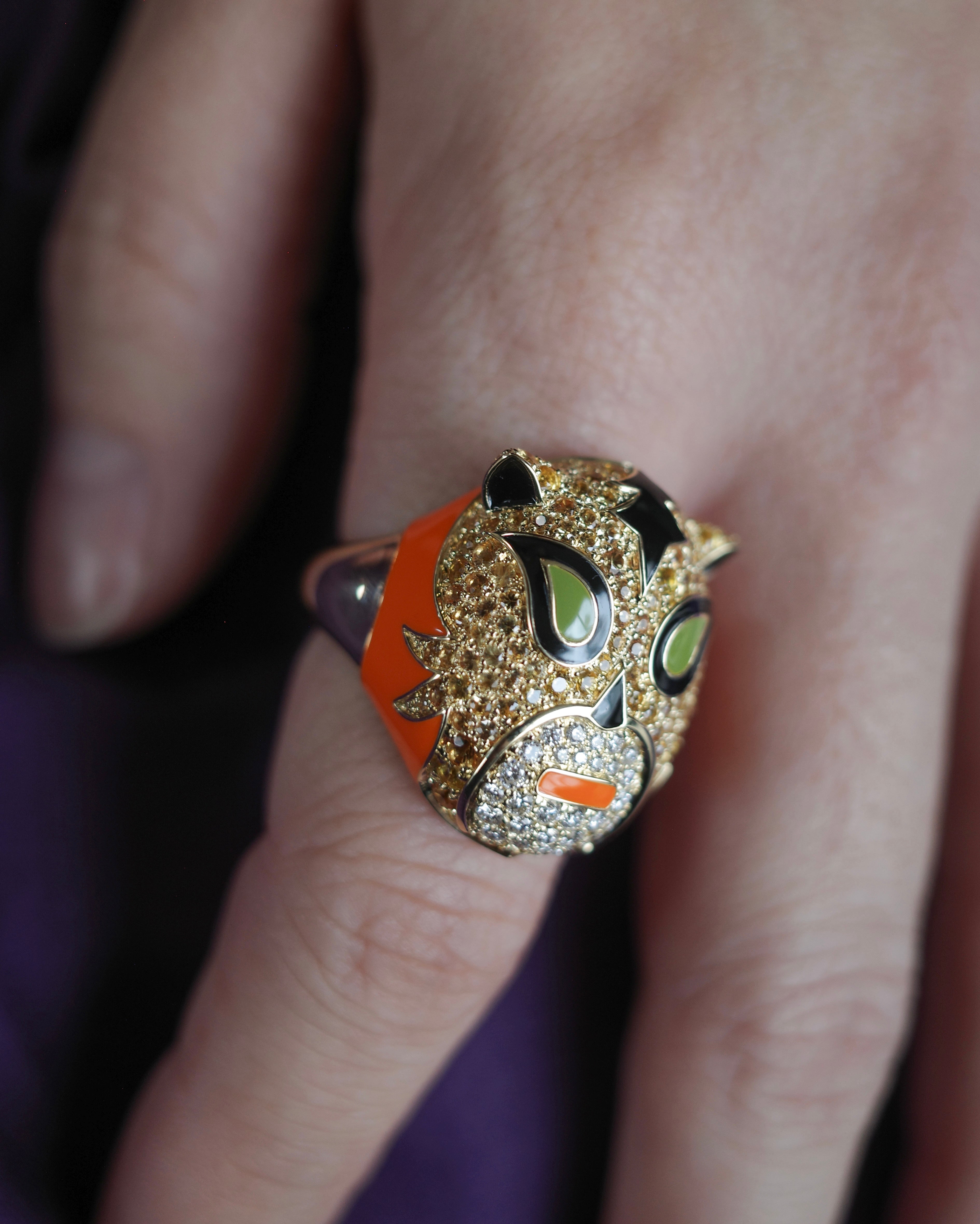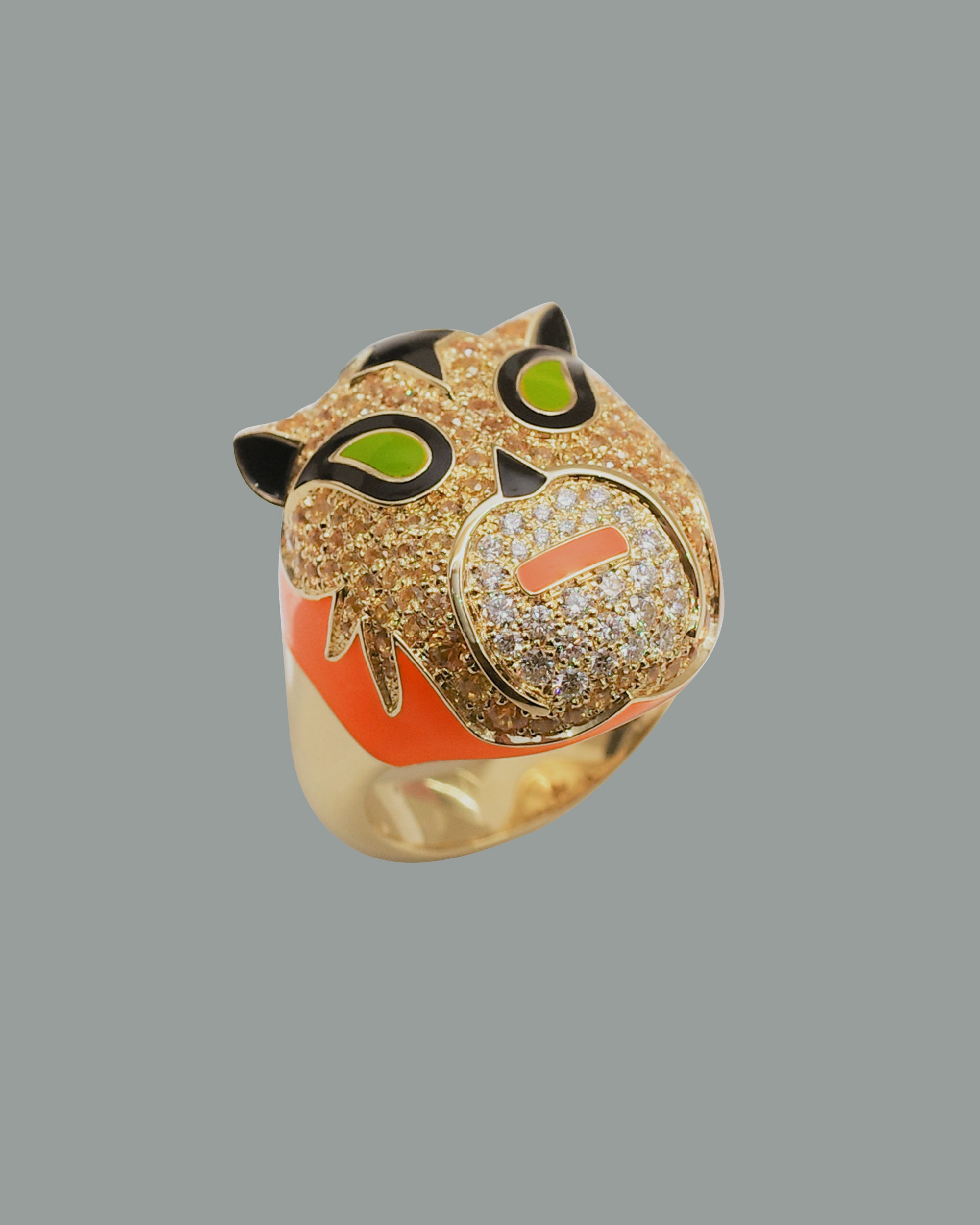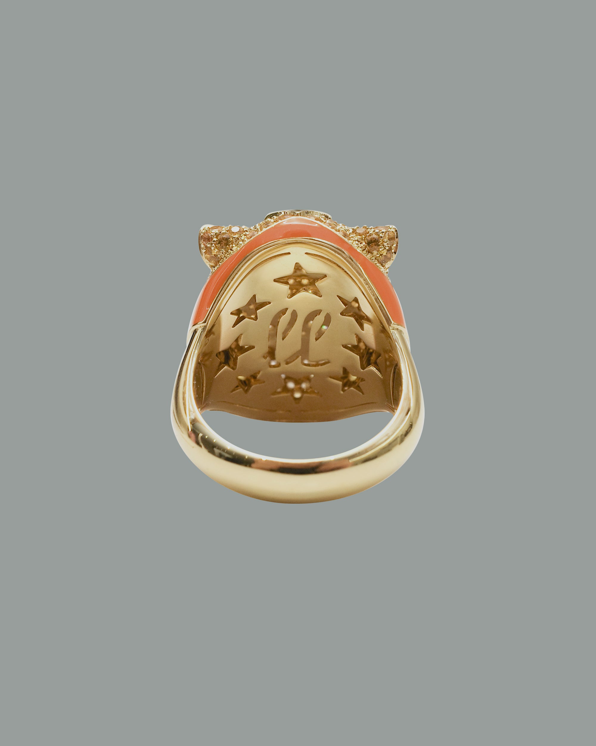 エナメルで色付けされた表面にはイエローサファイアとダイヤモンドがセッティングされ、裏面にはヴィラのトレードマークである星の透かし彫りがあしらわれています。
