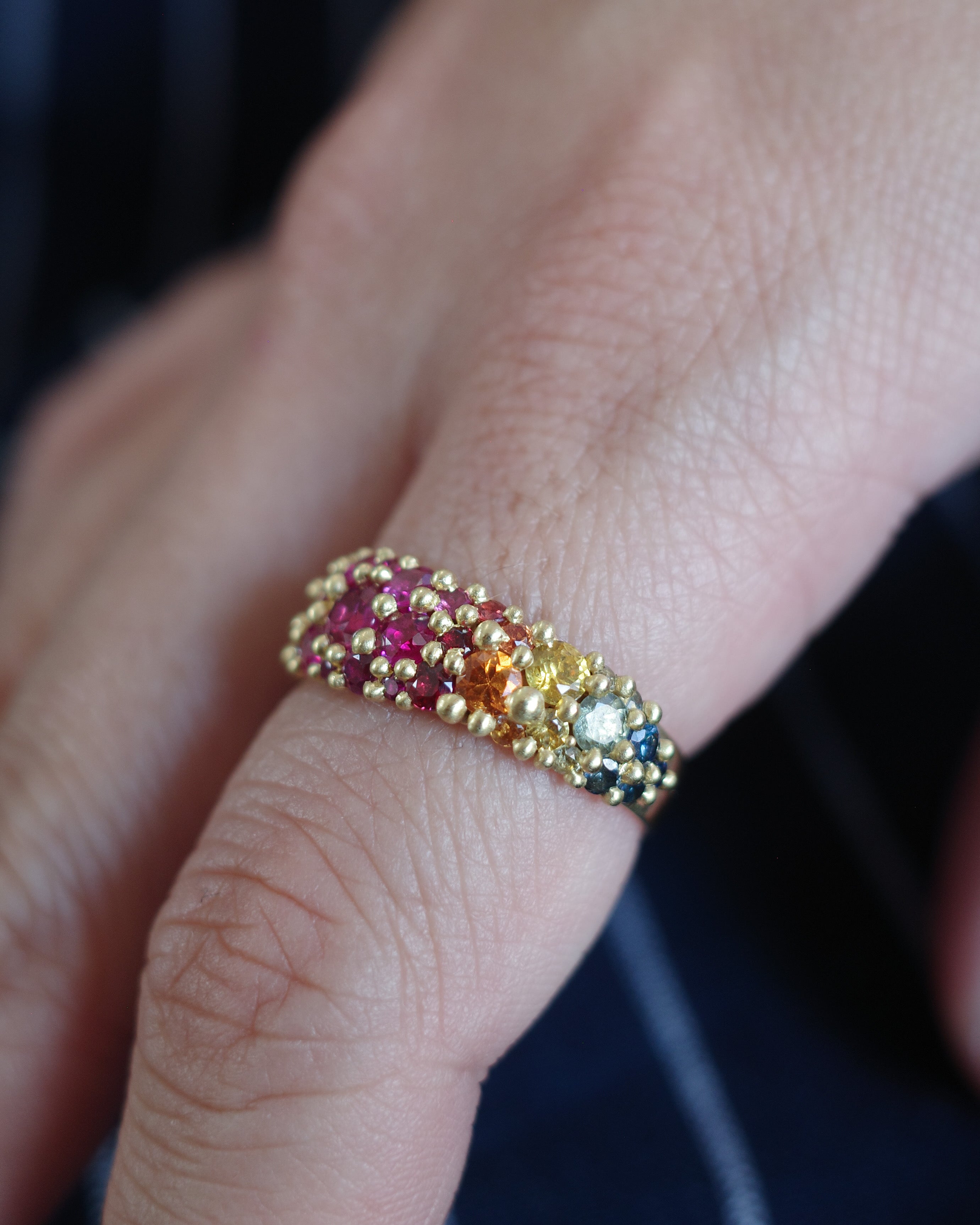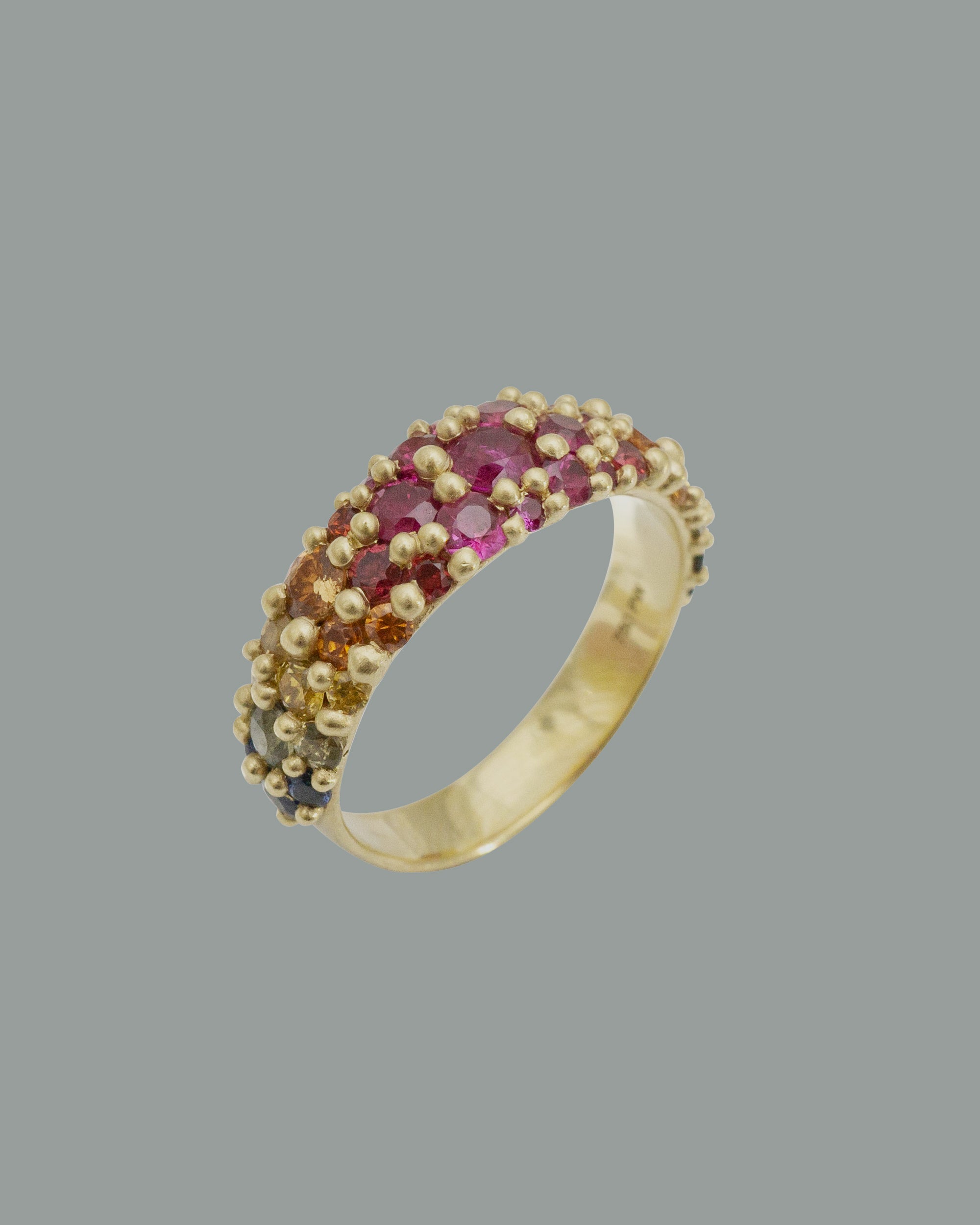その鮮烈な色彩感覚を体現したリングです。18Kリサイクルイエローゴールドのワイドバンドには、ホットピンクのレインボーサファイアをグラデーションにあしらい、「Cast-Not-Set(キャスト・ノット・セット)」によって石それぞれの表情を引き出しながら一点一点異なるデザインに仕上げています。