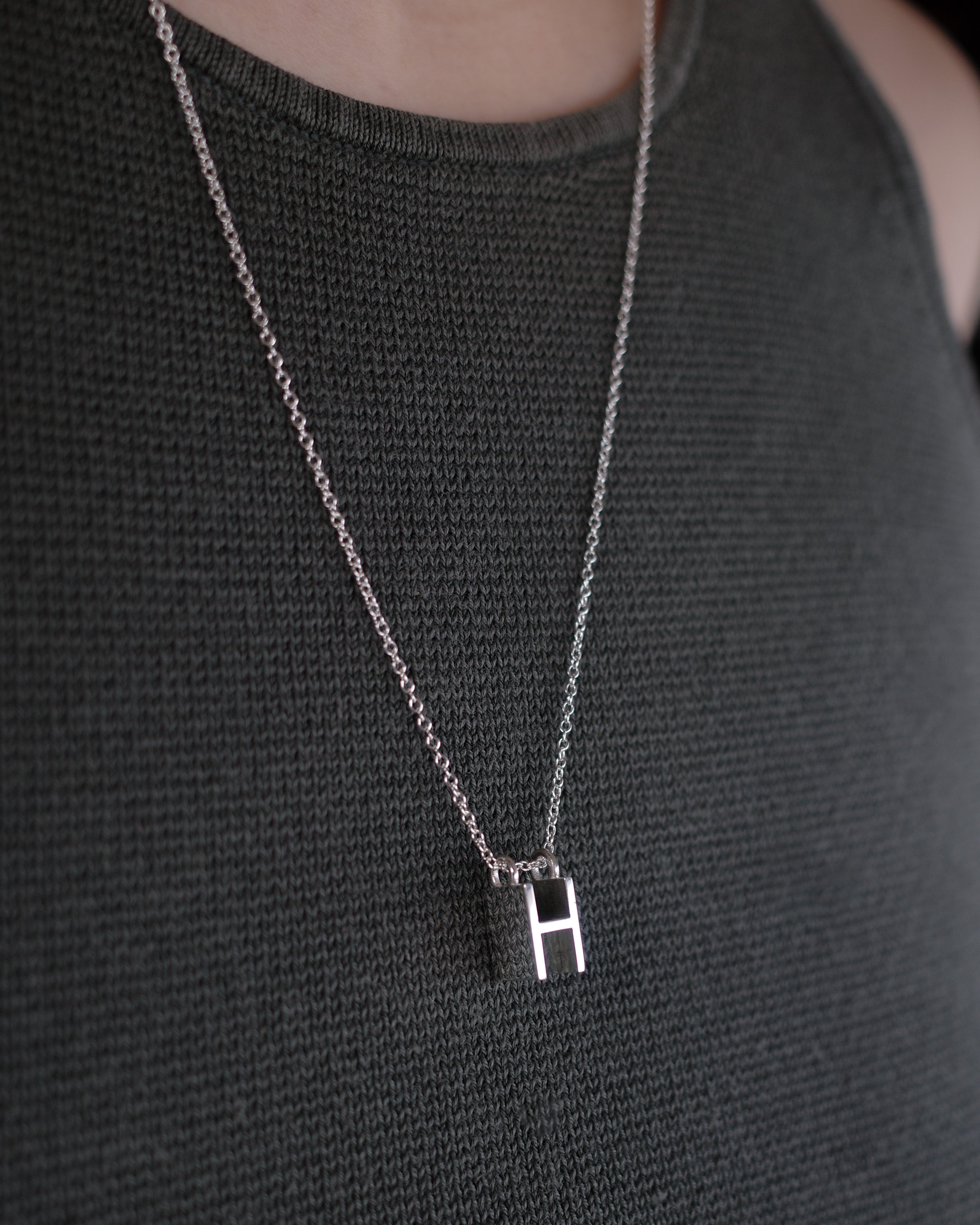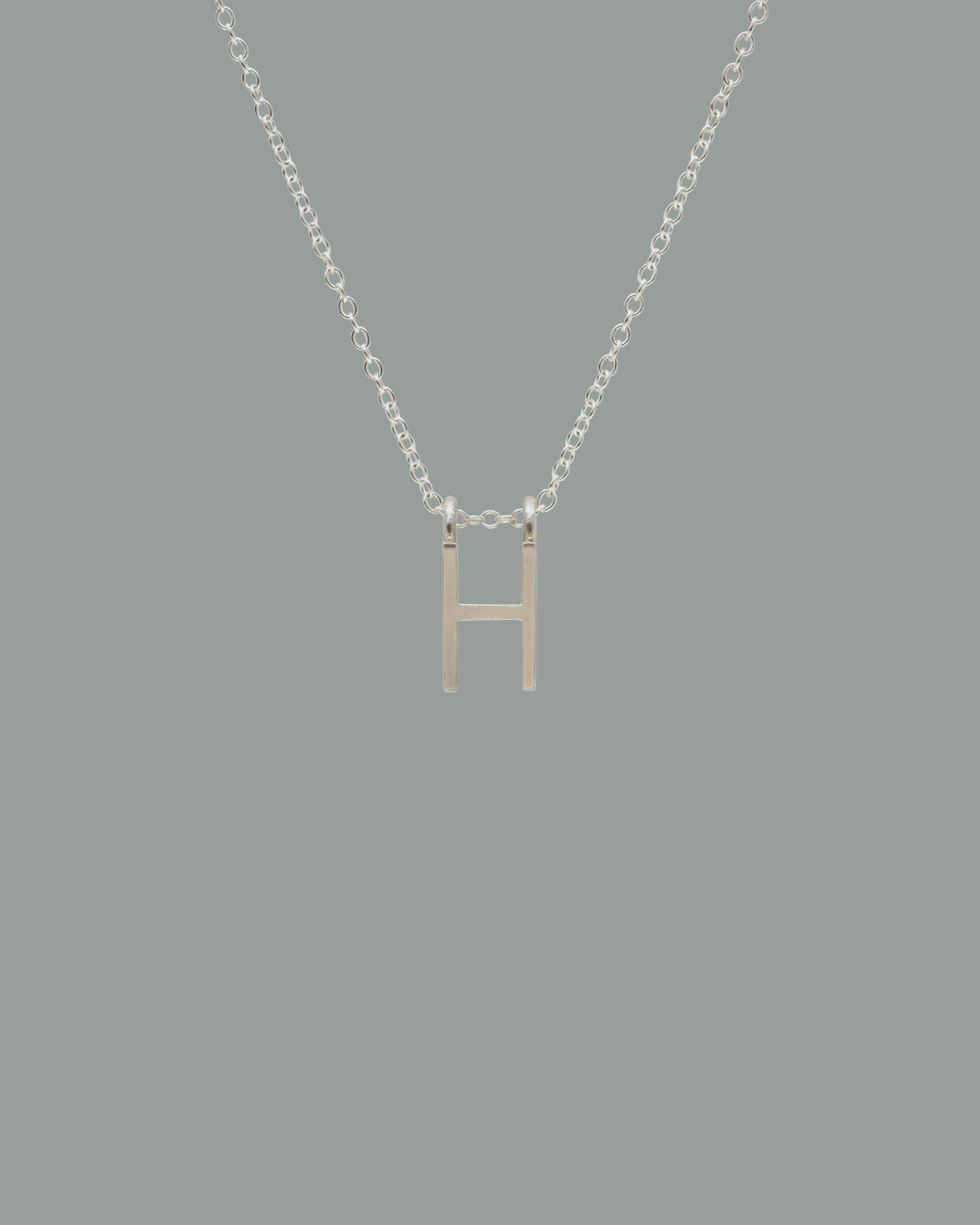 This necklace features a bold, sculptural “H” motif, set on a simple silver chain. Created from her passion for typography, the design draws inspiration from the “Arial Narrow” typeface and reimagines it through an architectural beauty. Starting from a single letter, this piece quietly reflects personal meaning. Whether worn alone or layered with other letters, it allows you to create a piece that tells your own story.