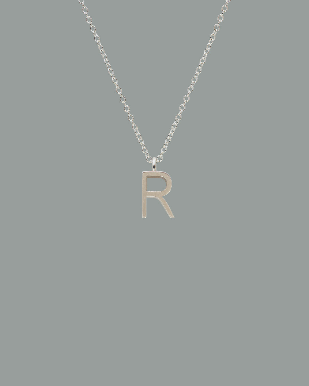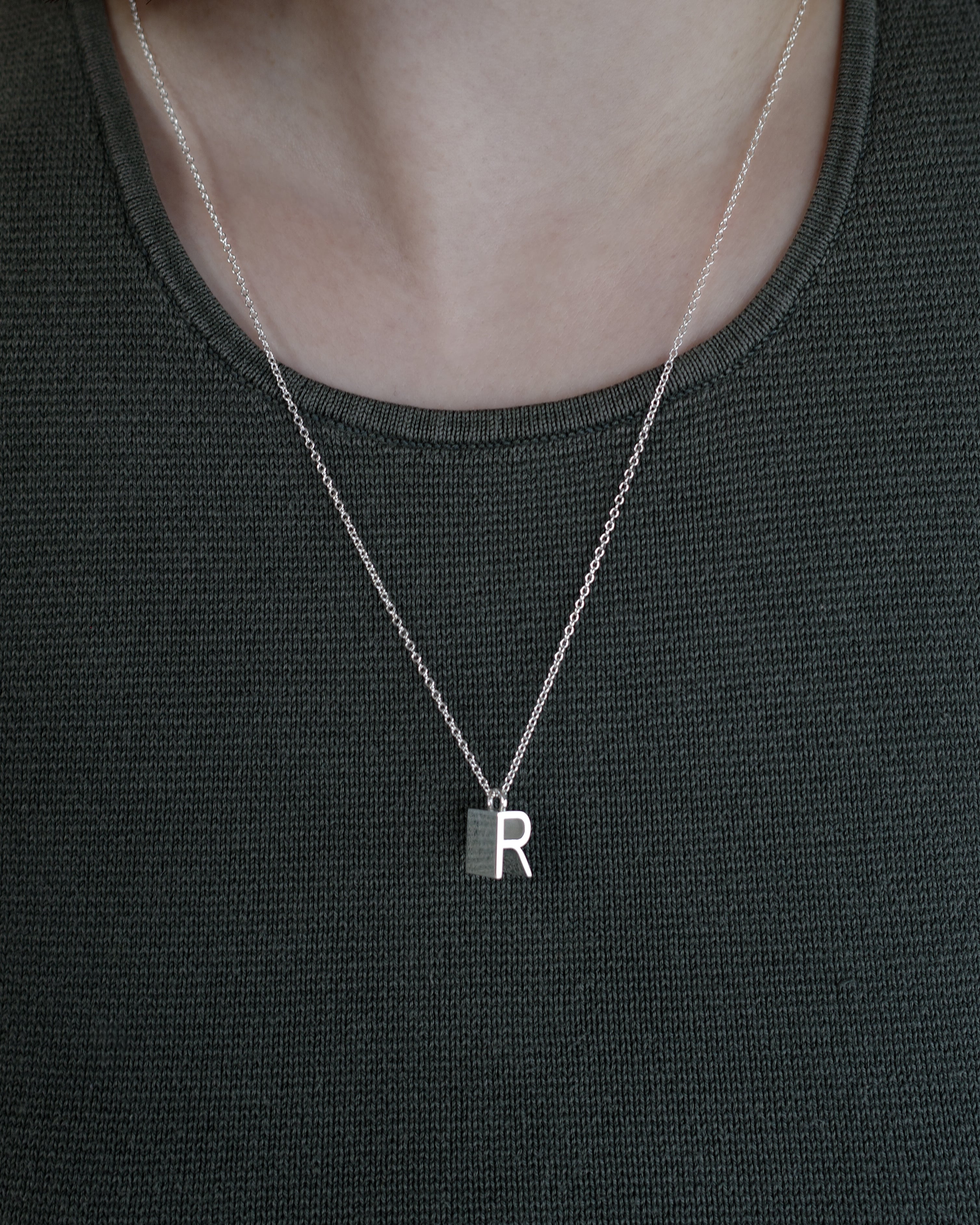 This necklace features a bold, sculptural “R” motif, set on a simple silver chain. Created from her passion for typography, the design draws inspiration from the “Arial Narrow” typeface and reimagines it through an architectural beauty. Starting from a single letter, this piece quietly reflects personal meaning. Whether worn alone or layered with other letters, it allows you to create a piece that tells your own story.