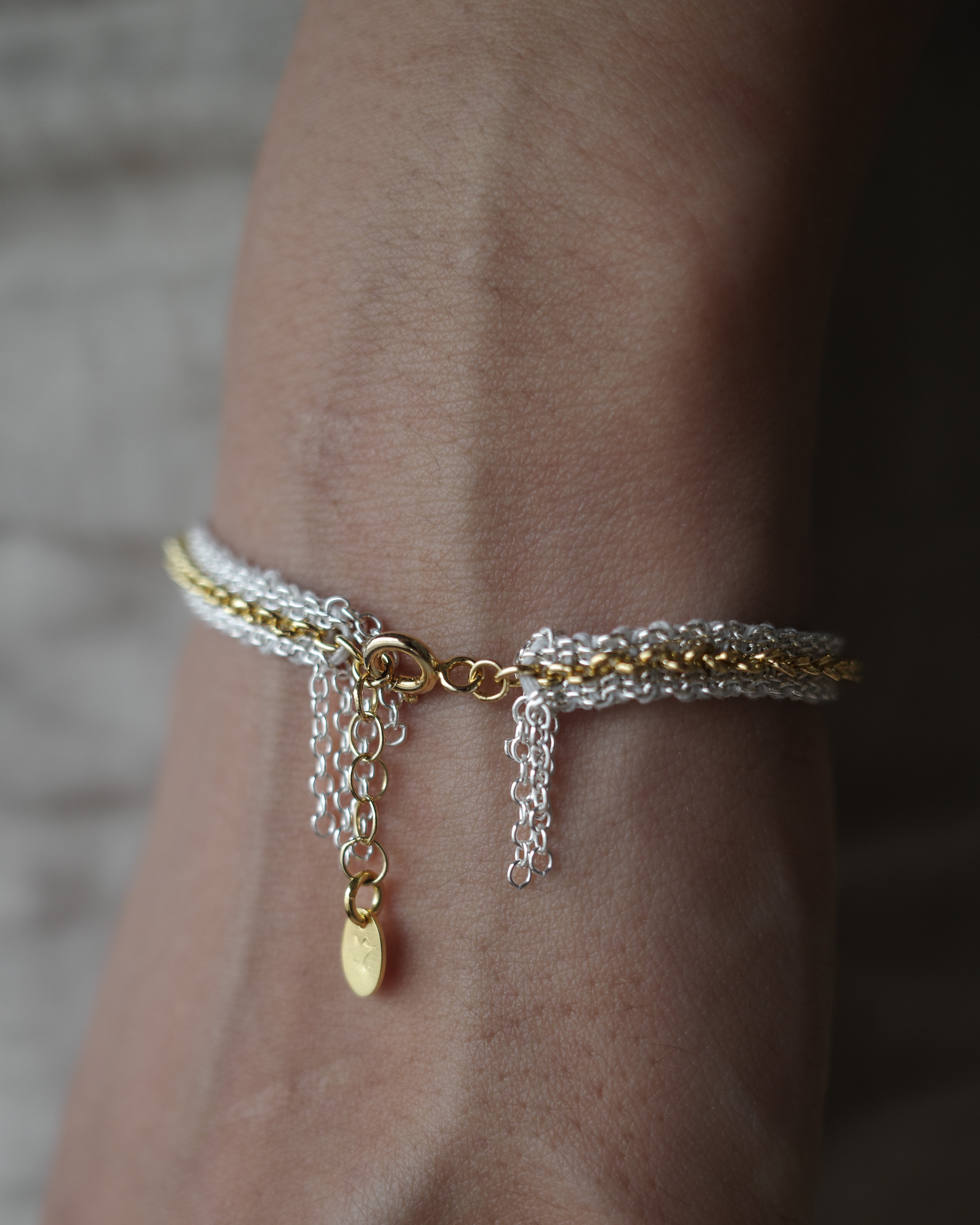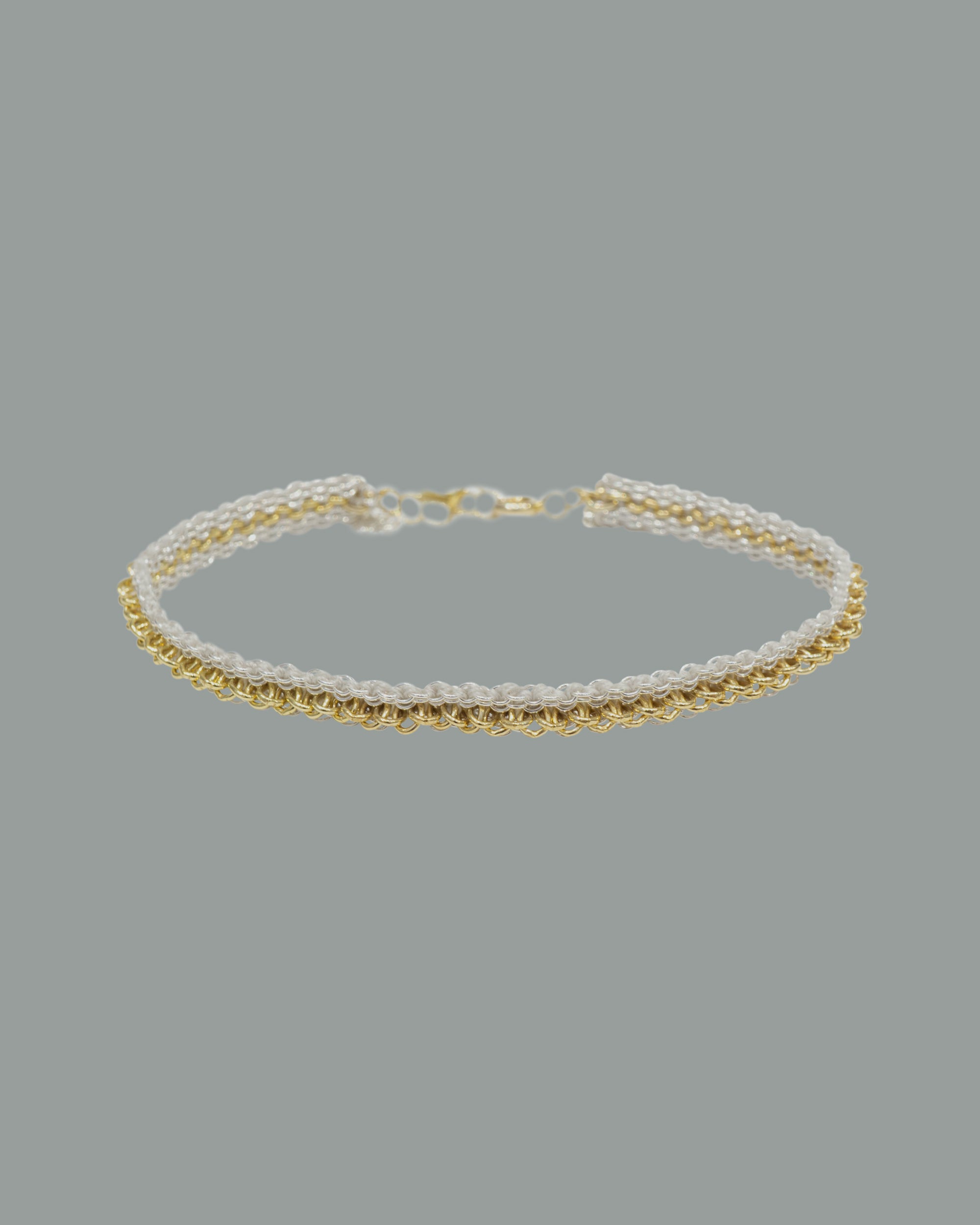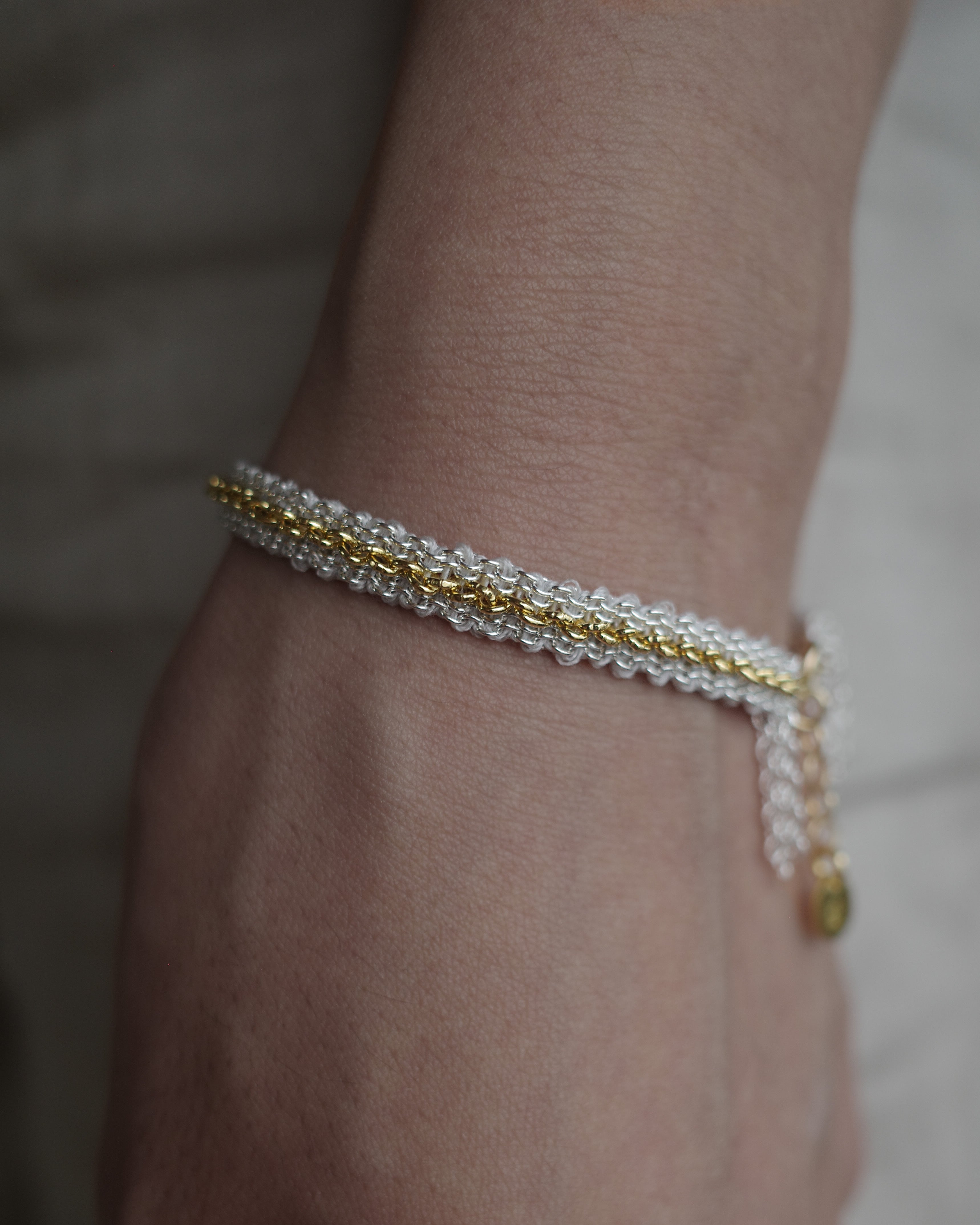 Silver textures are intricately woven into silk, complemented by delicate accents of yellow gold that add an elegant radiance to the wrist.