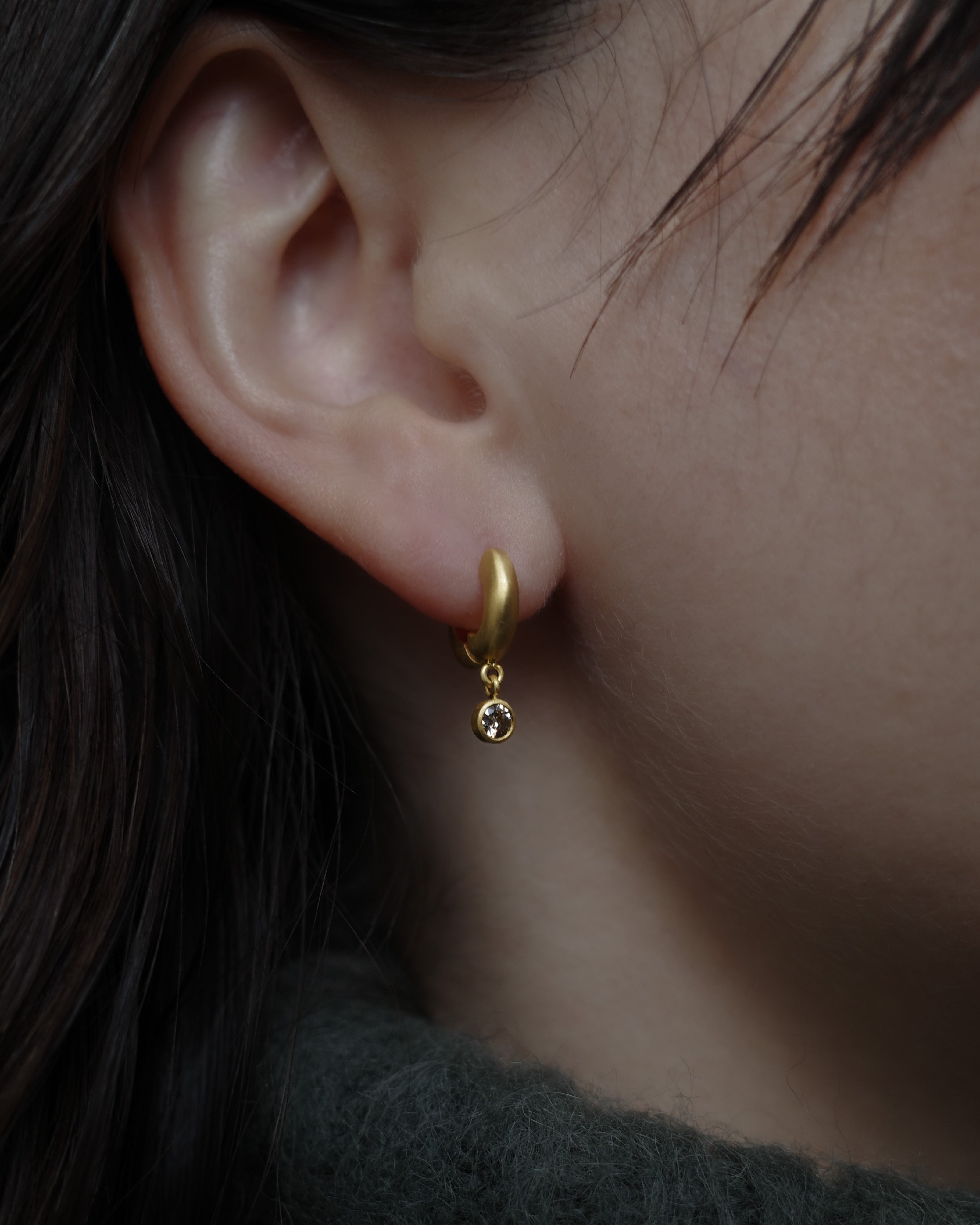 The signature hoops, rich in volume, carry a natural openness reminiscent of ancient adornments, adding a quiet sense of weight and presence to the ear.