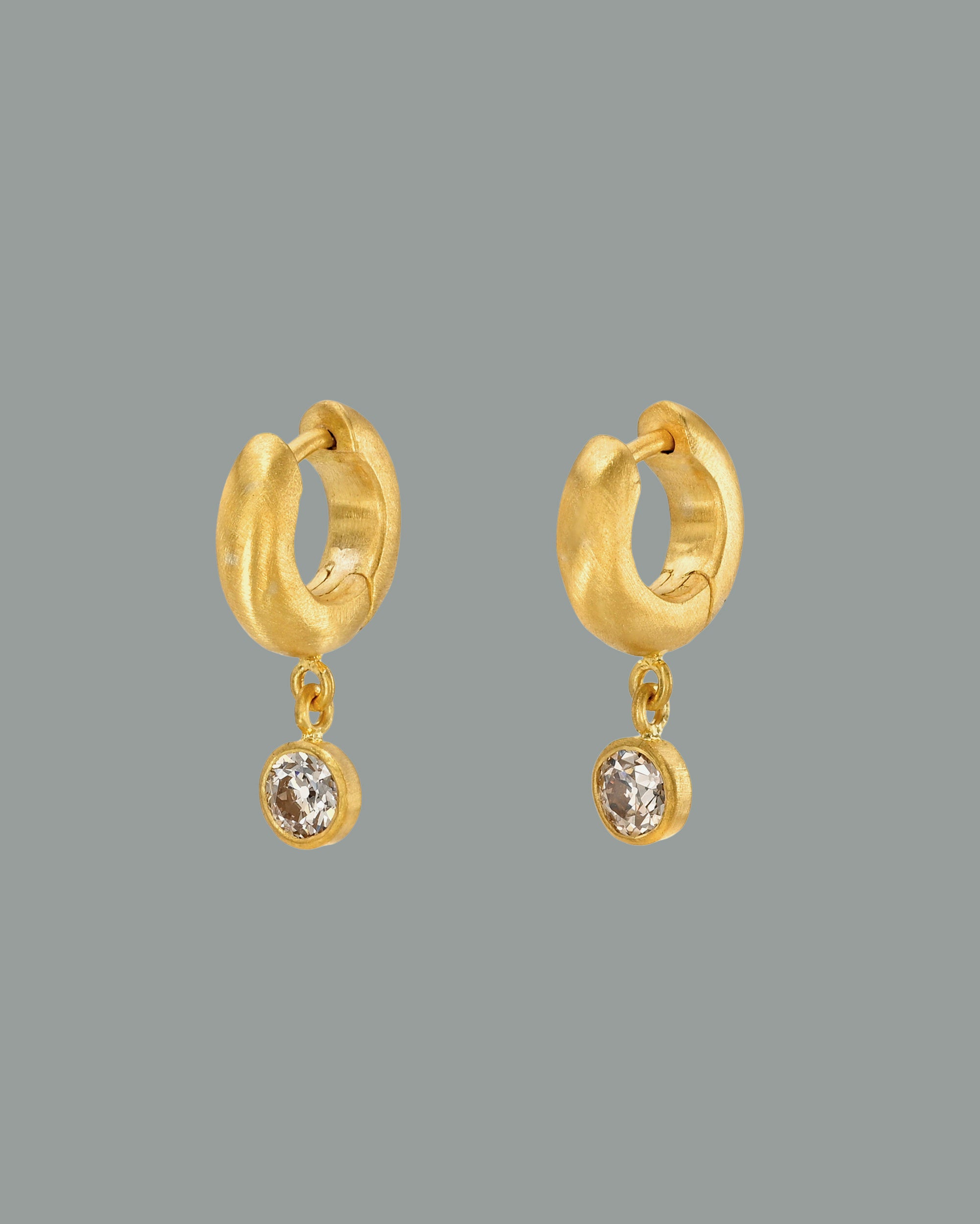 These hoop earrings feature drops set with champagne-colored Old Mine cut diamonds, paired with hoops in 18K Fairmined gold. Each piece is individually handcrafted in Los Angeles by master goldsmiths.
