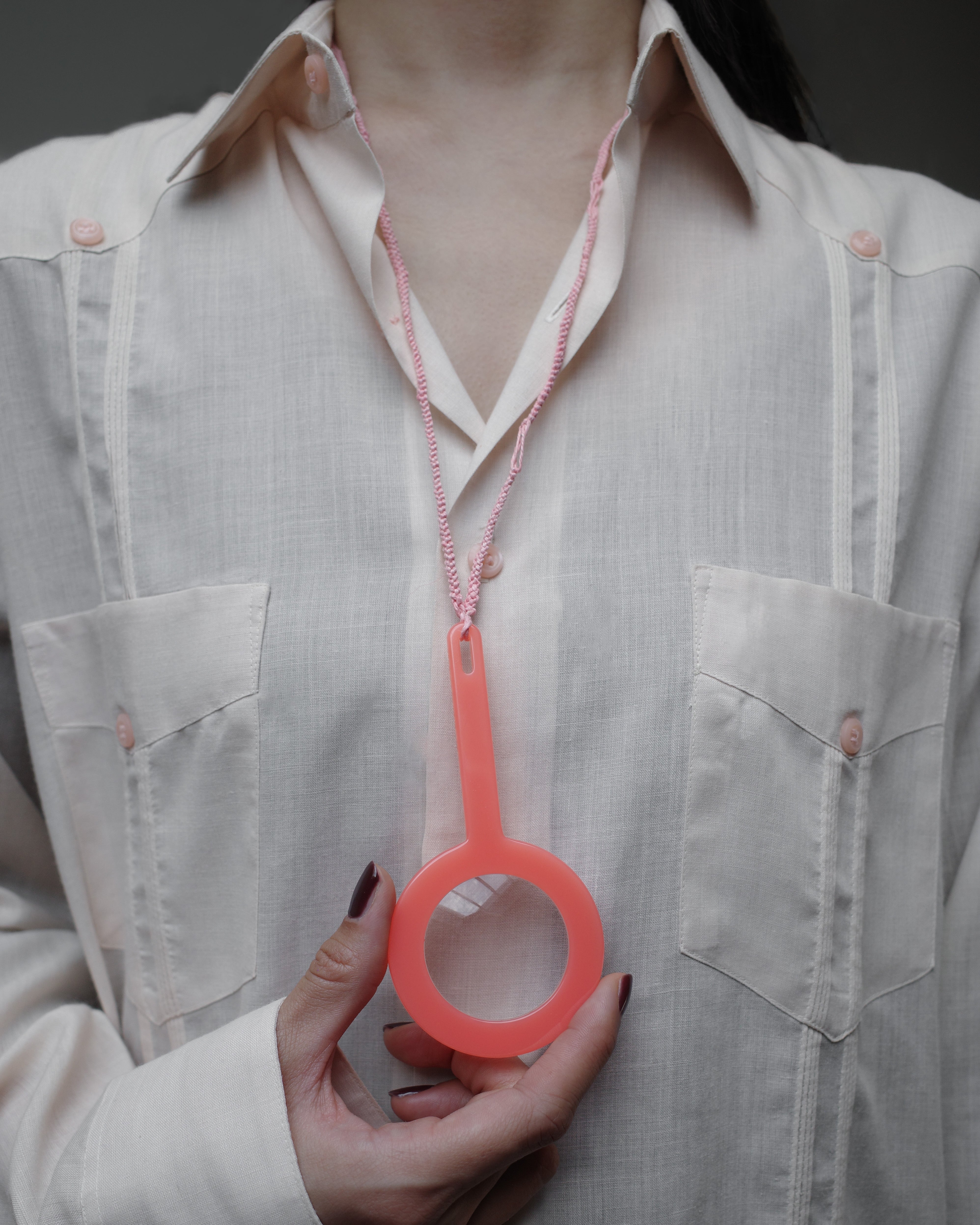 Designed from a fashion perspective, this pendant features a simple yet distinctive form that naturally complements the wearer’s style. Beyond its role as a fashion item, it also functions as a practical magnifying glass.
