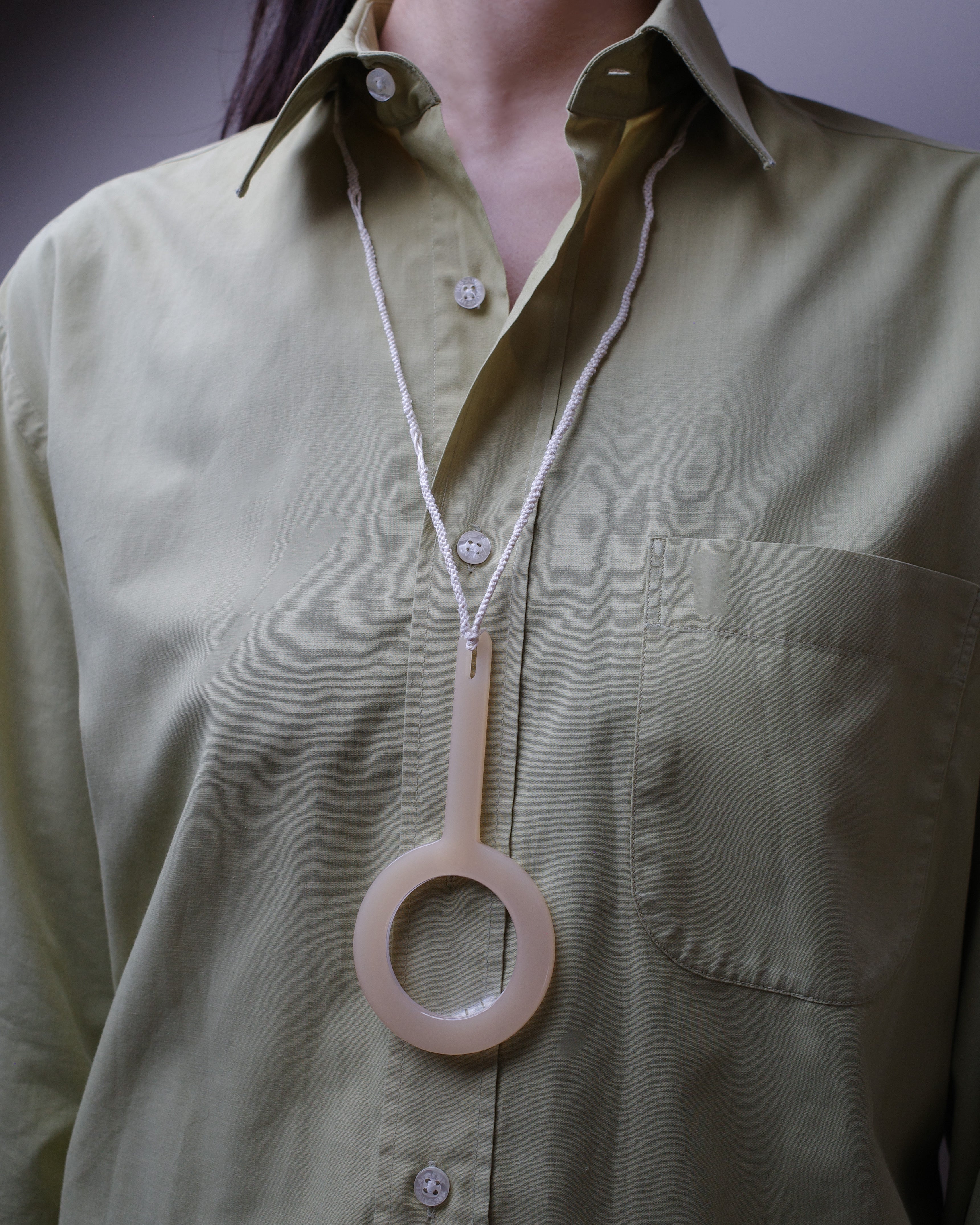 Designed from a fashion perspective, this pendant features a simple yet distinctive form that naturally complements the wearer’s style. Beyond its role as a fashion item, it also functions as a practical magnifying glass.