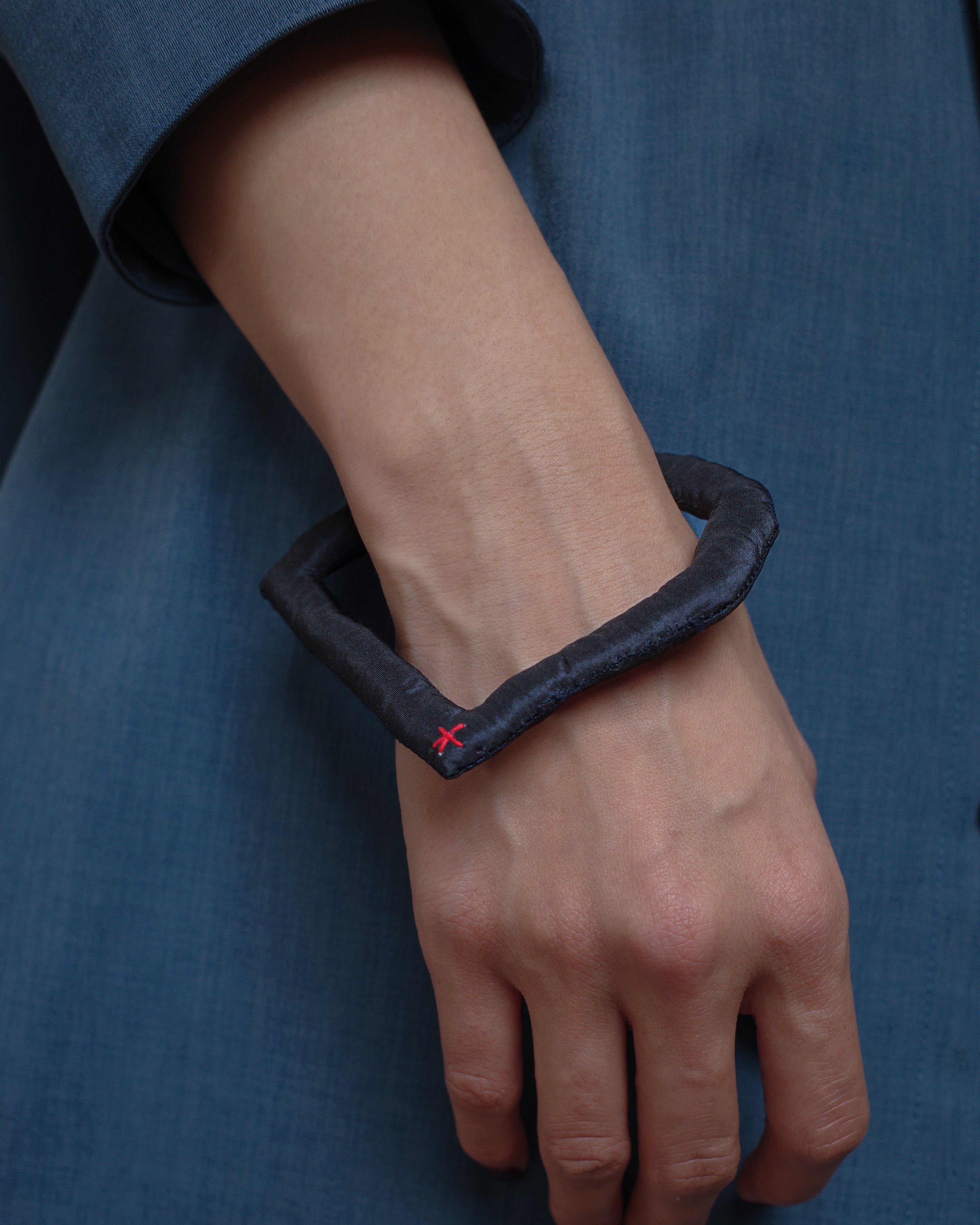 Designed from a fashion perspective, this silk bracelet features a soft and organic form that gives the wrist an art-like presence. The deep navy blue adds definition to any look.