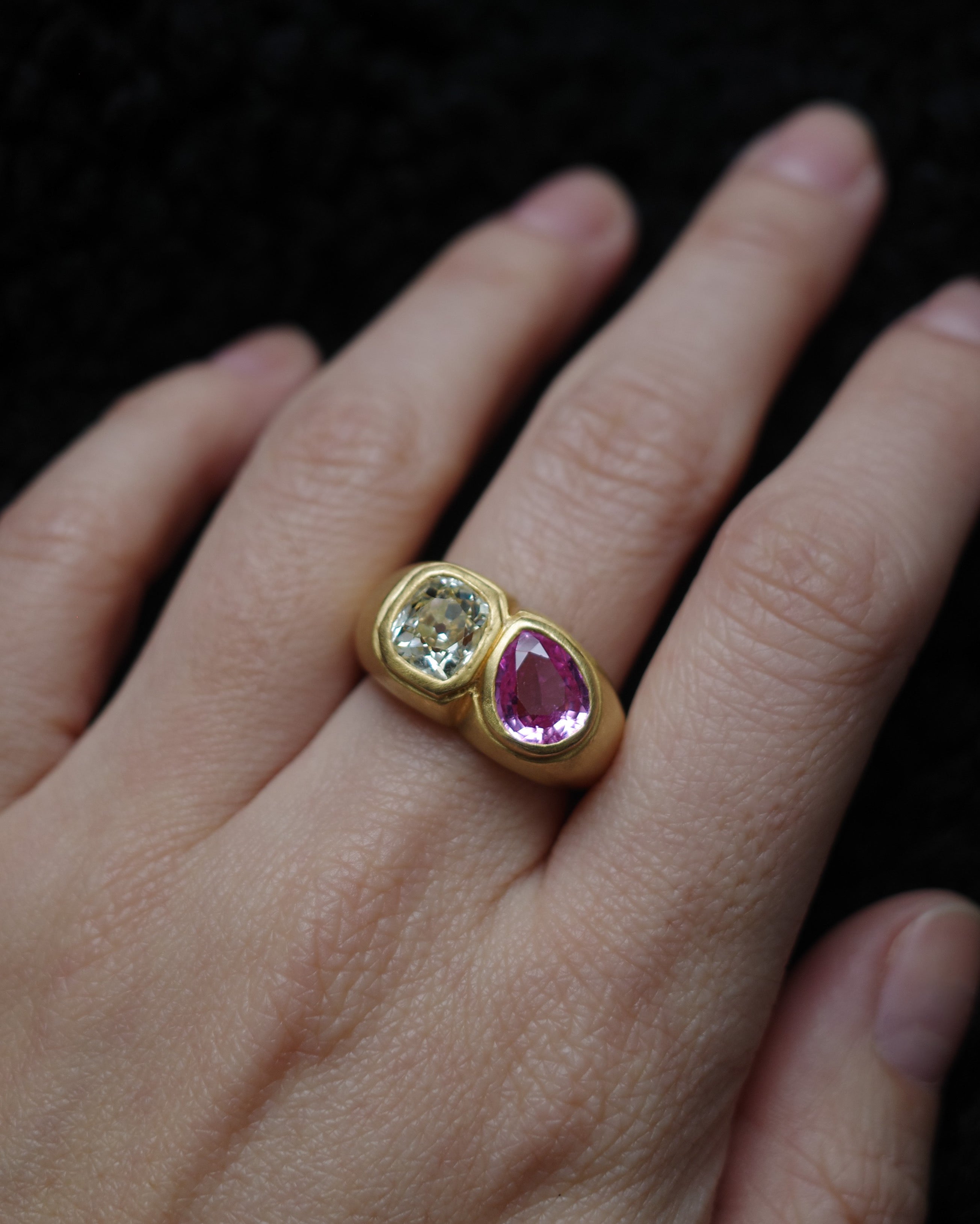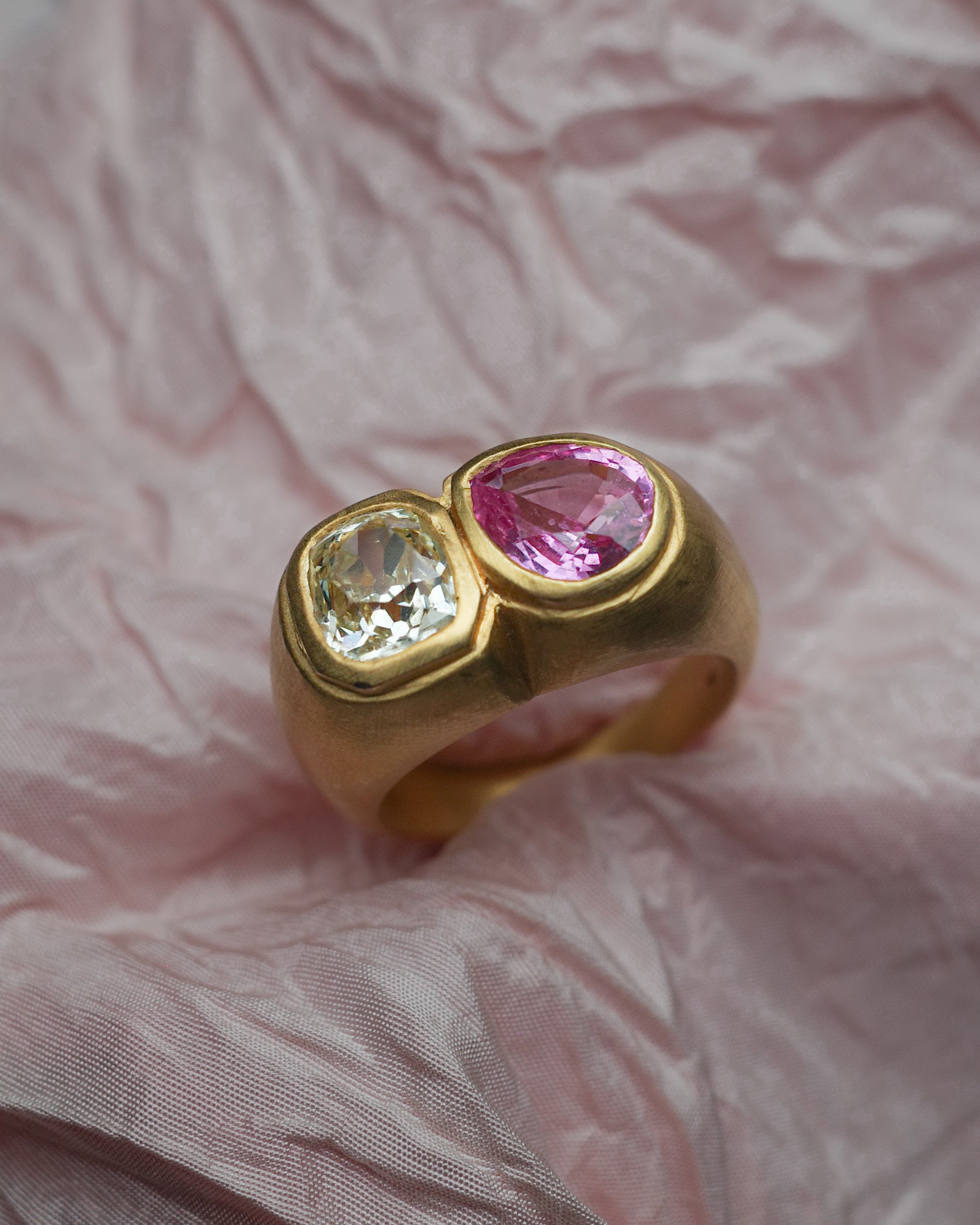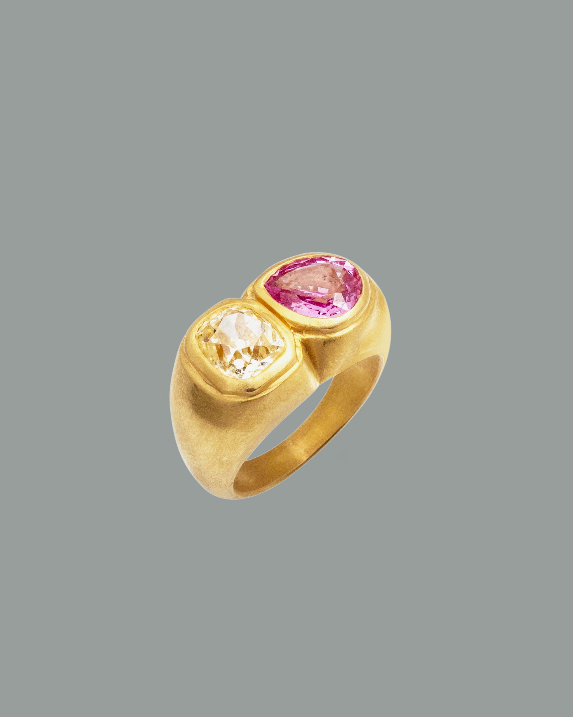This ring features a pear-shaped pink sapphire paired with an Old Mine cut antique diamond, both set in 18K Fairmined gold. Each piece is individually handcrafted in Los Angeles by master goldsmiths.