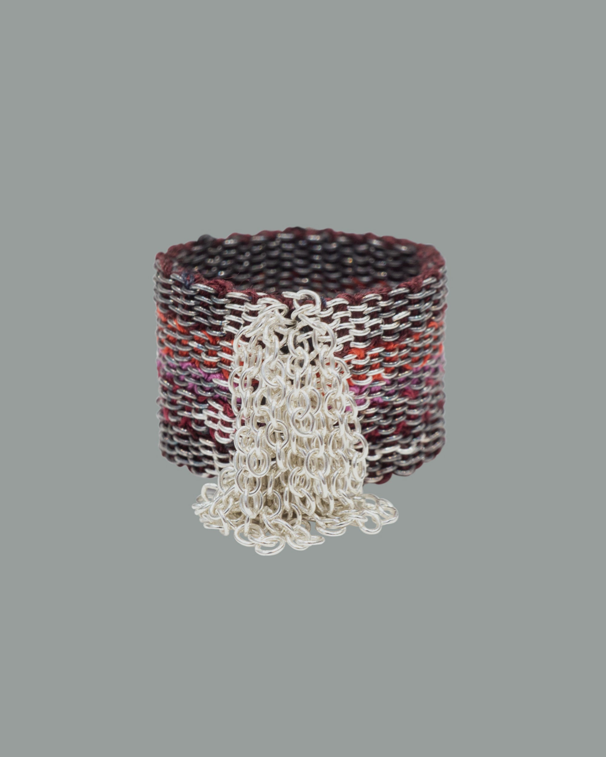 Silver textures are intricately woven into pink, red and black silk adding an elegant radiance to the hand.