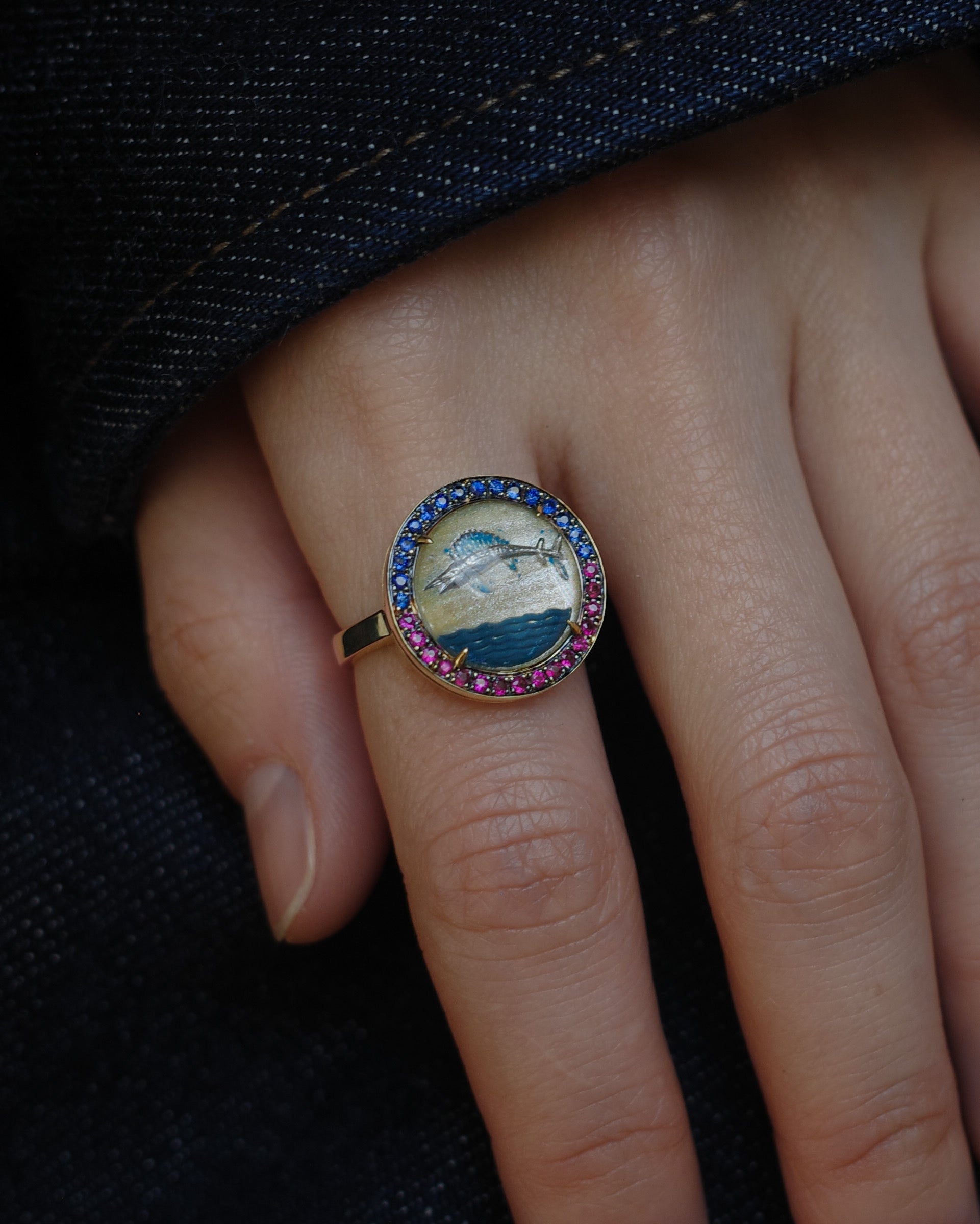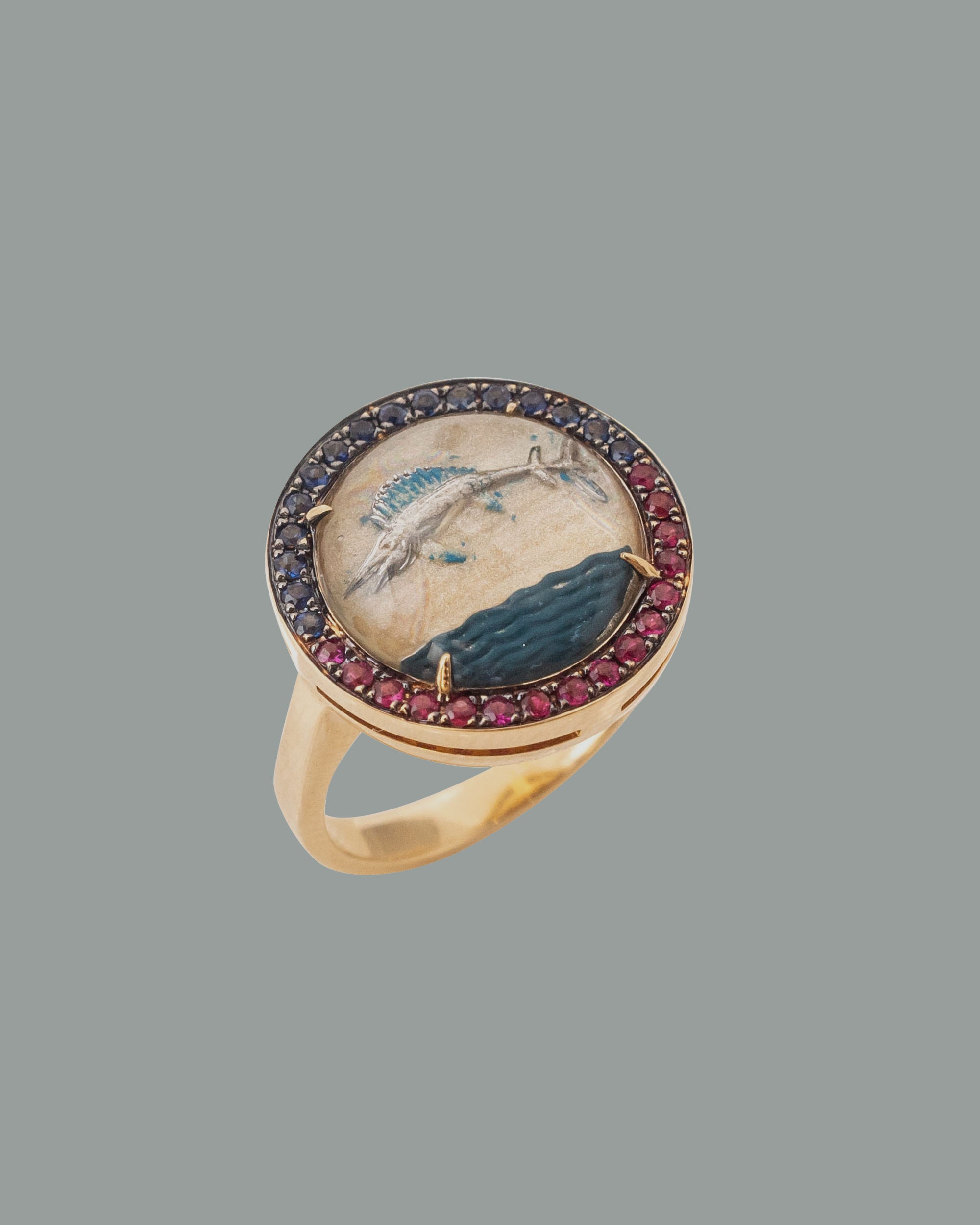 The crystal shows a marlin jumping energetically from the sea, and it is framed with rubies and blue sapphires that give the vintage crystal a fresh new life. It is a Francesca style piece, elevating the beauty of an antique crystal into a contemporary jewel.