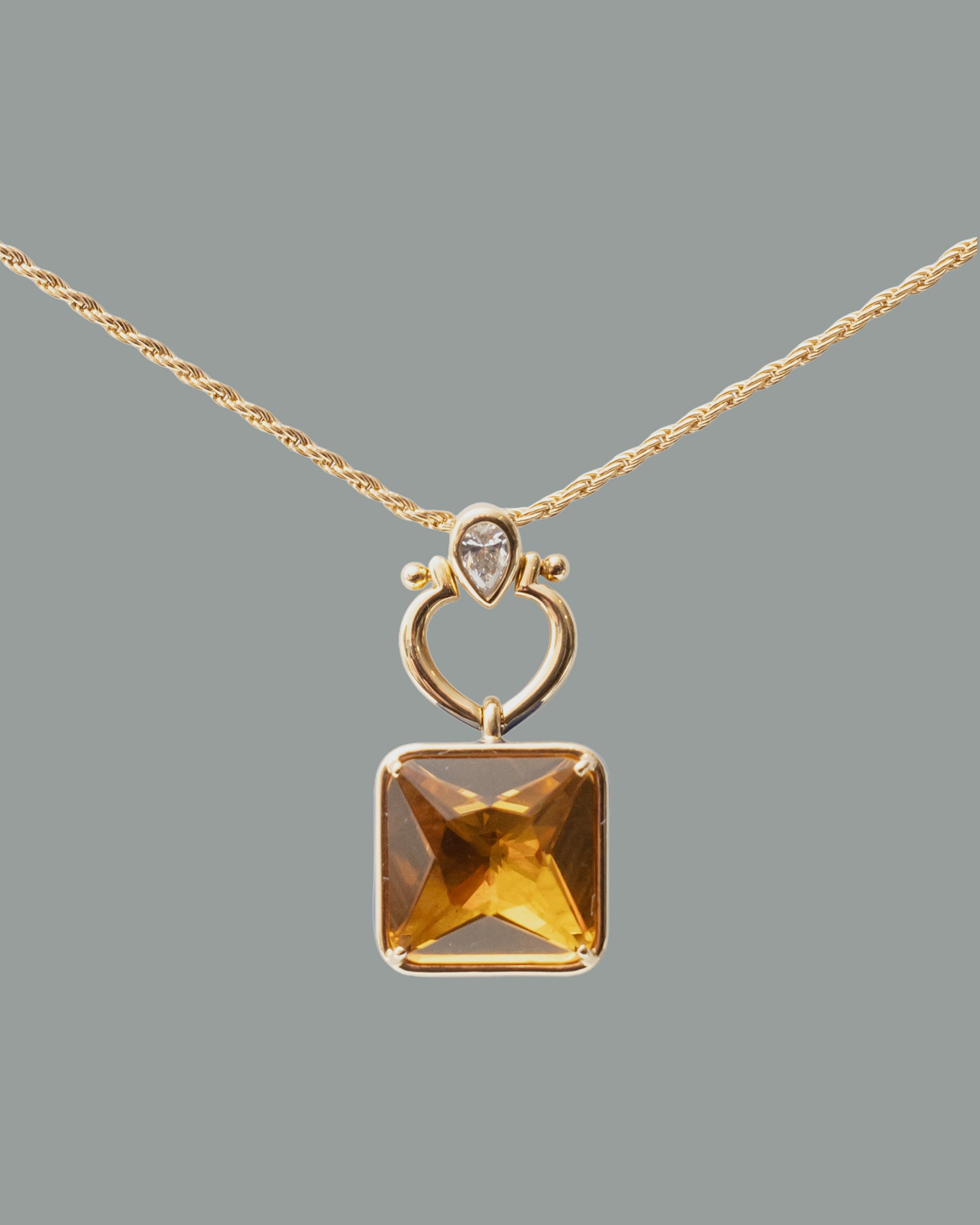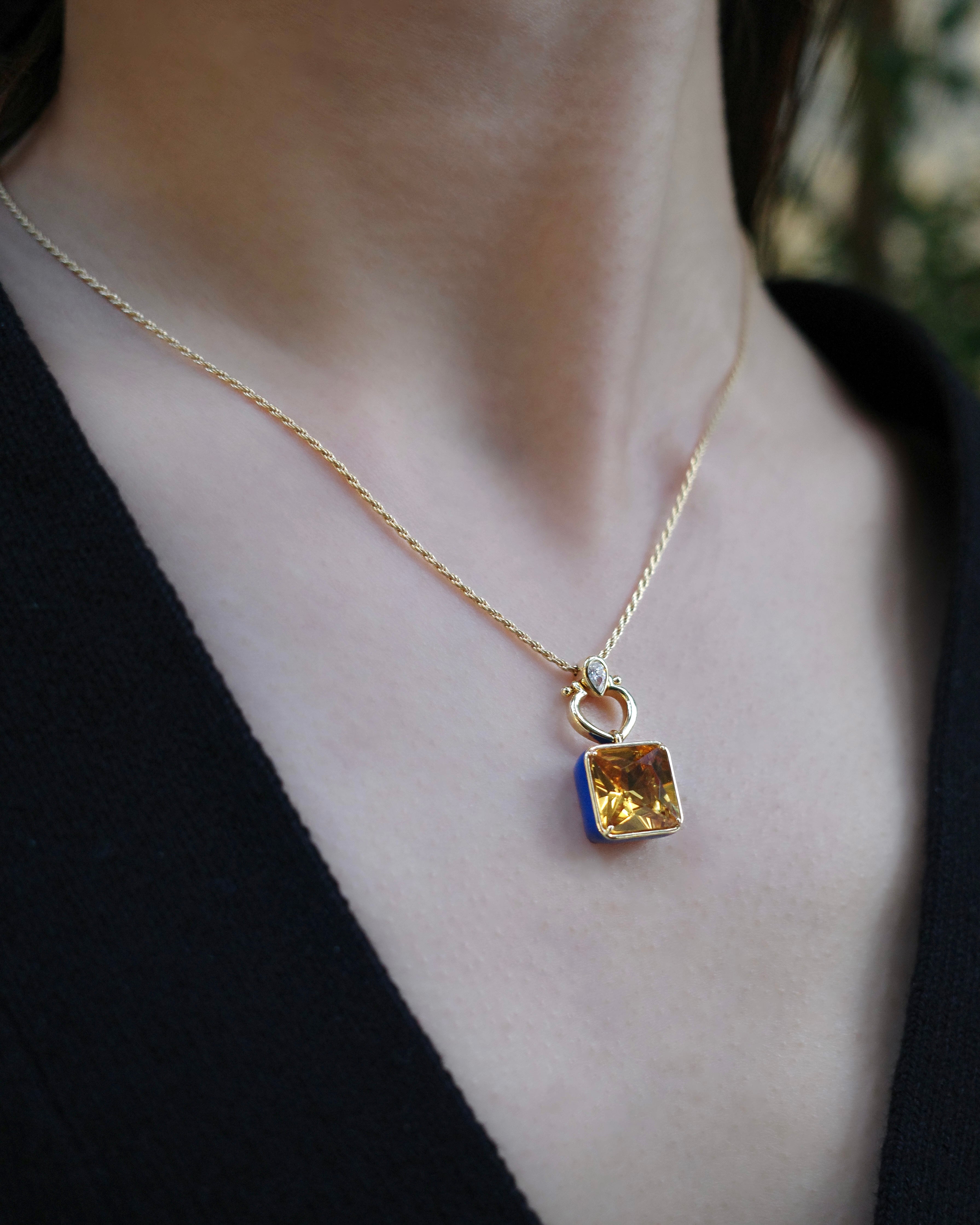 A yellow gold heart set with citrine swings from a pear-shaped diamond. The pendant, edged in vivid blue enamel, hangs from a rope chain, while the warm golden-yellow radiance of the citrine brings a brilliant touch of elegance to the neckline.