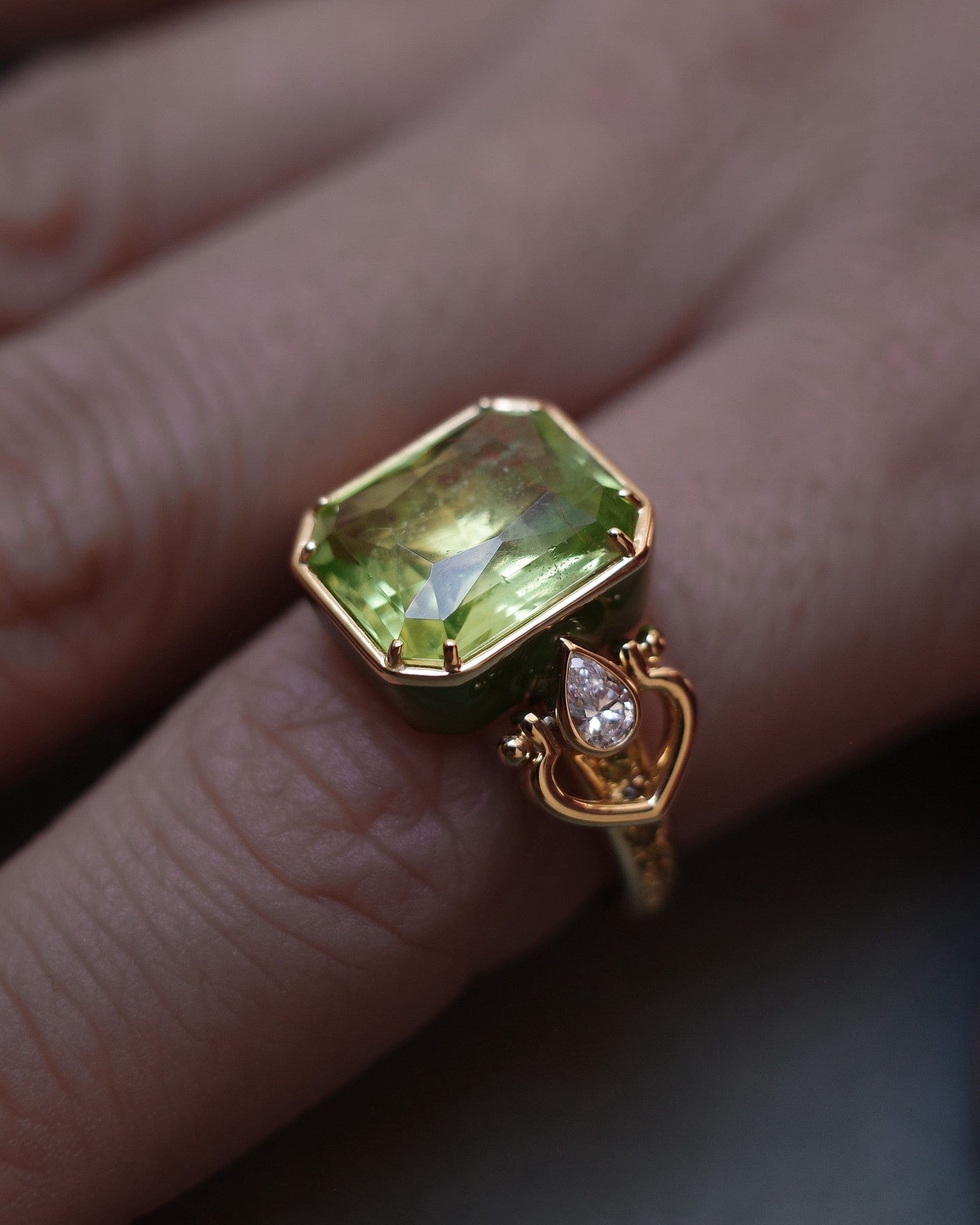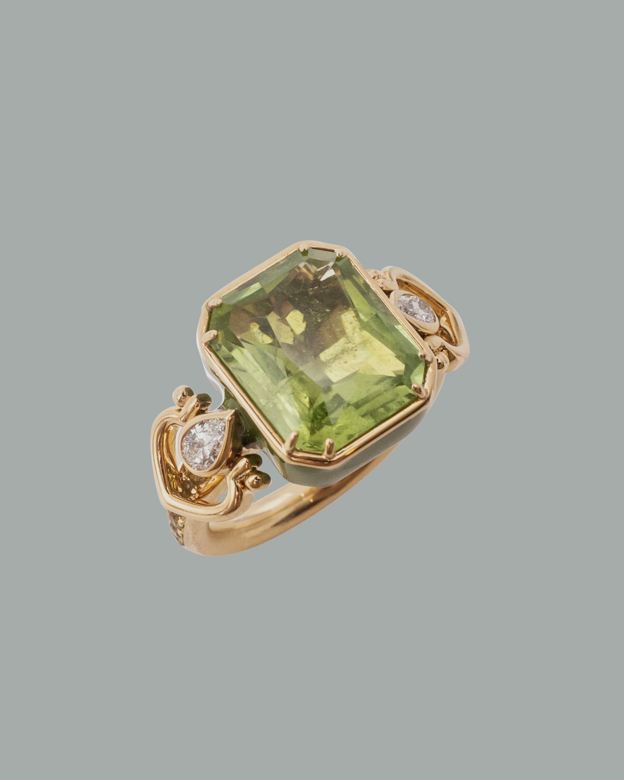 In this ring, a heart shaped yellow gold handle gently cradles a vivid rectangular cut peridot, with a single diamond set between the two “lovers.” The setting is encircled with vibrant green enamel, while emeralds along the band further illuminate the brilliance of the peridot.