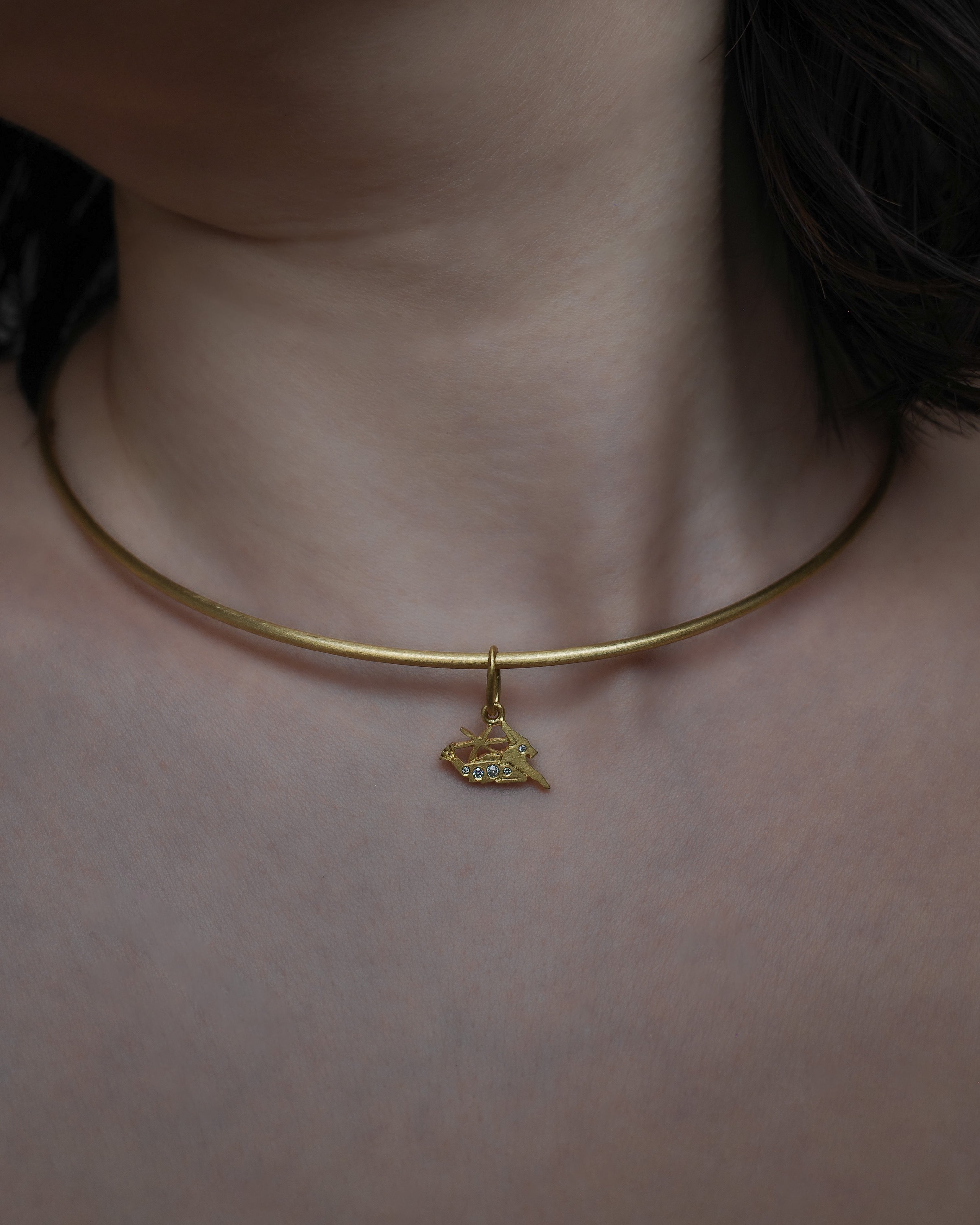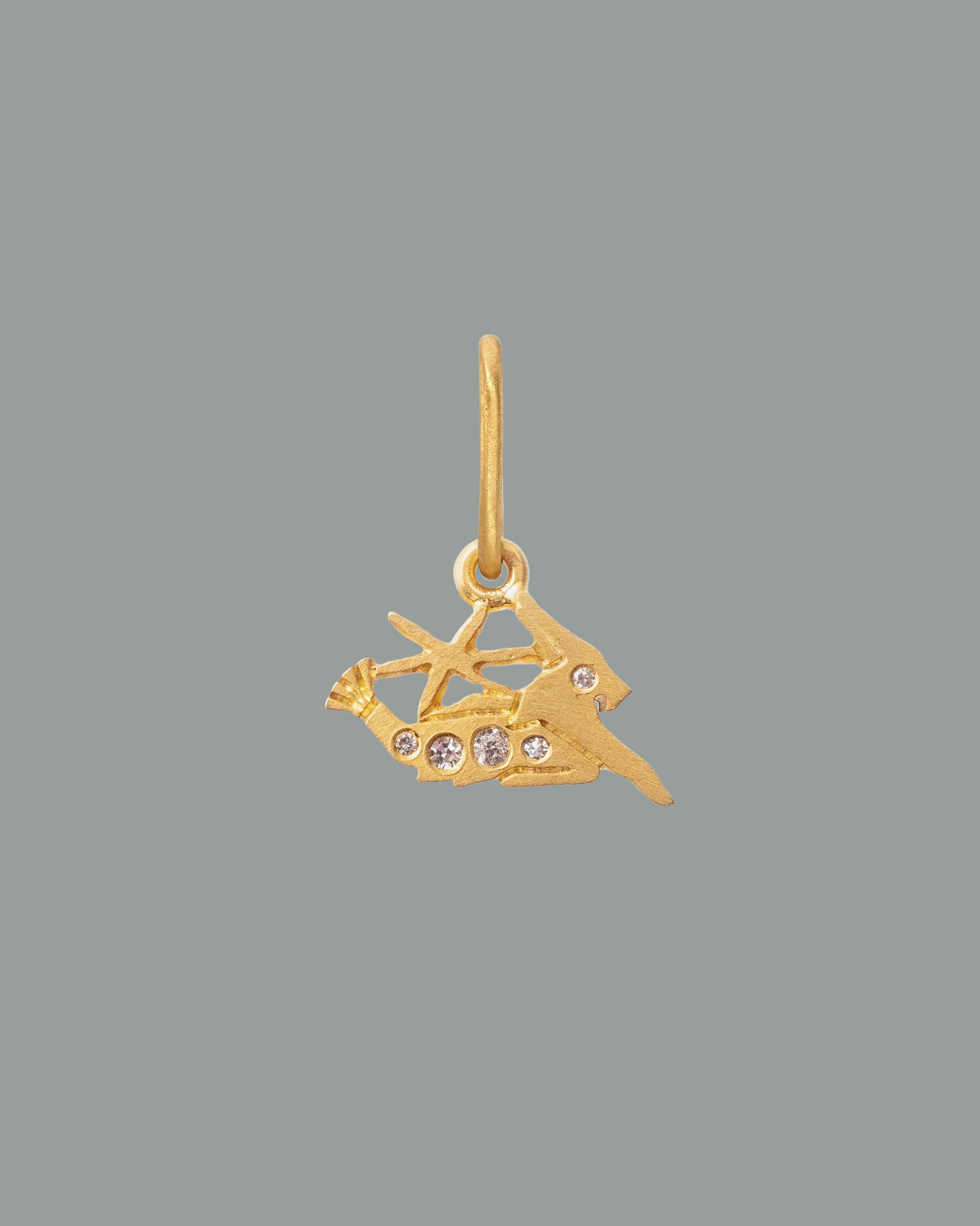 The Capricorn motif, crafted in 18K Fairmined gold and finished with a matte layer of 24K yellow gold, is set with antique Old Mine cut diamonds.