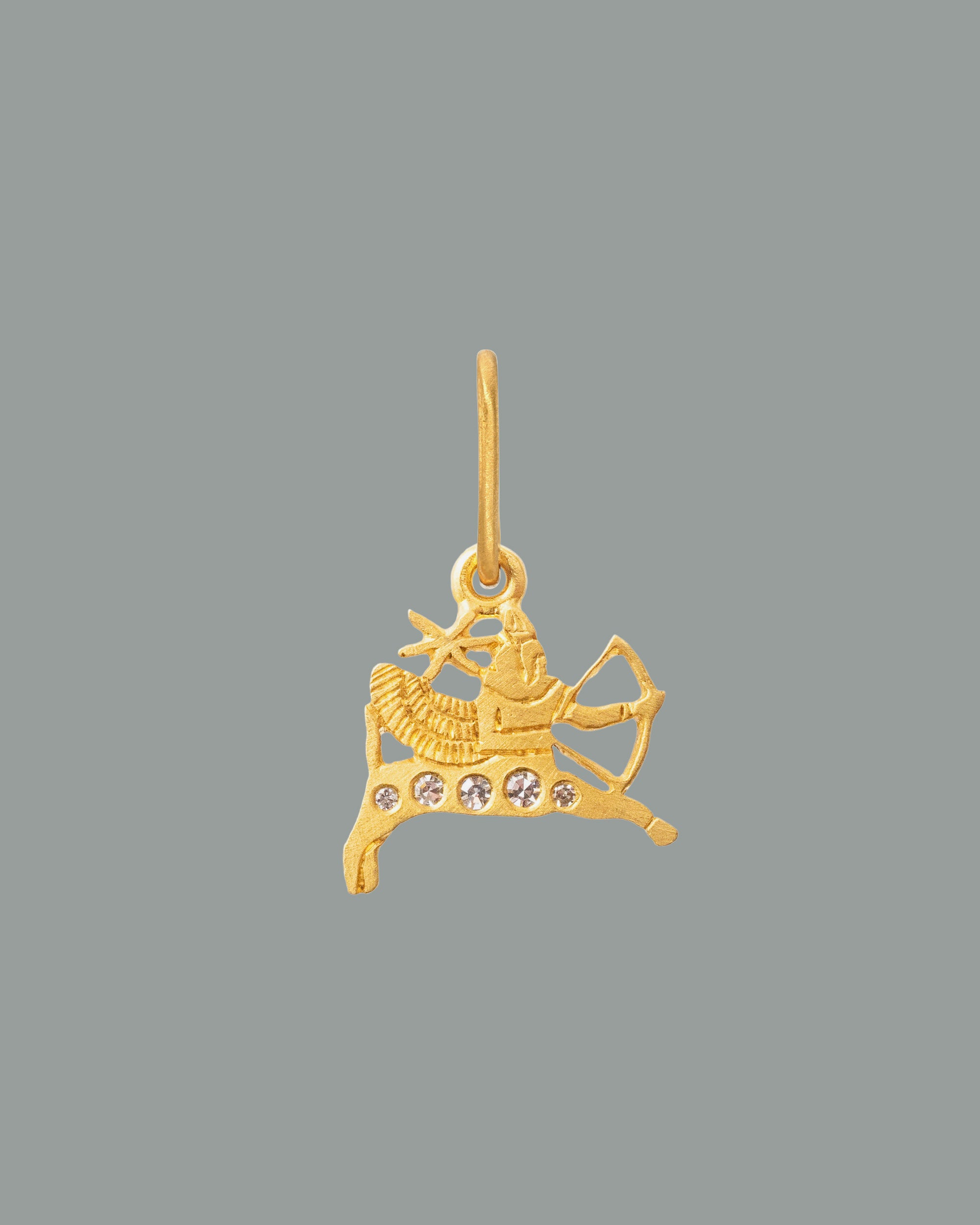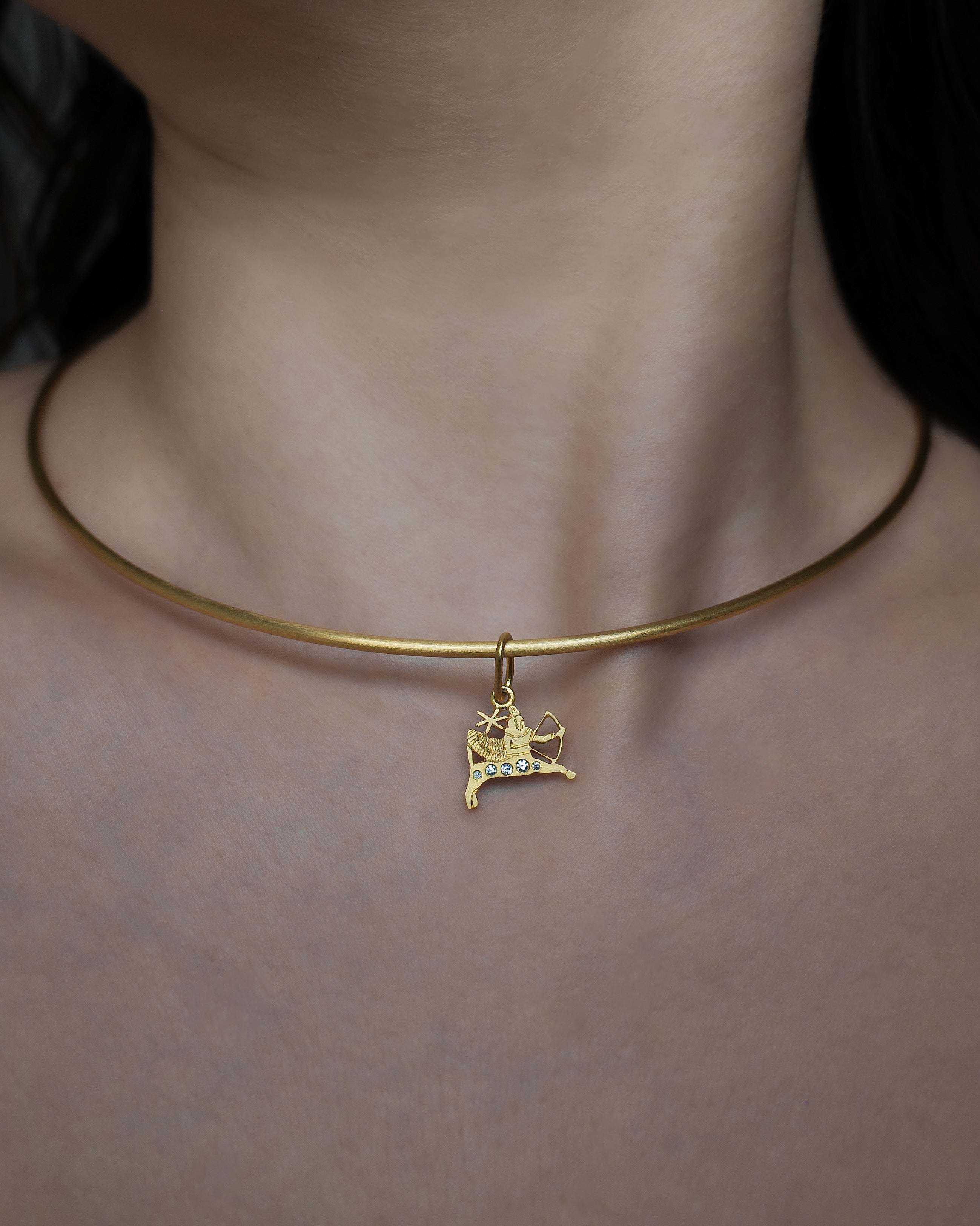 The Sagittarius motif, crafted in 18K Fairmined gold and finished with a matte layer of 24K yellow gold, is set with antique Old Mine cut diamonds.