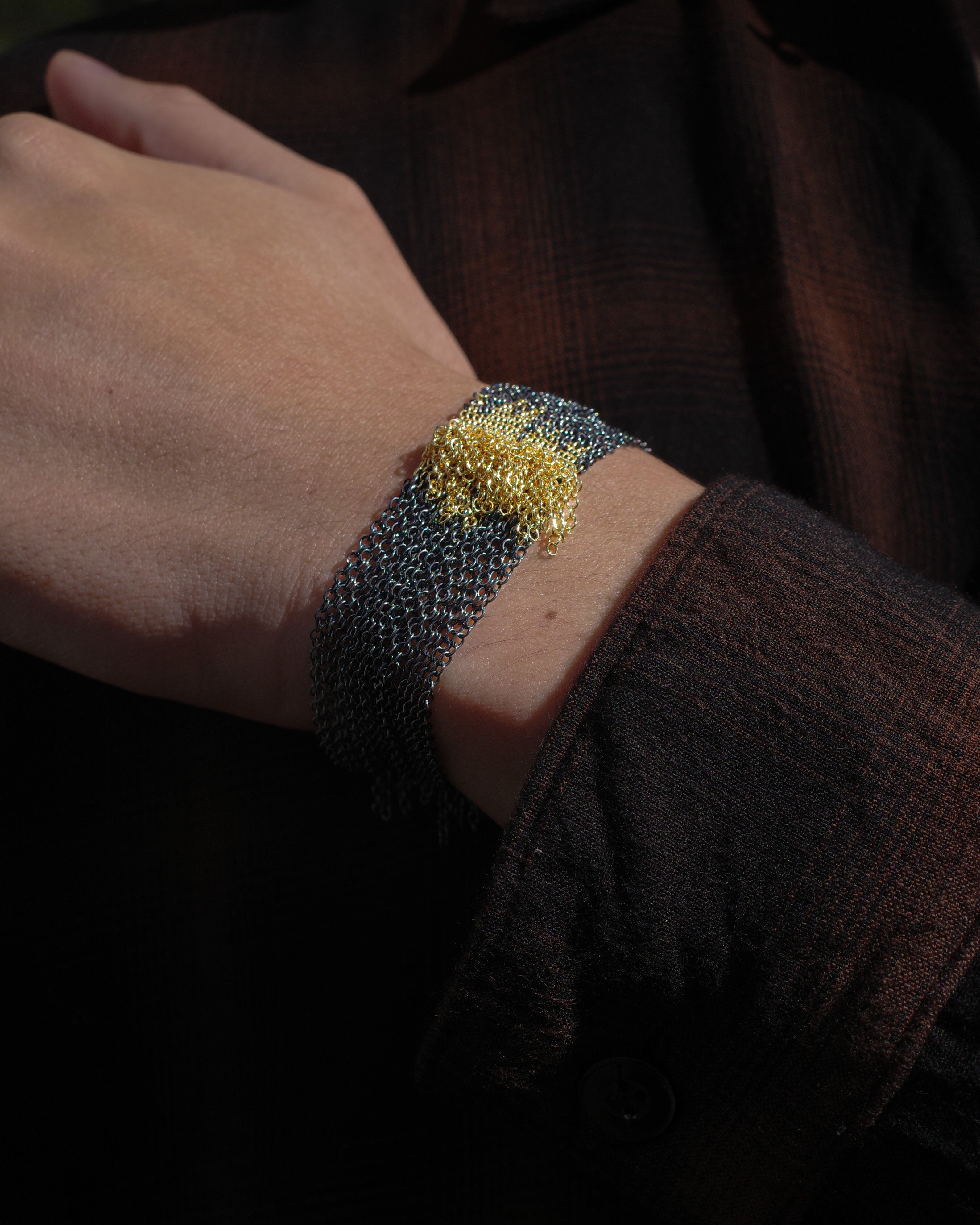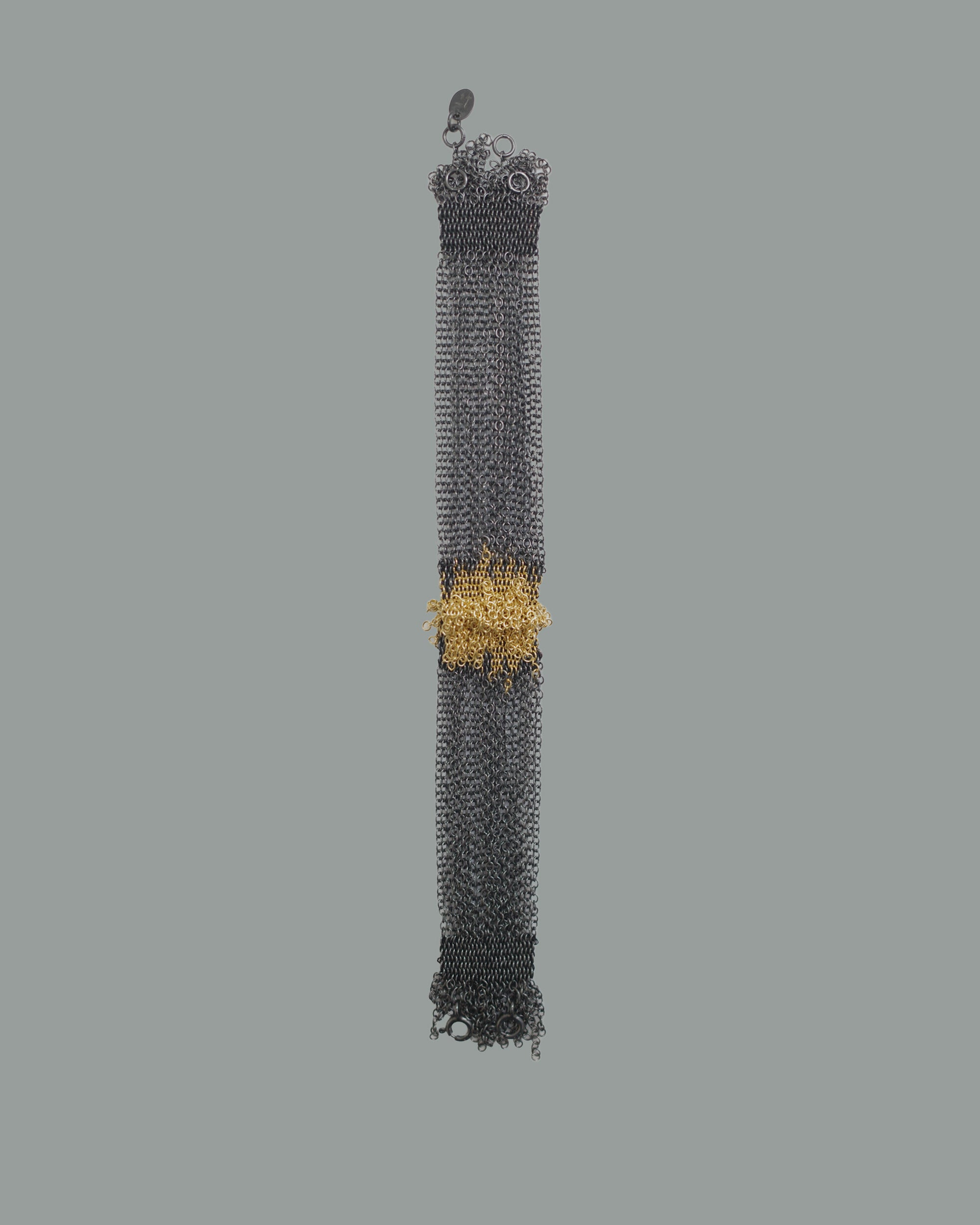 This bracelet is meticulously crafted using traditional artisanal techniques, featuring black silk woven with silver, an oxidized silver chain, and subtle accents of yellow gold that create a striking presence.