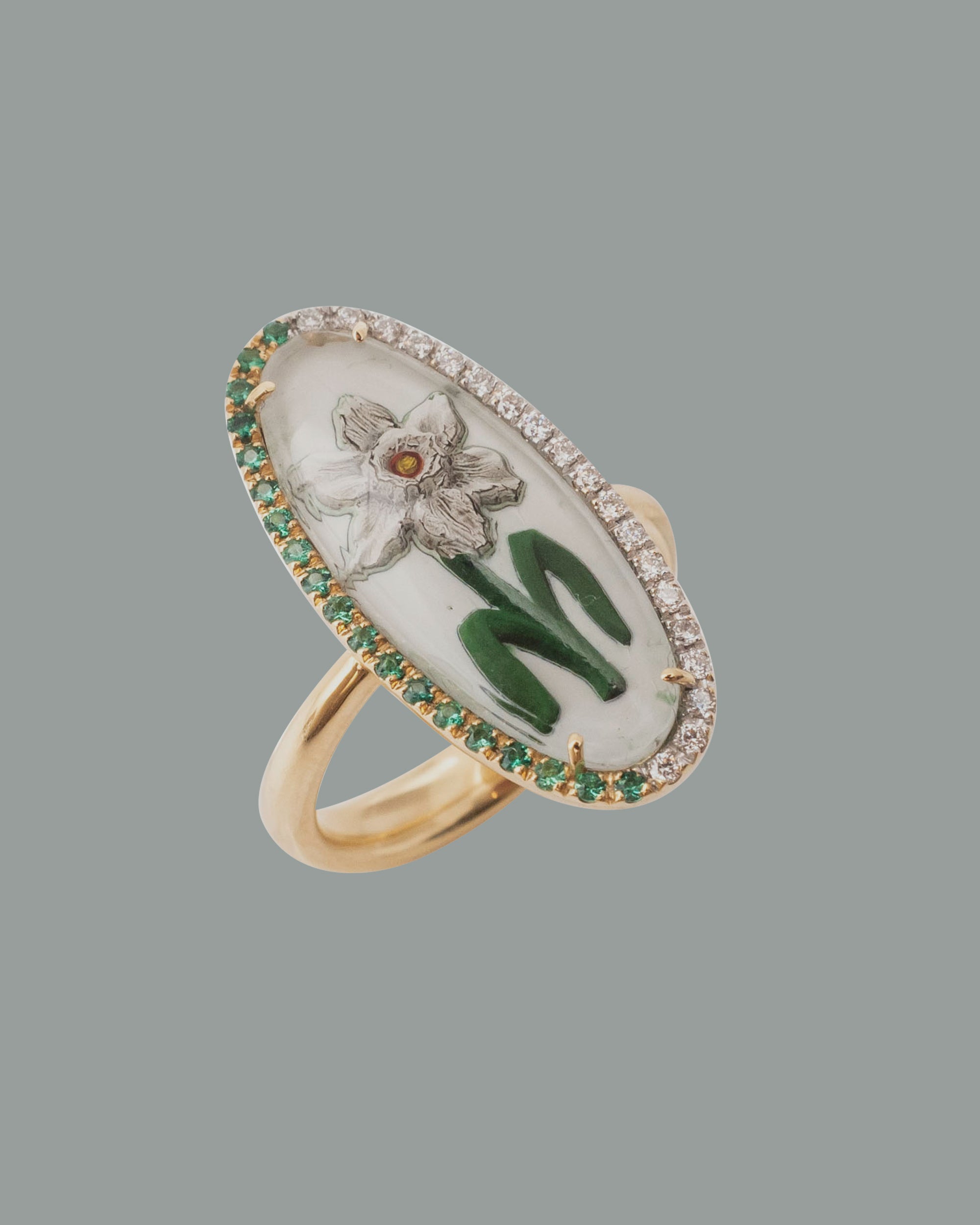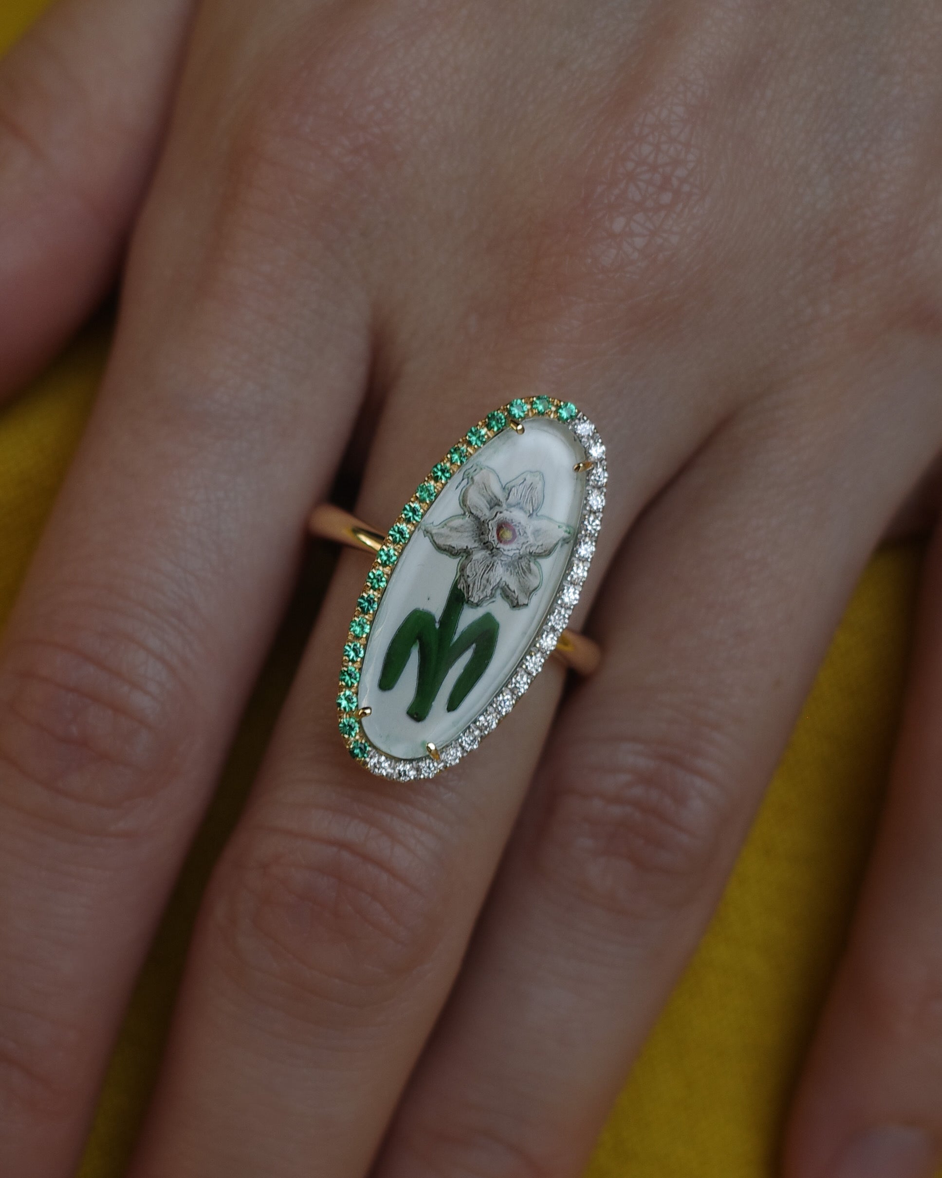 This ring from the GARDEN EDEN collection was born from her encounter with 1950s German flower resin. The flower resin, which captures a fleeting moment in nature, carries an air reminiscent of a modern interpretation of Essex crystal. The crystal resin featuring an orange blossom is set in 18K yellow gold and paired with emeralds and diamonds, giving the piece the presence of a miniature work of art. On the reverse side, a delicate engraved pastoral scene adds a layer of storytelling down to the finest detail.