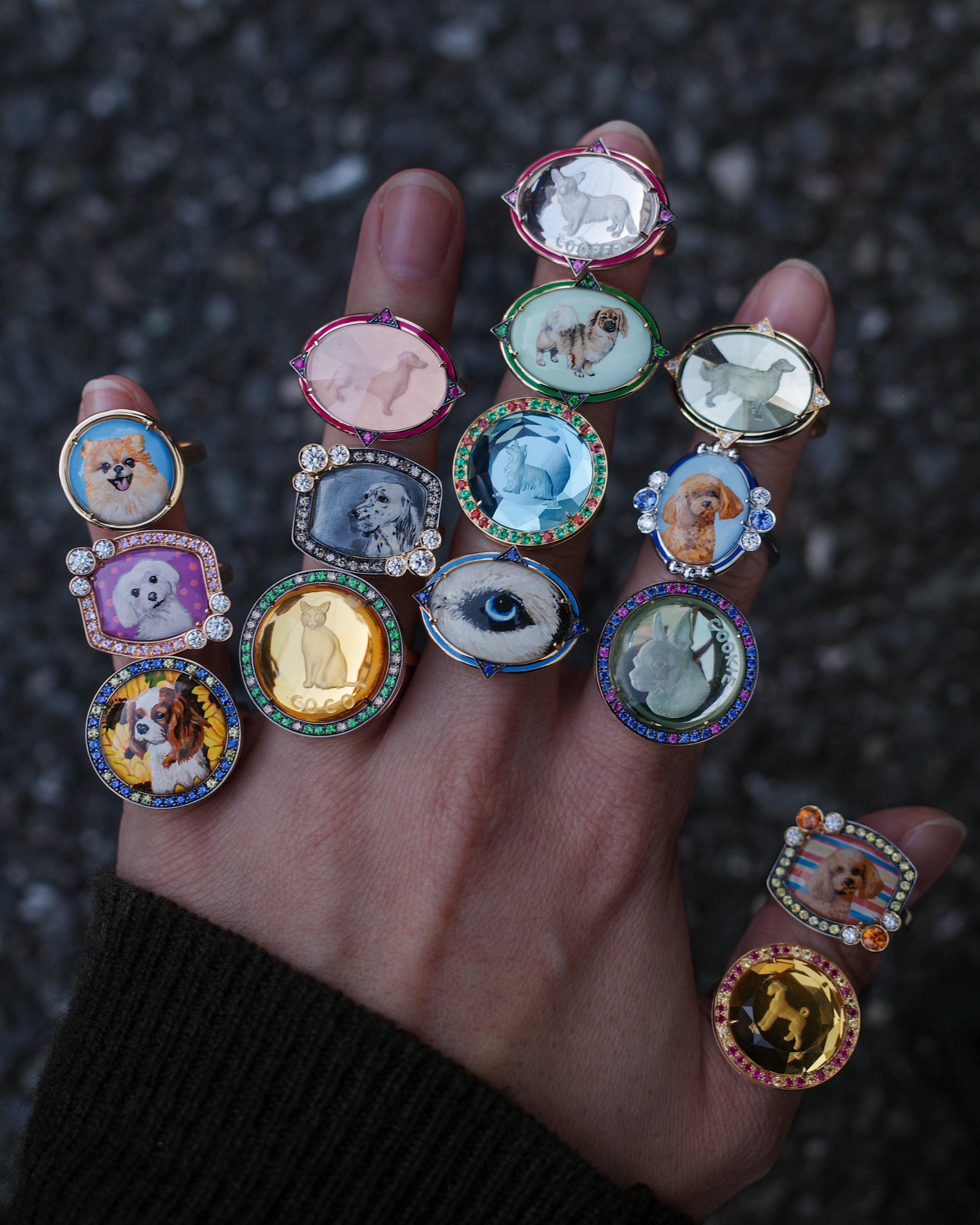 These portraits are then intricately engraved onto crystal by skilled German artisans and delicately painted by master carvers. Finally, the pieces are set in Francesca’s atelier, adorned with vibrant gemstones. This collection allows you to choose from necklace, ring, or pendant top designs, and customize the gemstones and color palette to create a one-of-a-kind jewel that is truly personal.