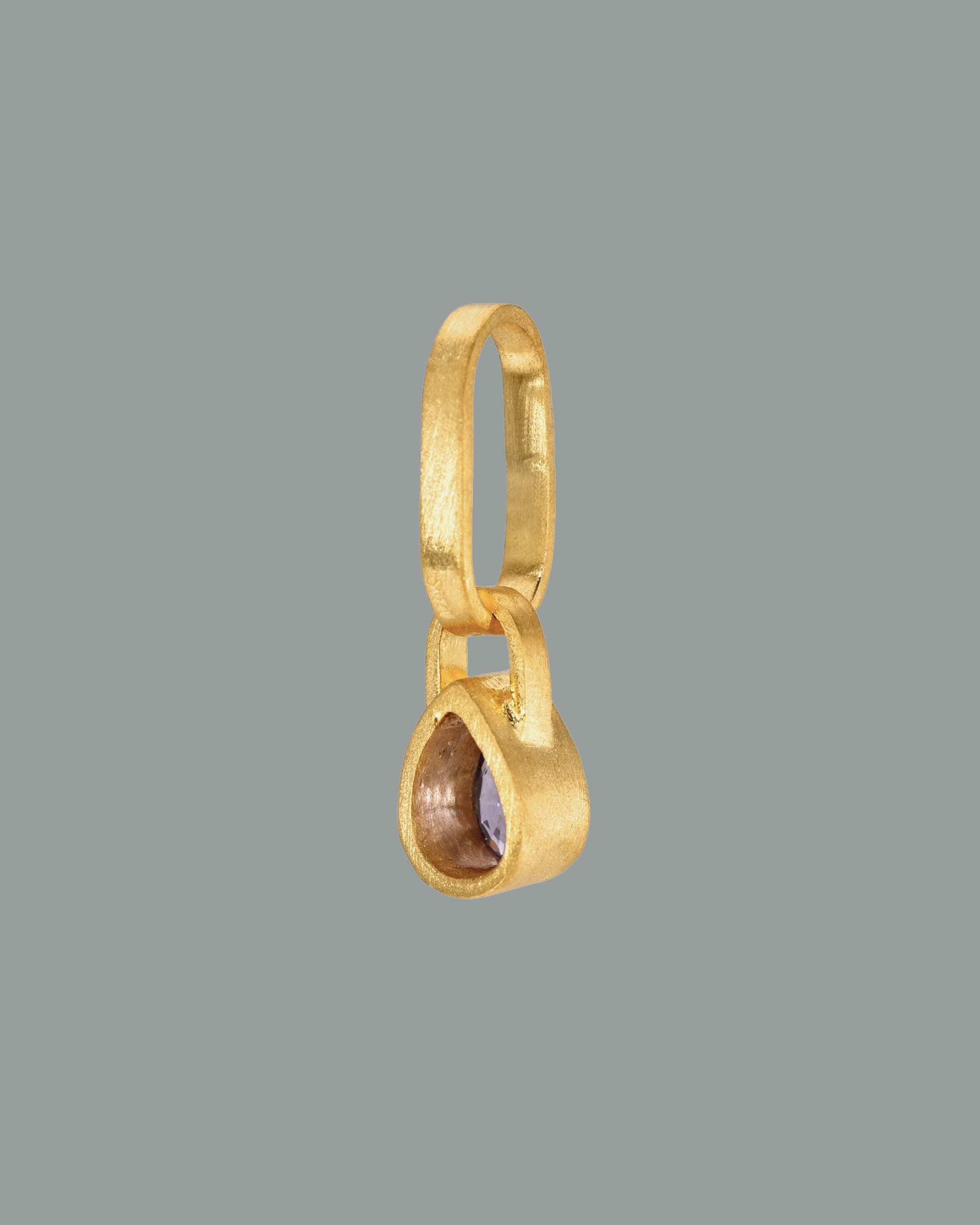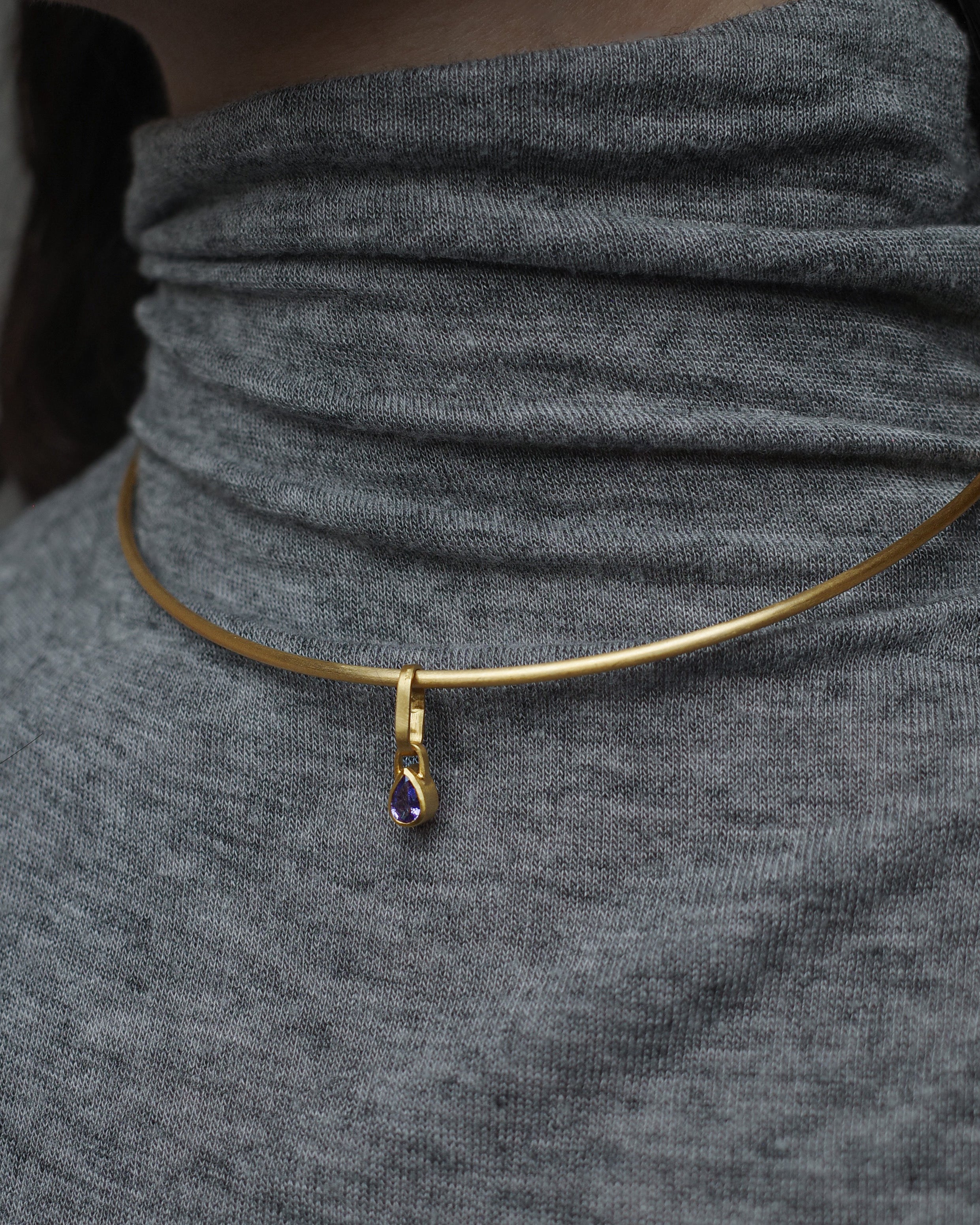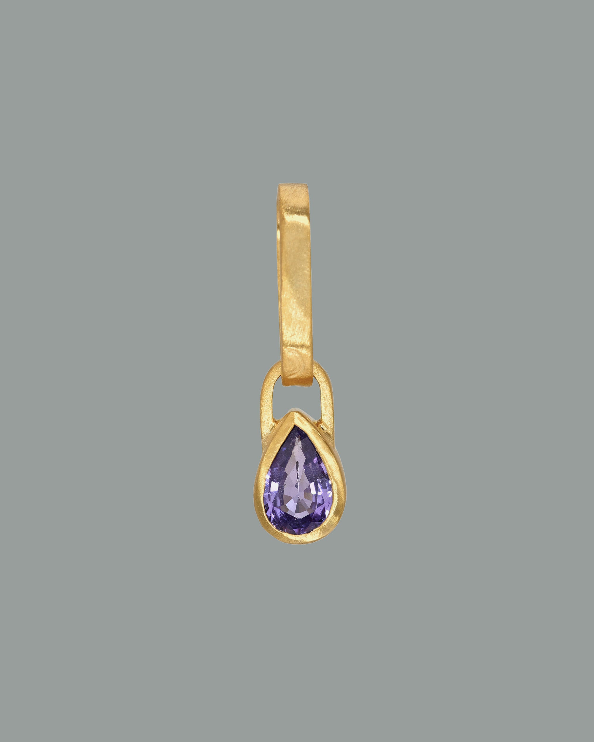 This pendant features a pear-shaped purple sapphire set in 18K Fairmined gold. Each piece is individually handcrafted in Los Angeles by master goldsmiths.