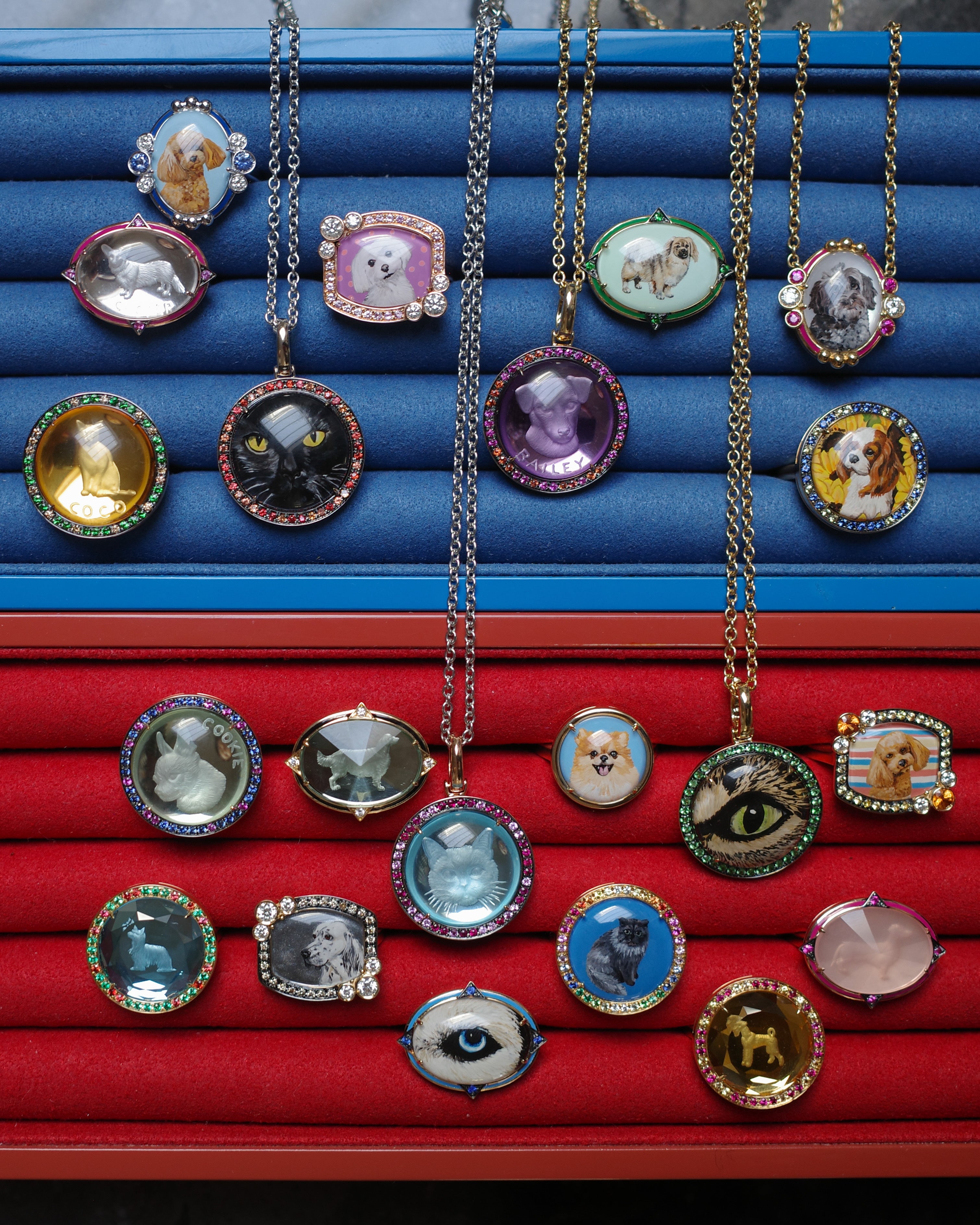 These portraits are then intricately engraved onto crystal by skilled German artisans and delicately painted by master carvers. Finally, the pieces are set in Francesca’s atelier, adorned with vibrant gemstones. This collection allows you to choose from necklace, ring, or pendant top designs, and customize the gemstones and color palette to create a one-of-a-kind jewel that is truly personal.