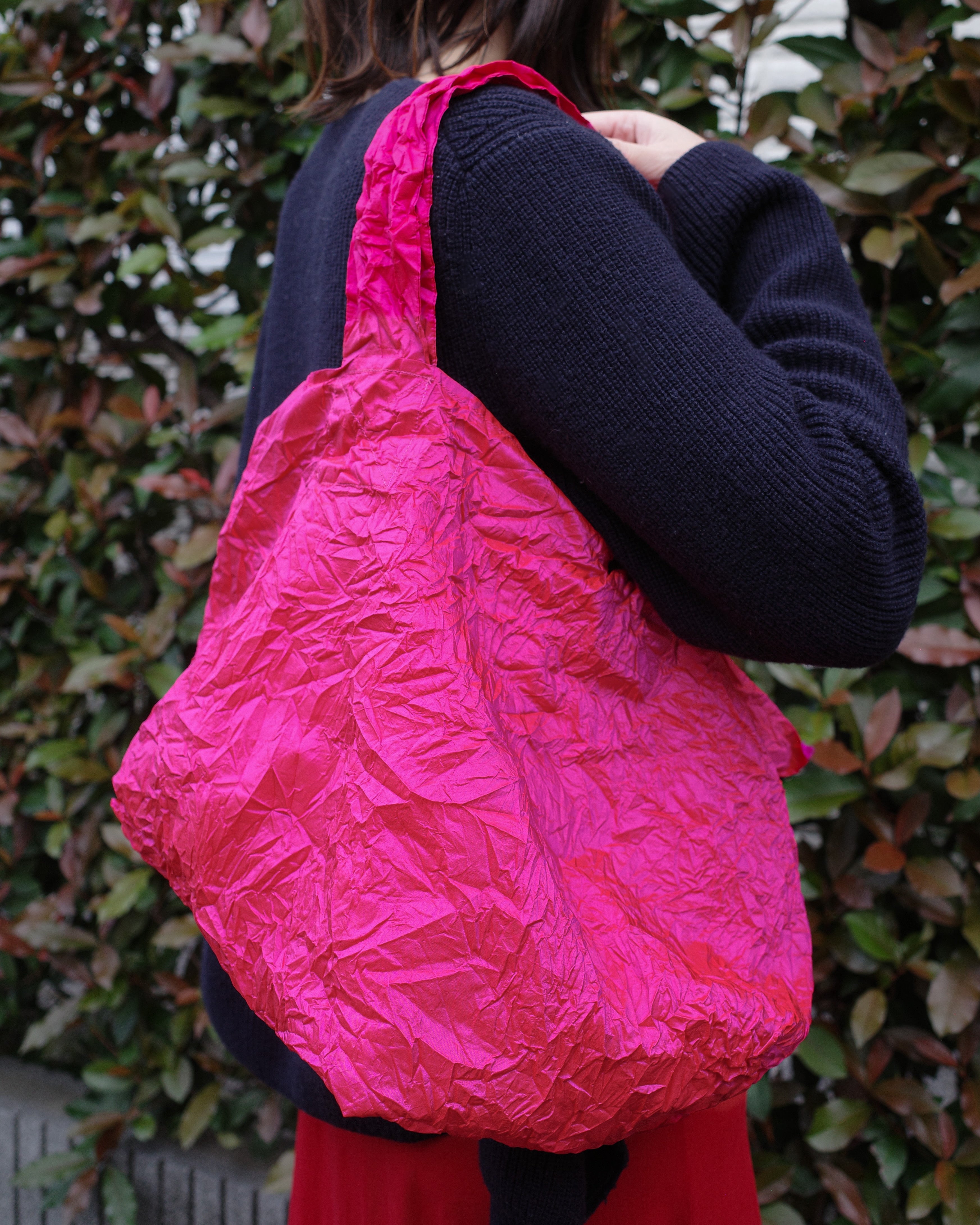 A handwoven basket designed from a fashion brand’s unique perspective brings a gentle yet distinctive presence to everyday life. The vivid pink silk cover, reminiscent of fuchsia flowers, is removable, allowing both the basket and the cover to be used independently.