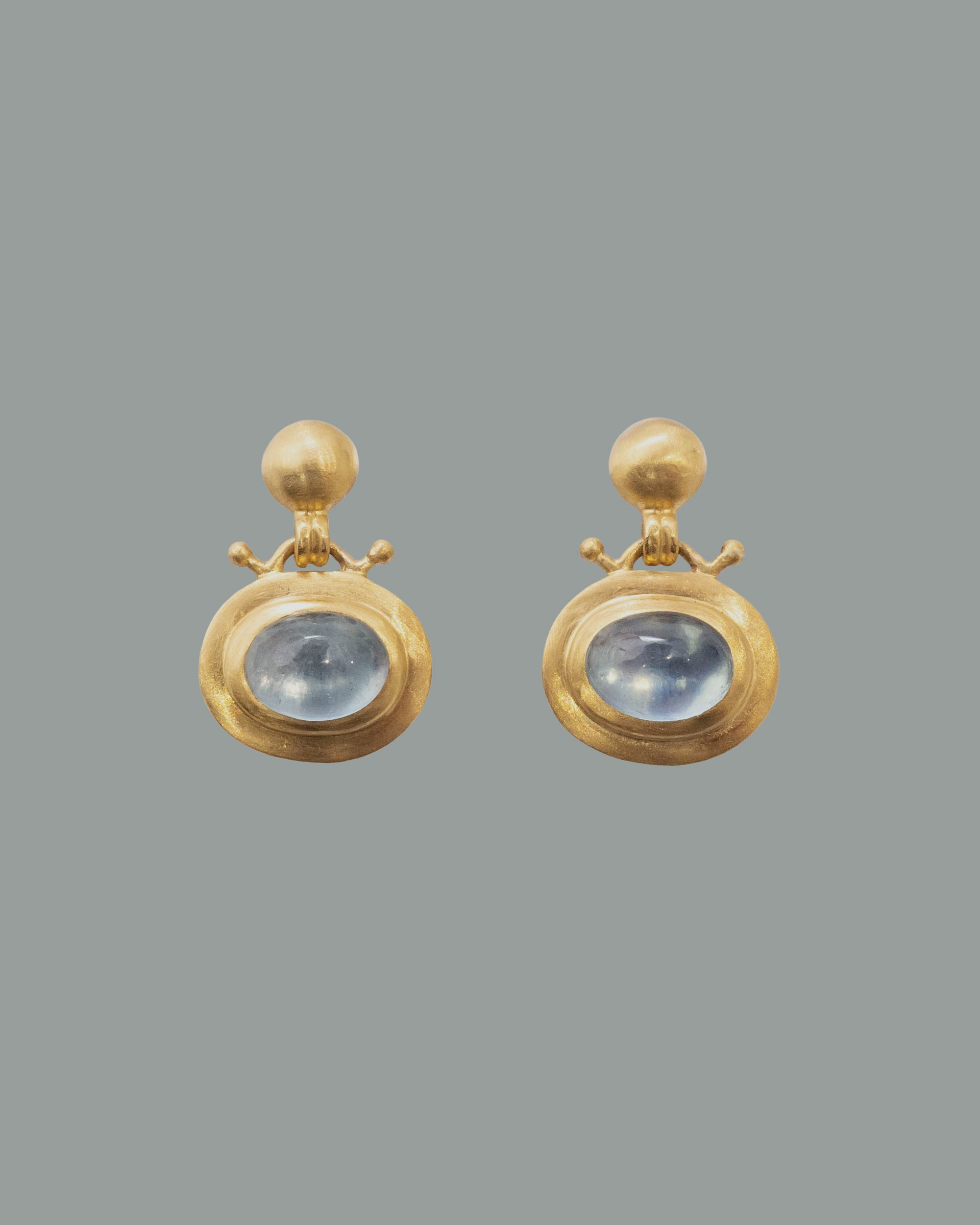 A cabochon-cut aquamarine is gently embraced by a small gold granule, whose form is derived from bell-shaped vessels of ancient Greece.