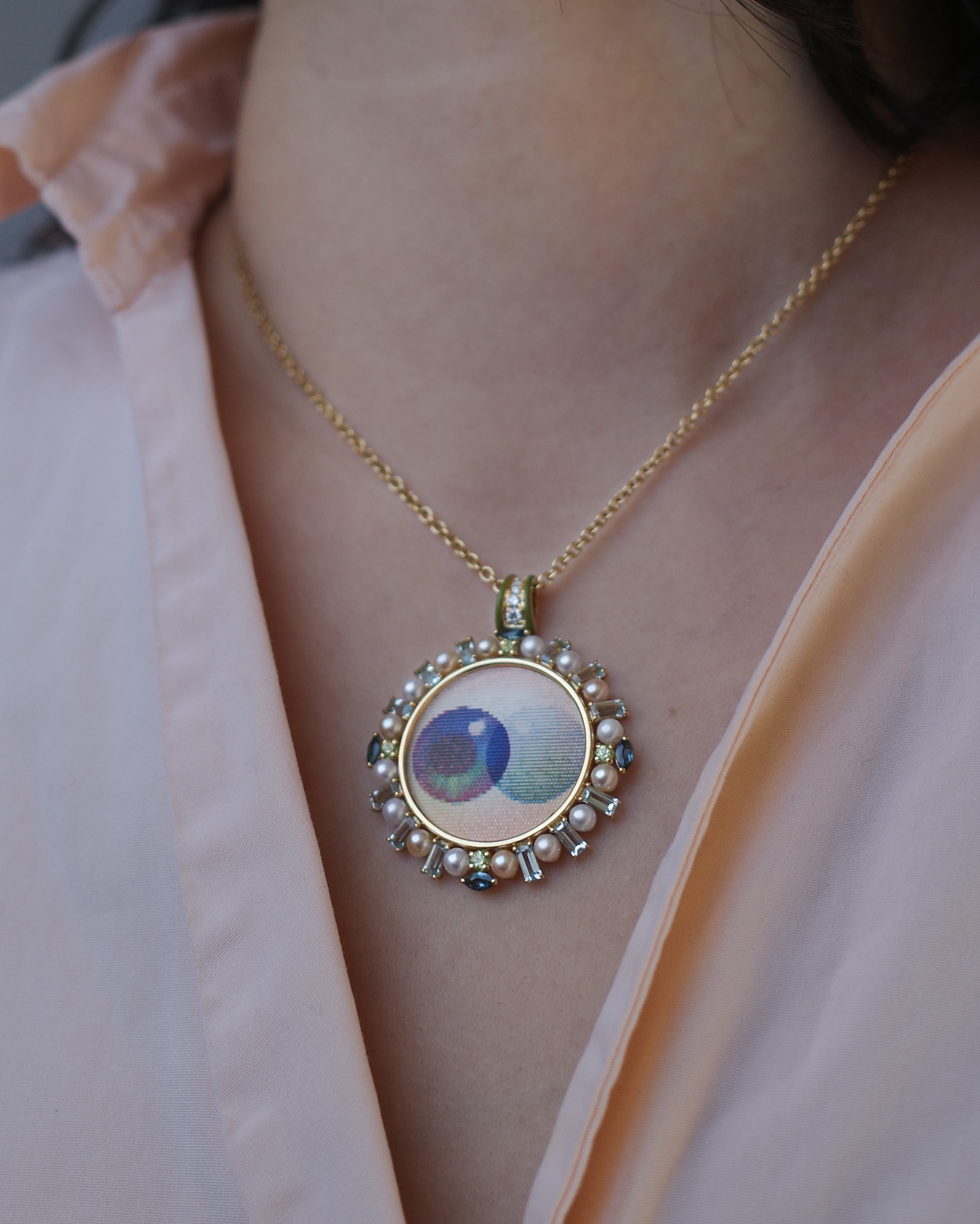 Surrounding the all-seeing lenticular image are baguette cut topazes, pearls, and tsavorites. The bail is adorned with diamonds, while vivid green enamel adds a bold accent. With even the slightest motion, the eye appears to glance around the room, bringing the pendant to life in a wonderfully surprising way.