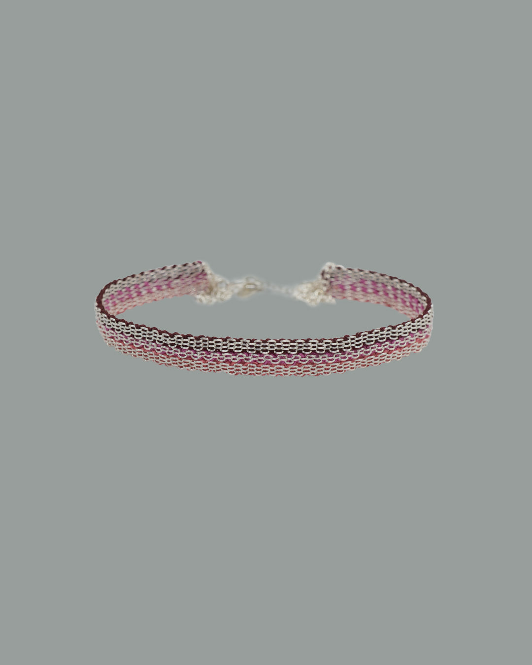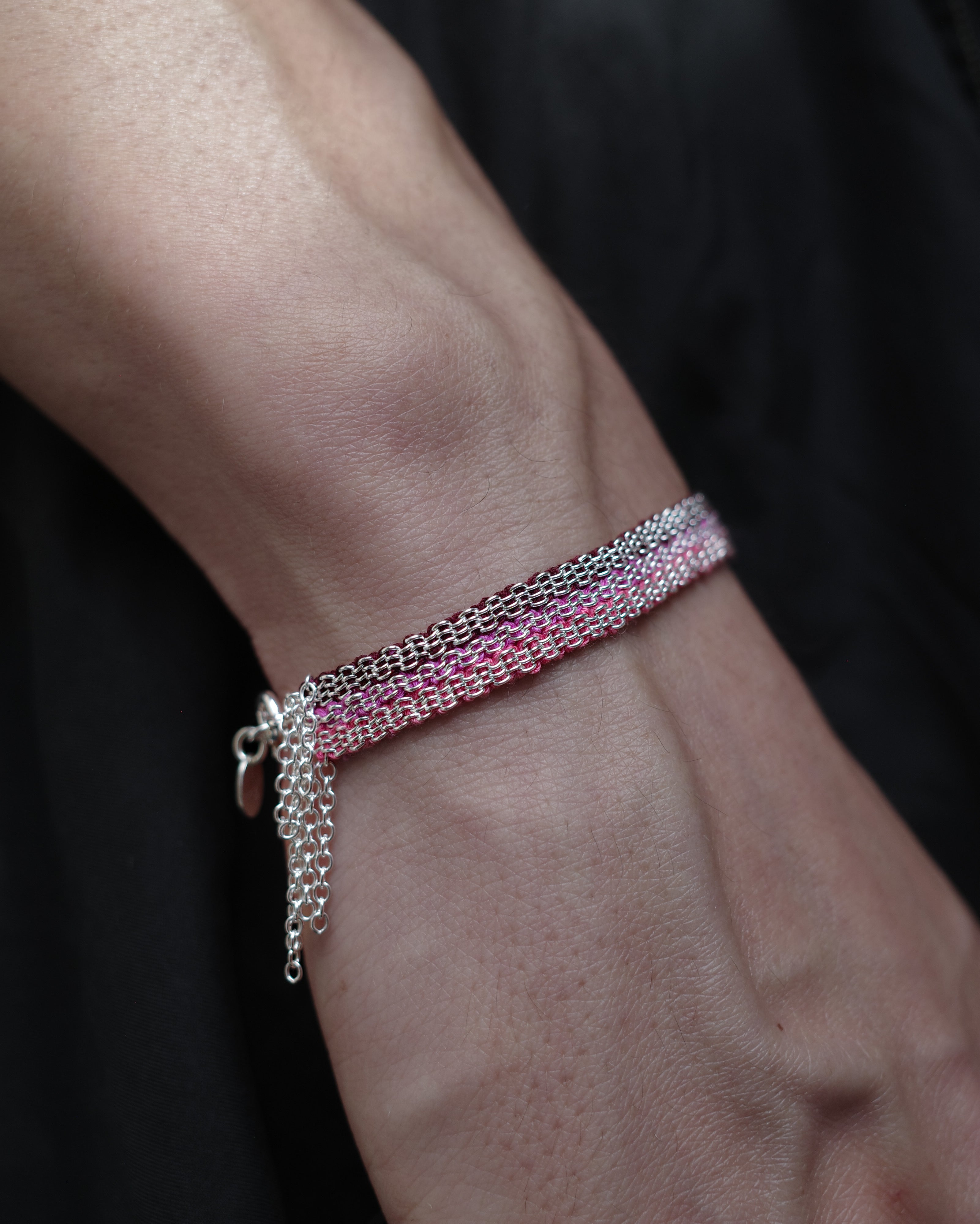 Silver textures are intricately woven into pink, red and black silk adding an elegant radiance to the wrist.