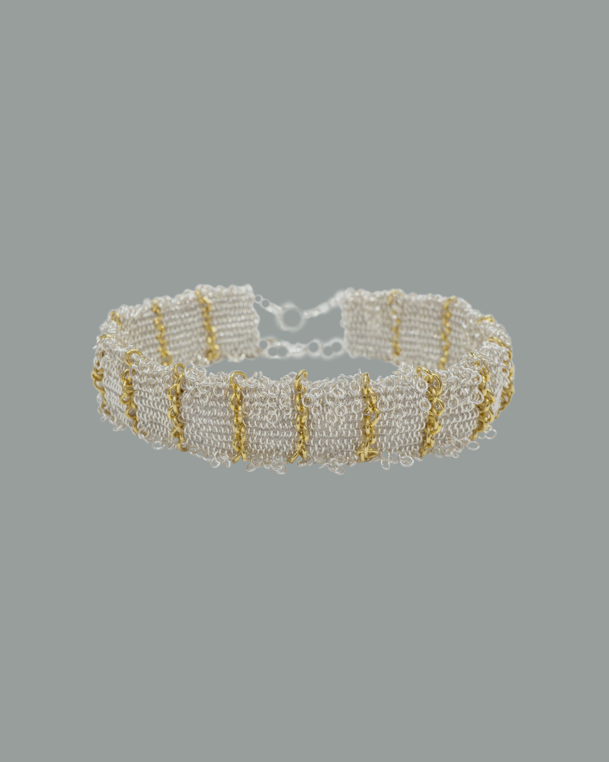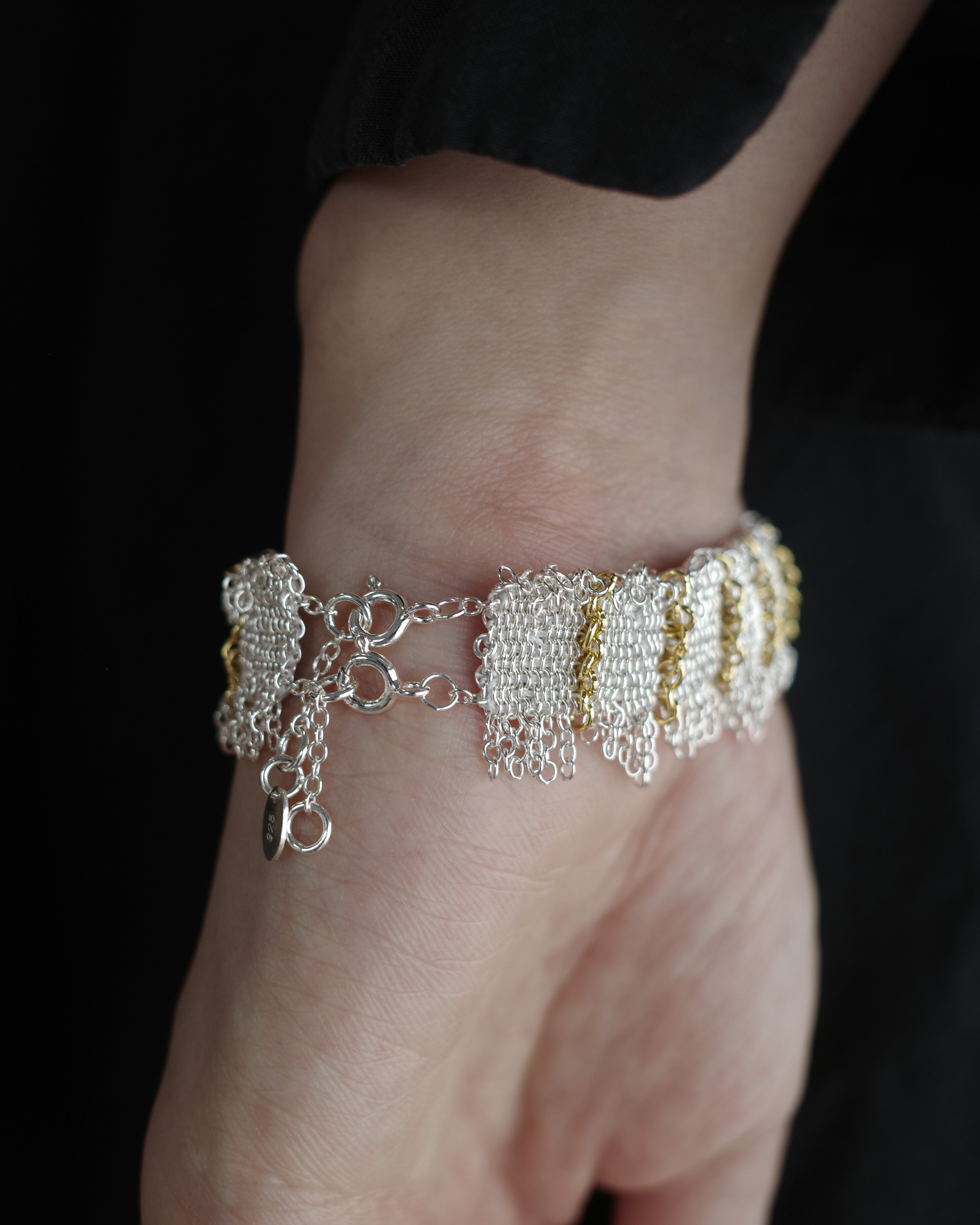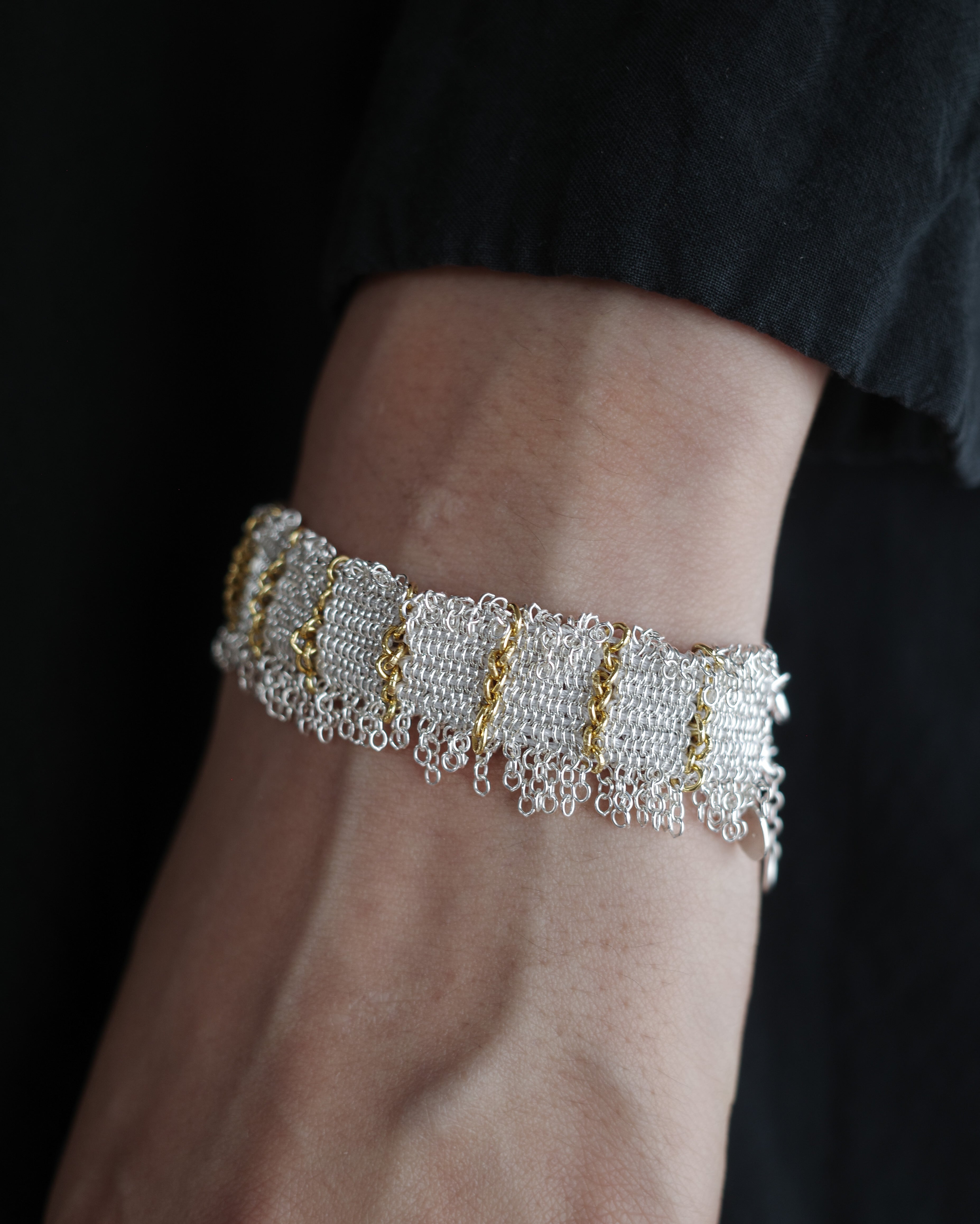 Silver textures are intricately woven into silk, complemented by delicate accents of yellow gold that add an elegant radiance to the wrist.