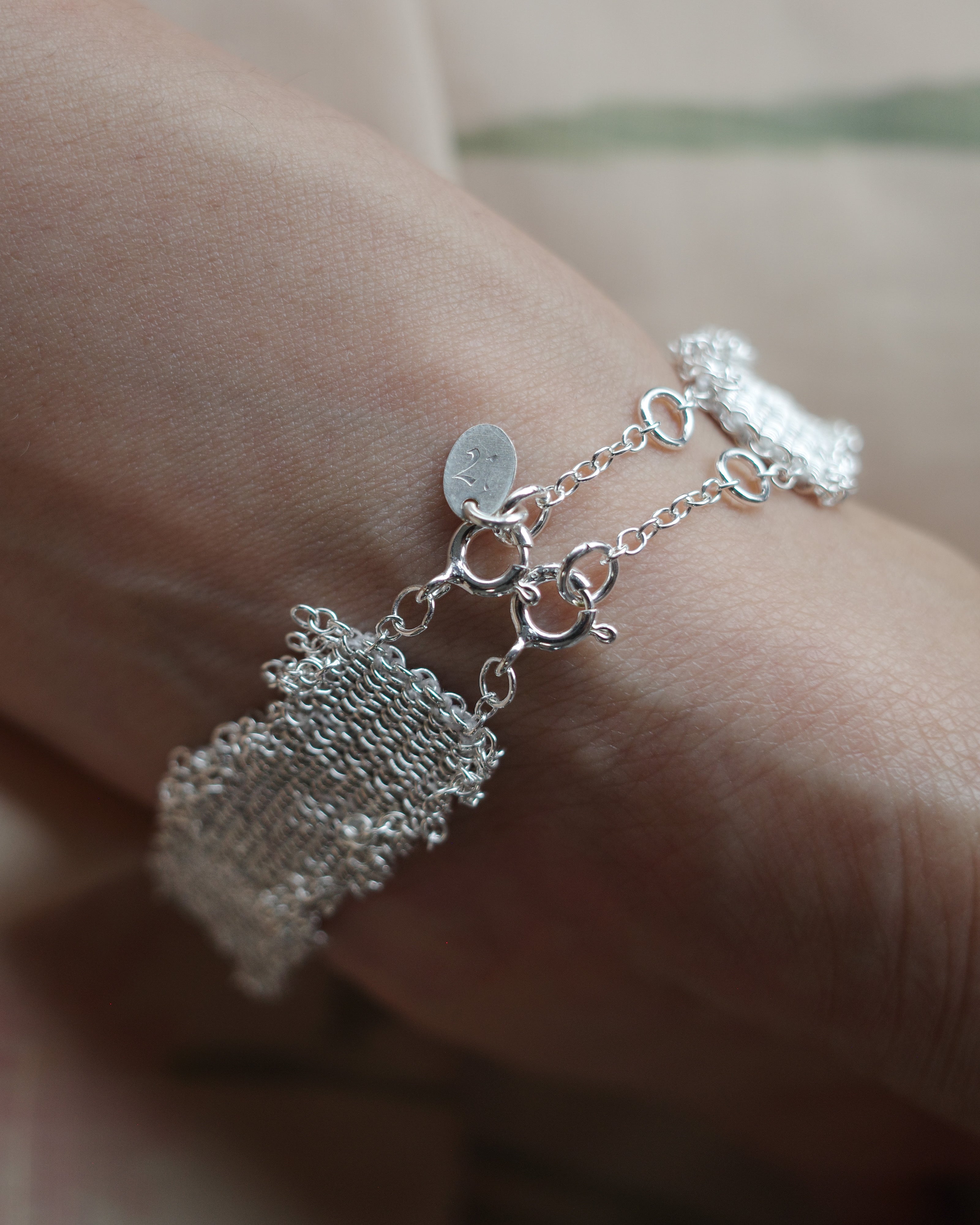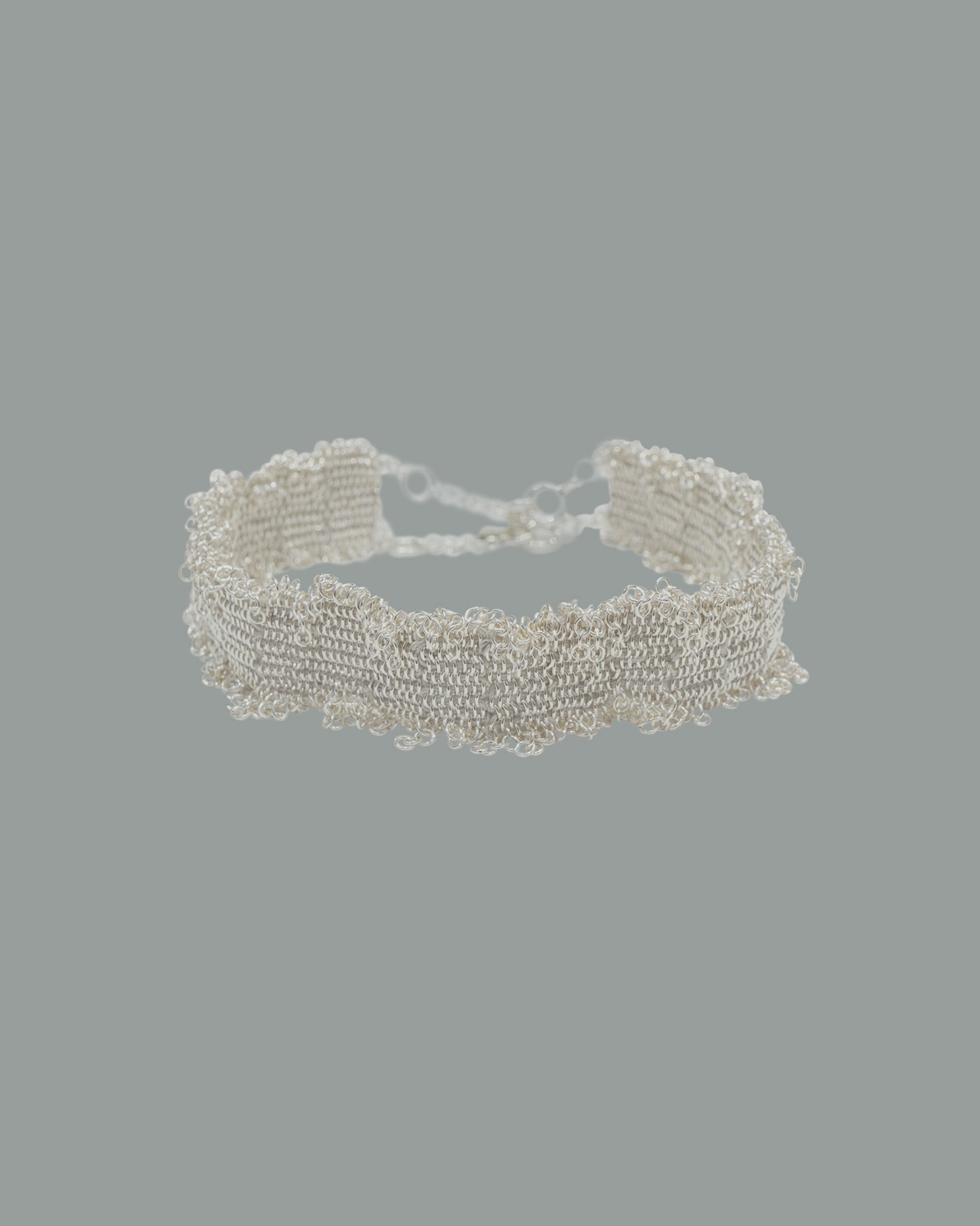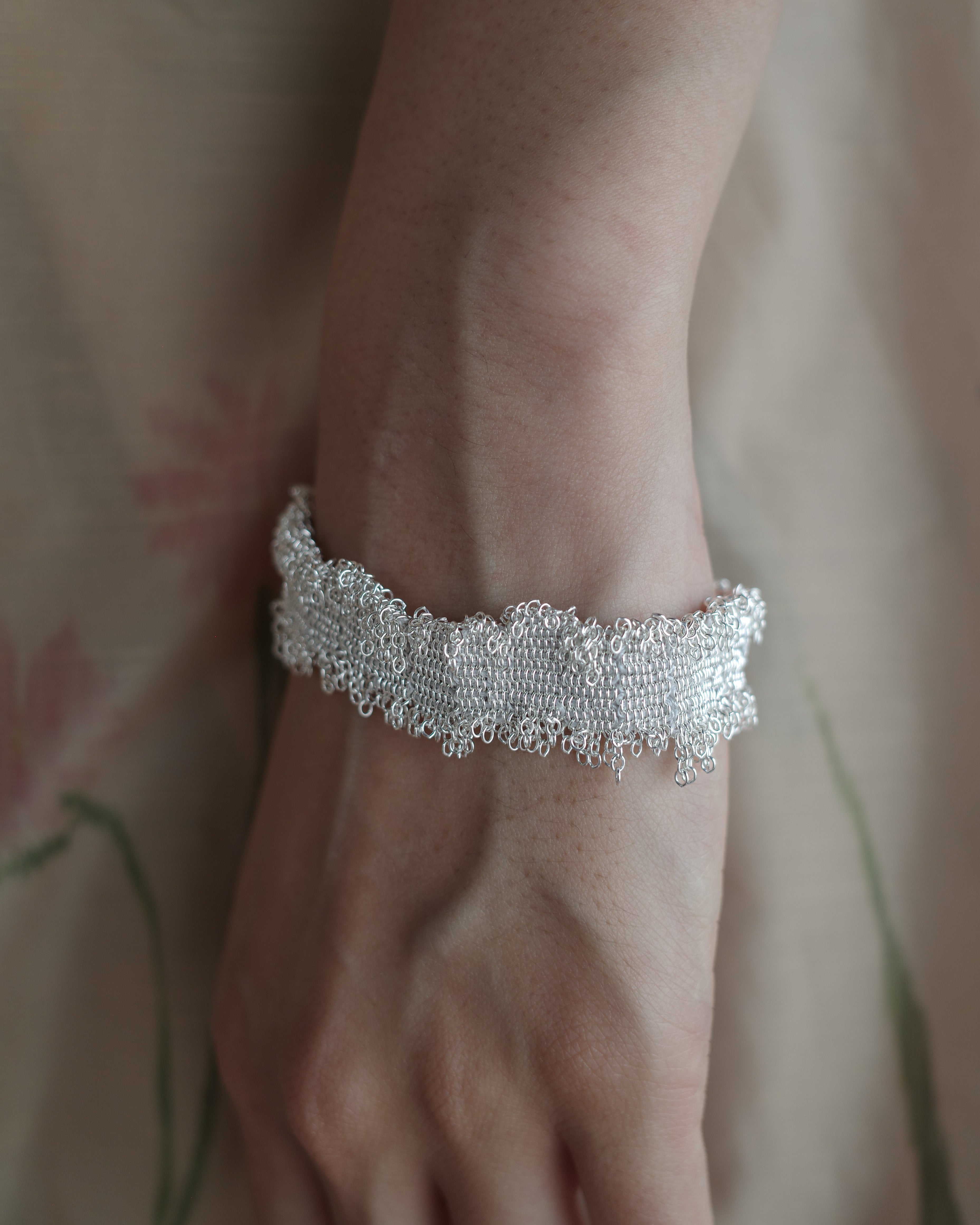 Silver textures are intricately woven into silk adding an elegant radiance to the wrist.