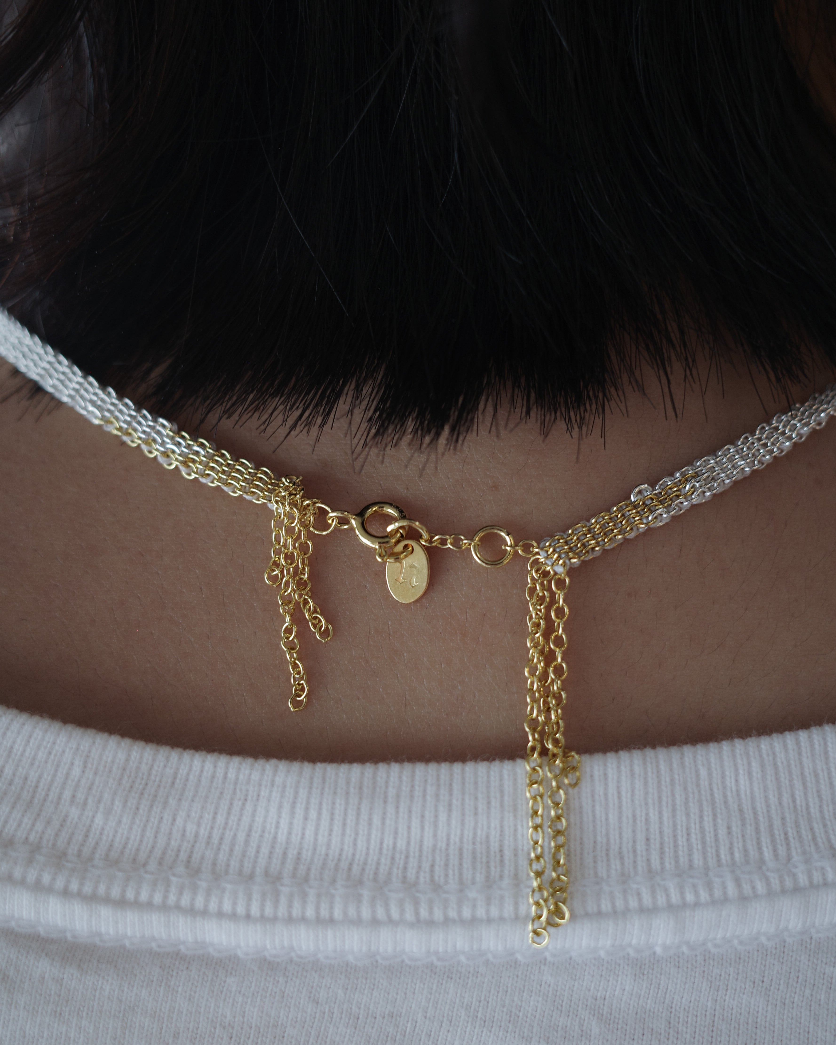 This wide string necklace is meticulously crafted using traditional artisanal techniques, displaying a refined shimmer.