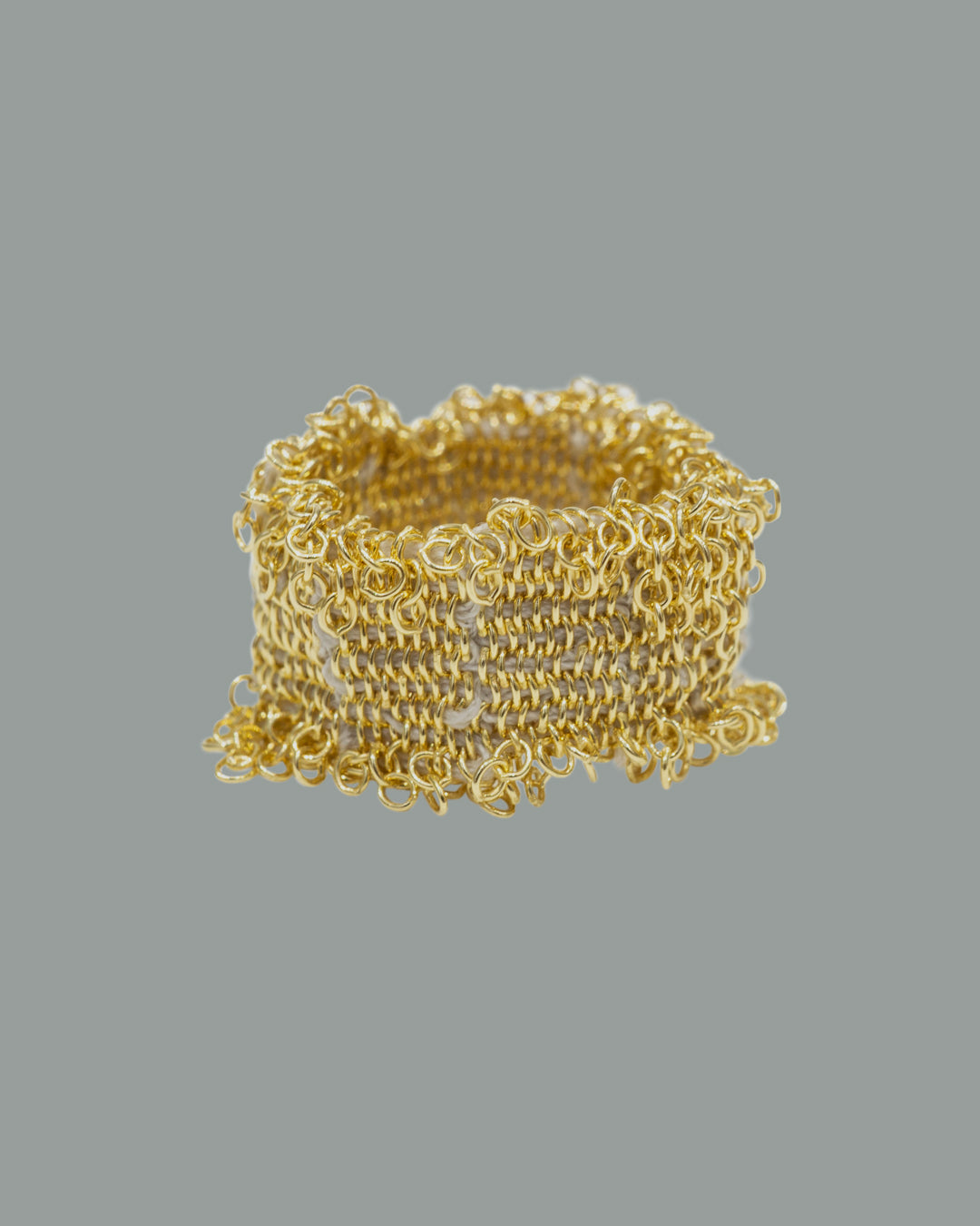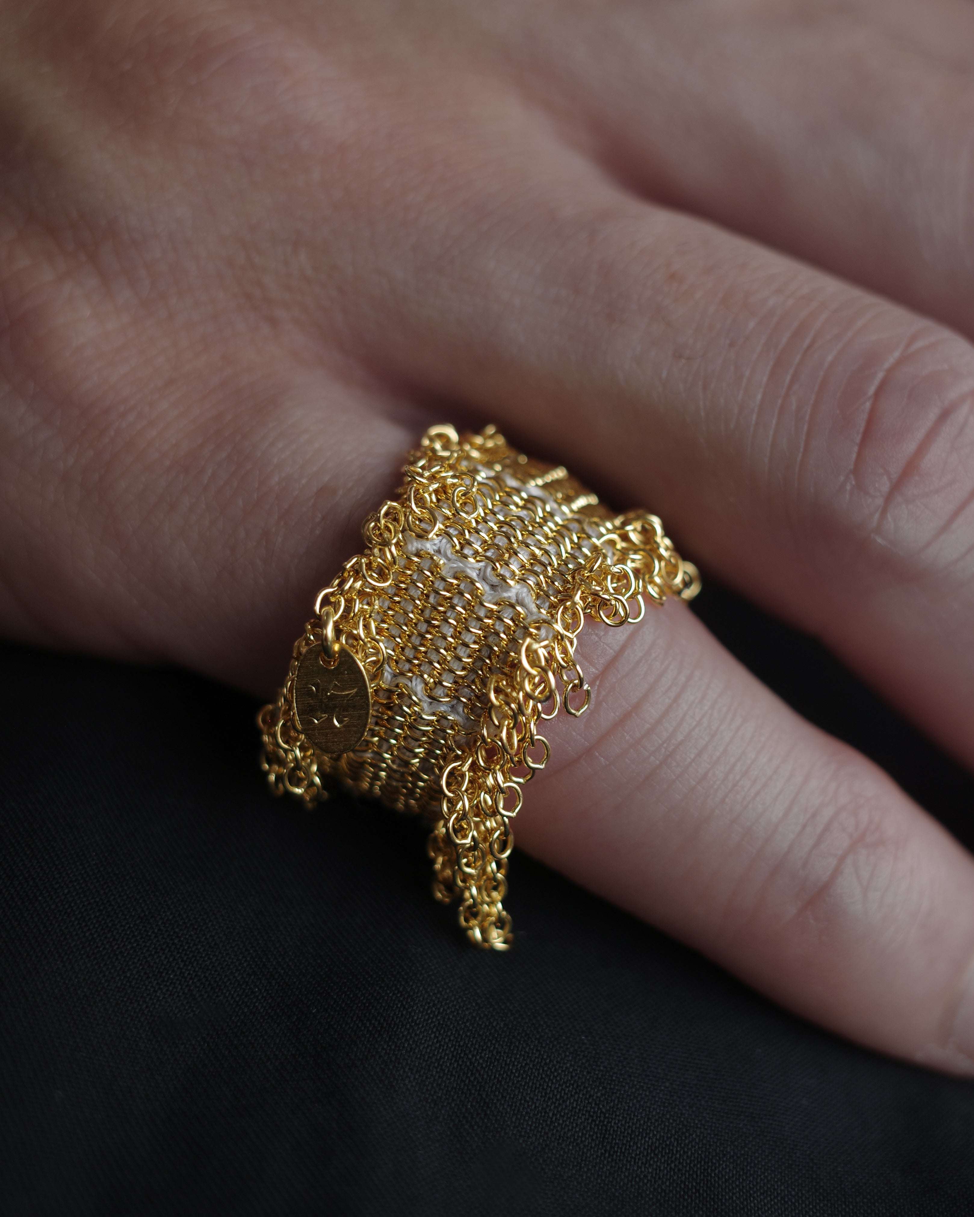 This wide woven string ring is meticulously crafted using traditional artisanal techniques, displaying a refined shimmer.
