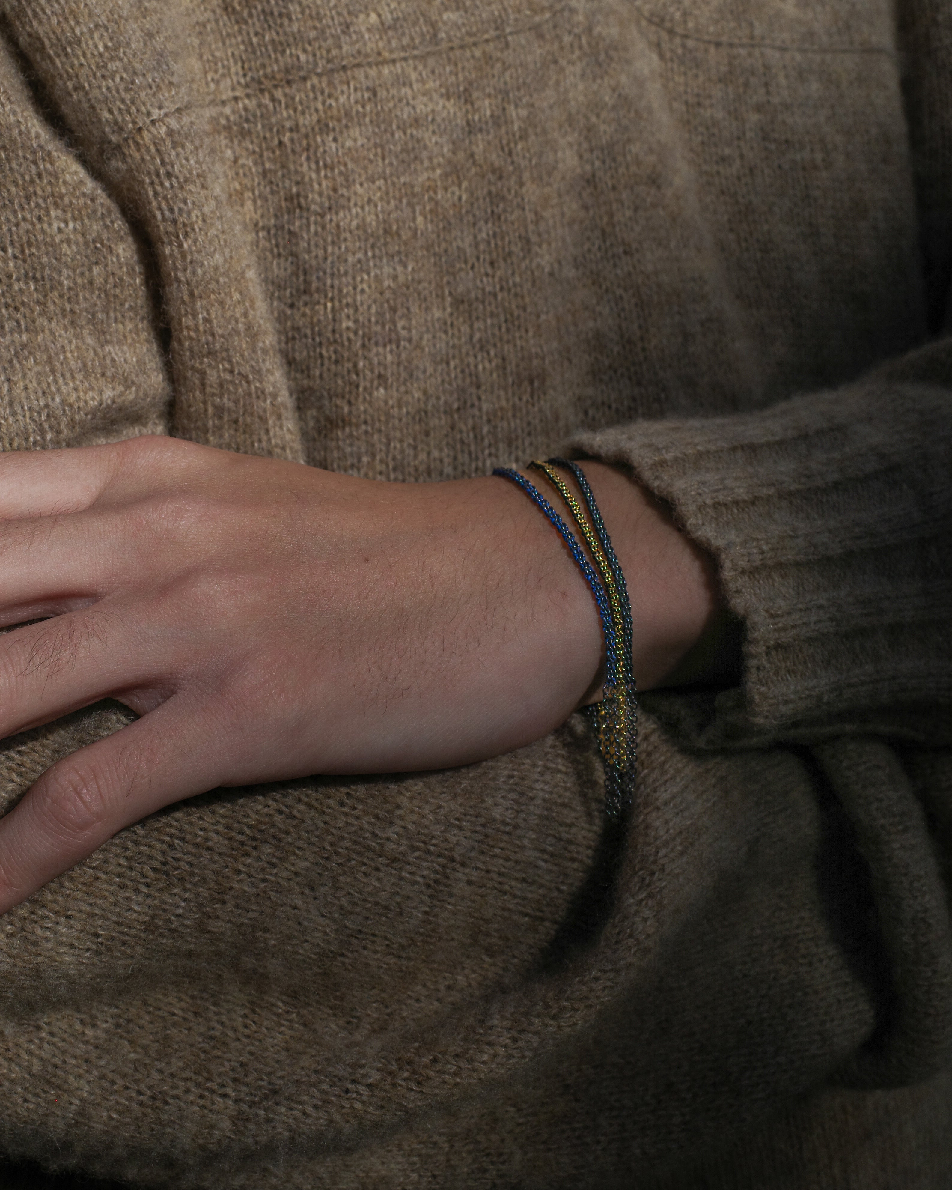 This bracelet is meticulously crafted using traditional artisanal techniques, features oxidized silver woven into deep navy silk, accented with textured yellow gold, adding an elegant radiance to the wrist.