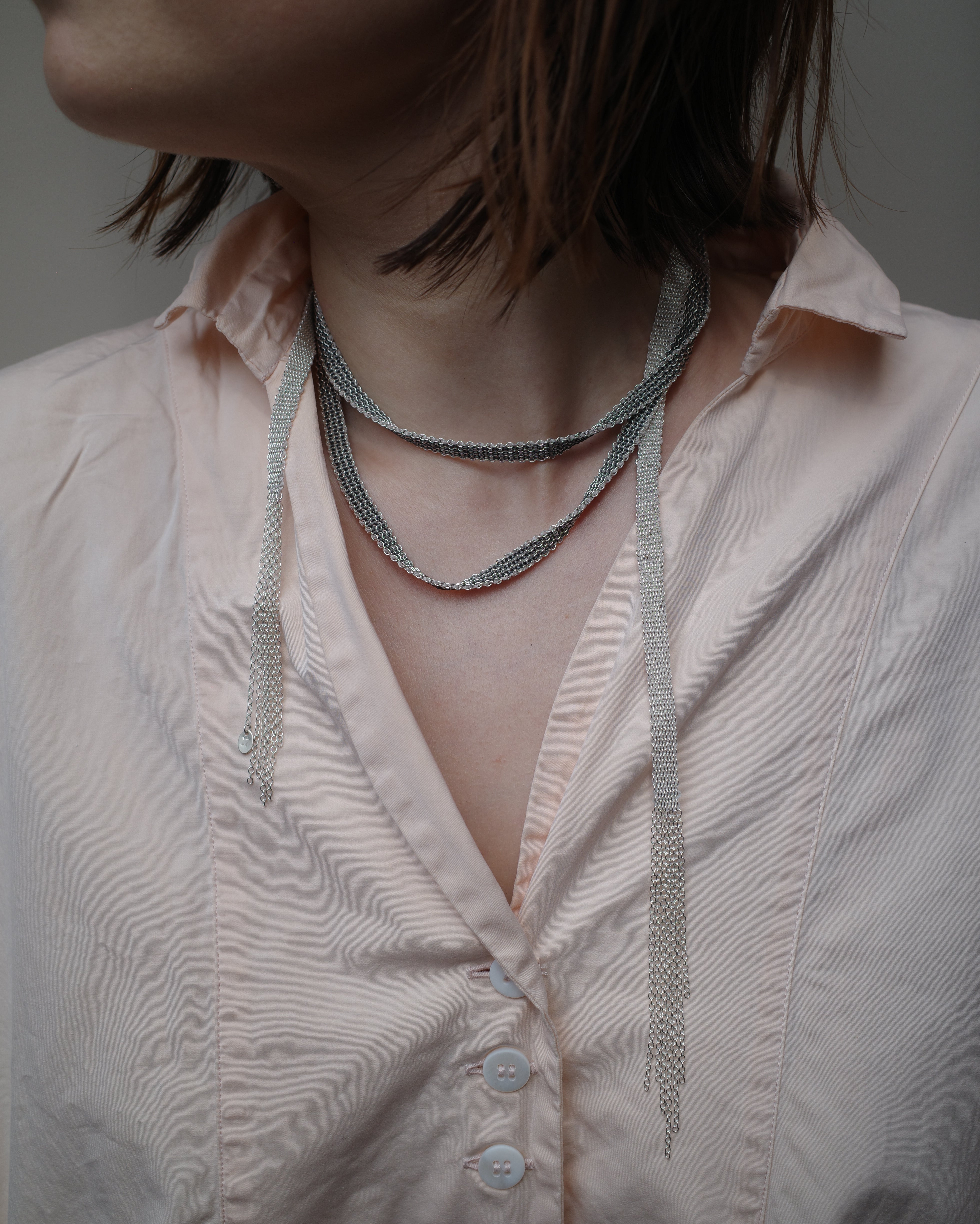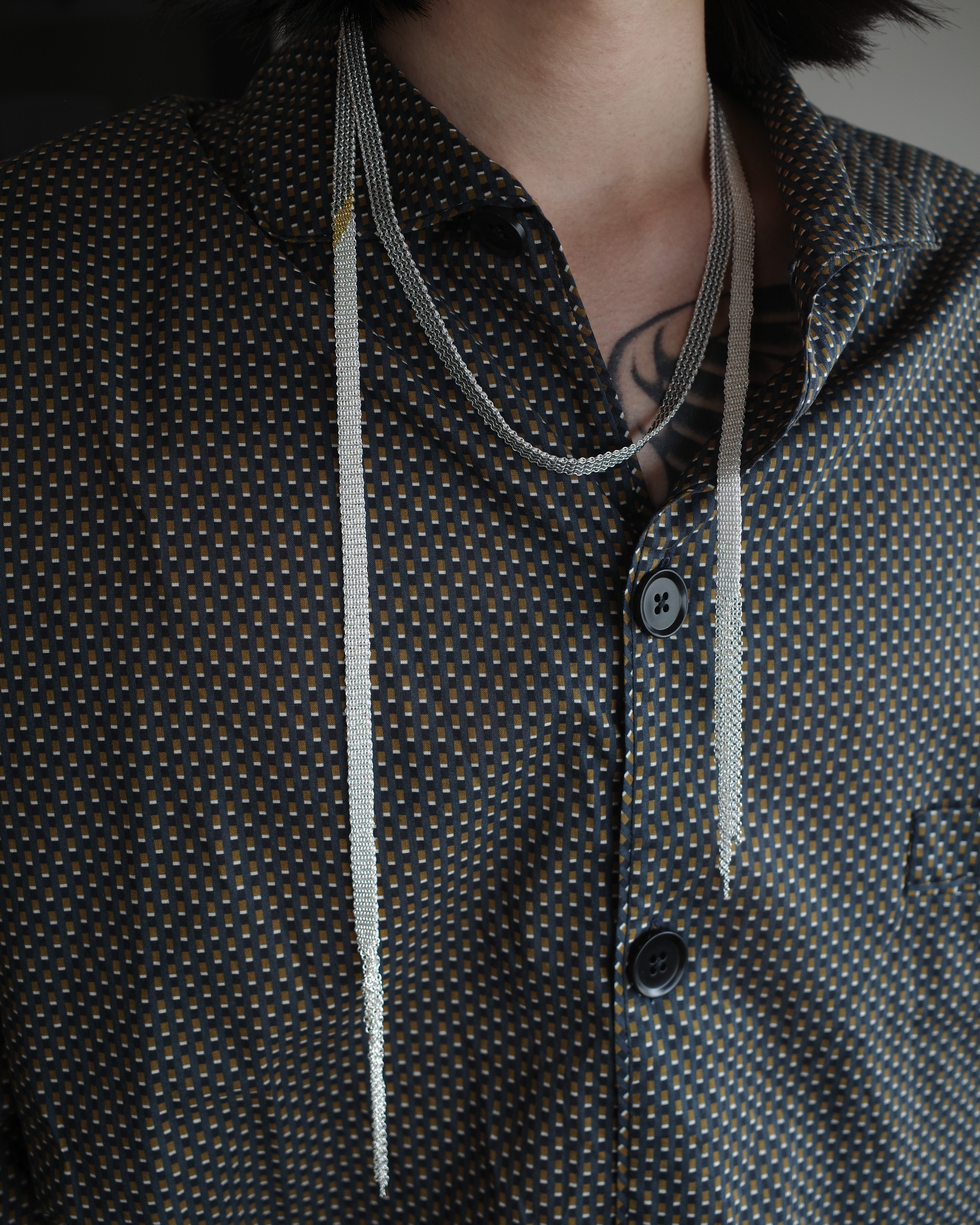 This string shawl is meticulously crafted using traditional artisanal techniques, displaying a refined shimmer and can be freely arranged.