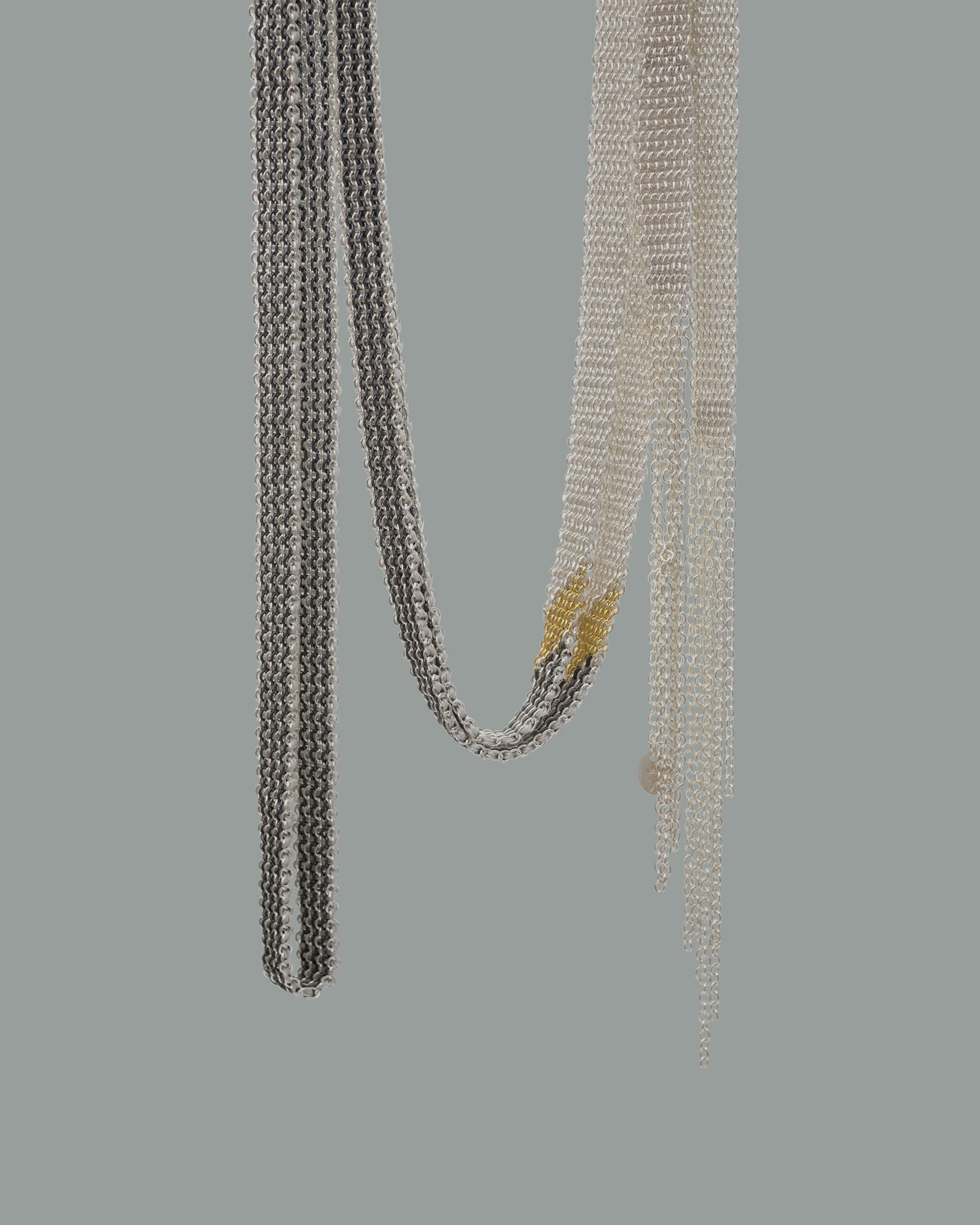 17 Stephanie Schneider brings a touch of elegance to her jewelry creations by blending luxurious textiles like mohair, silk, and linen with shimmering metals such as silver.
